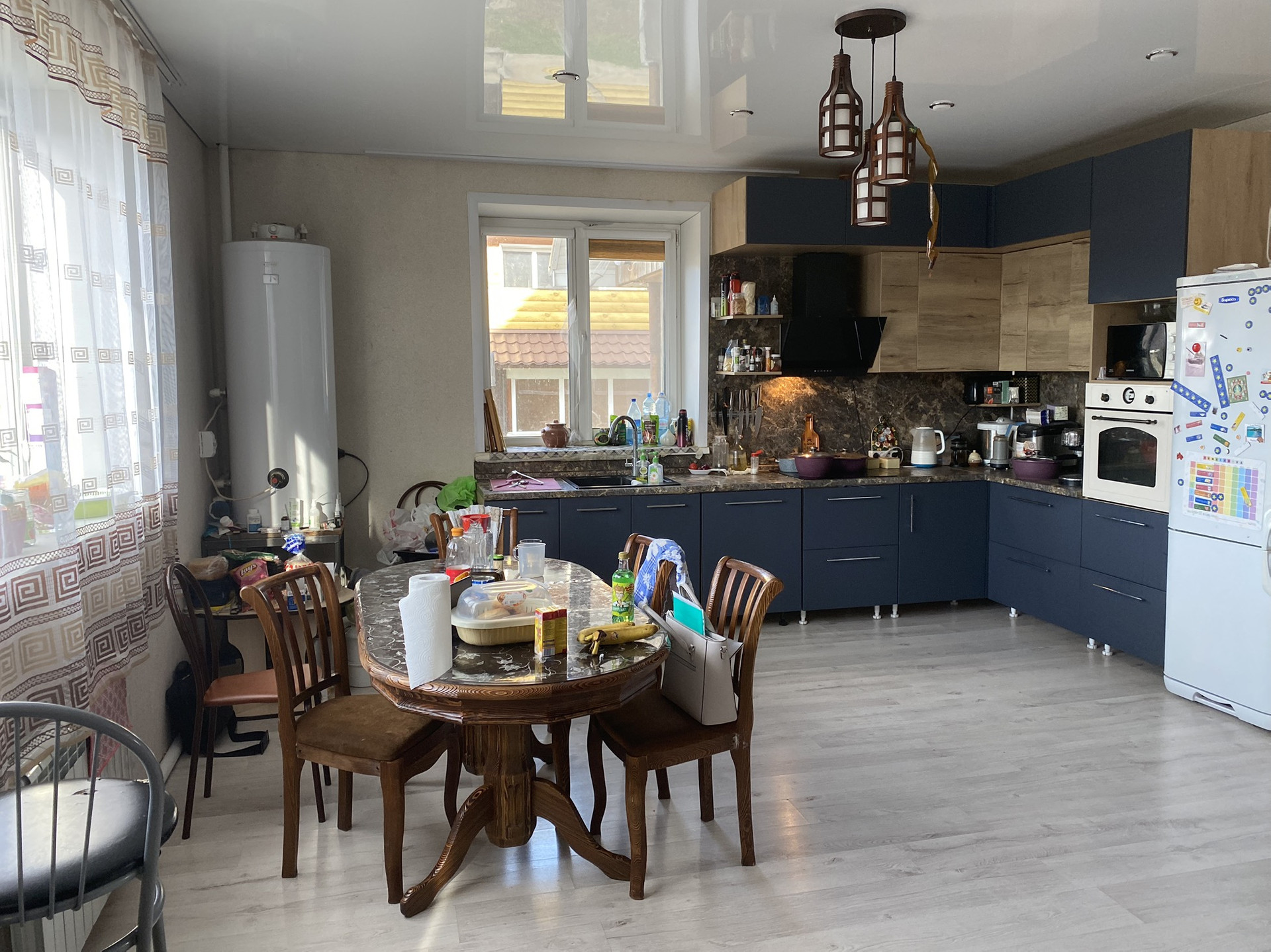 Дом теплый, изготовлен из газобетона. Отличный фундамент. Установлен новый твердотопливный котел (бункер 500л). Центральные -холодная вода и канализация. Горячая вода бойлер -200л., косвенного нагрева, зимой нагрев воды от котла. В доме 2 санузла(ванна, туалет), 4 комнаты, кухня, столовая, гостиная, 2холла, выход на террасу, остальные вопросы по телефону