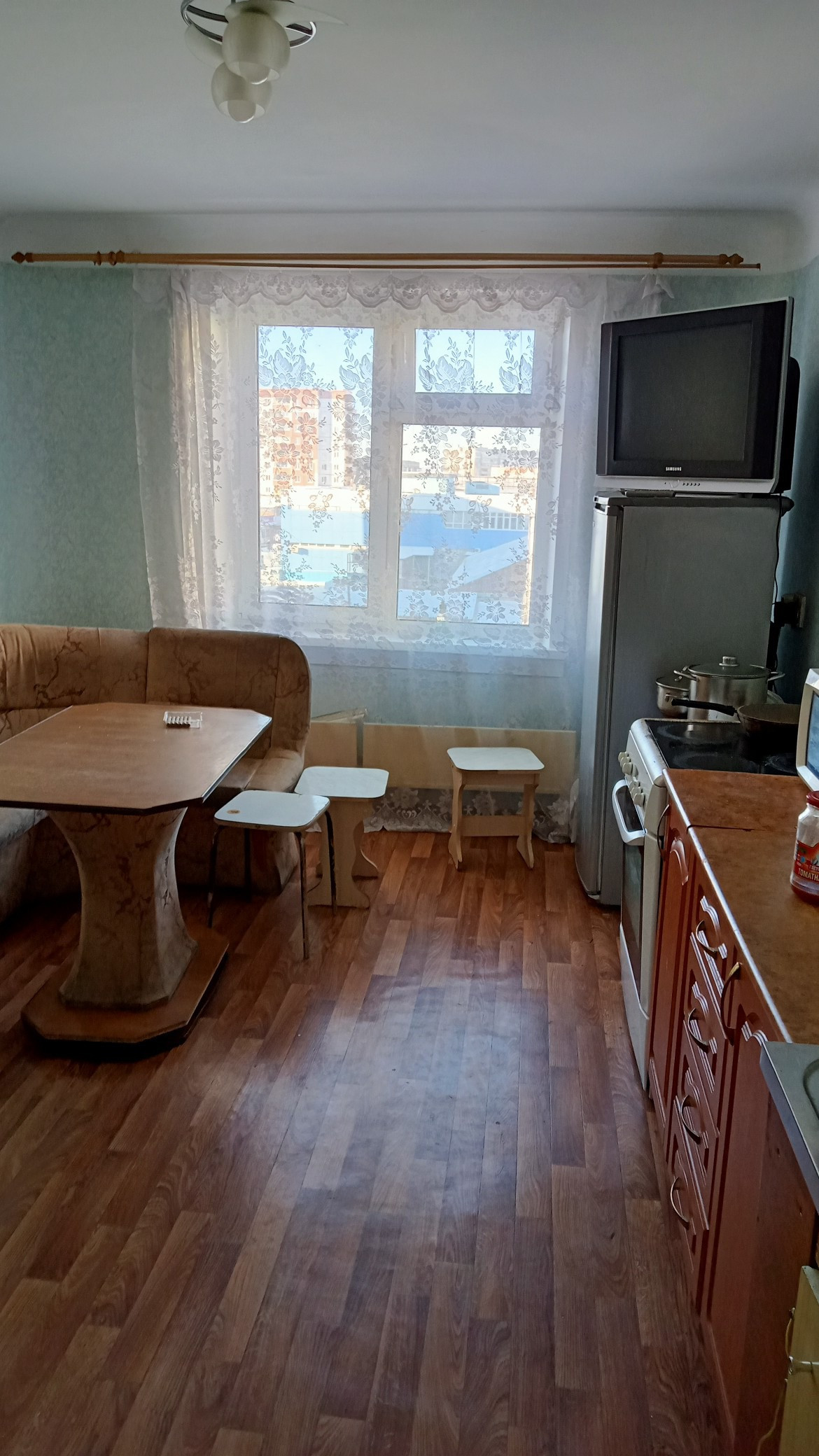 Продается очень теплая 4х комнатная квартира с большой кухней. Окна выходят во двор.  В кухне и  1 комнате установлены окна ПВХ, и на полу лежит хороший линолеум. В остальных комнатах деревянные двойные рамы, на полу линолеум. Вблизи распологаются магазины, садик, спорткомплекс, рынок, начальная школа, аптеки и т.д.  Частично останется мебель.