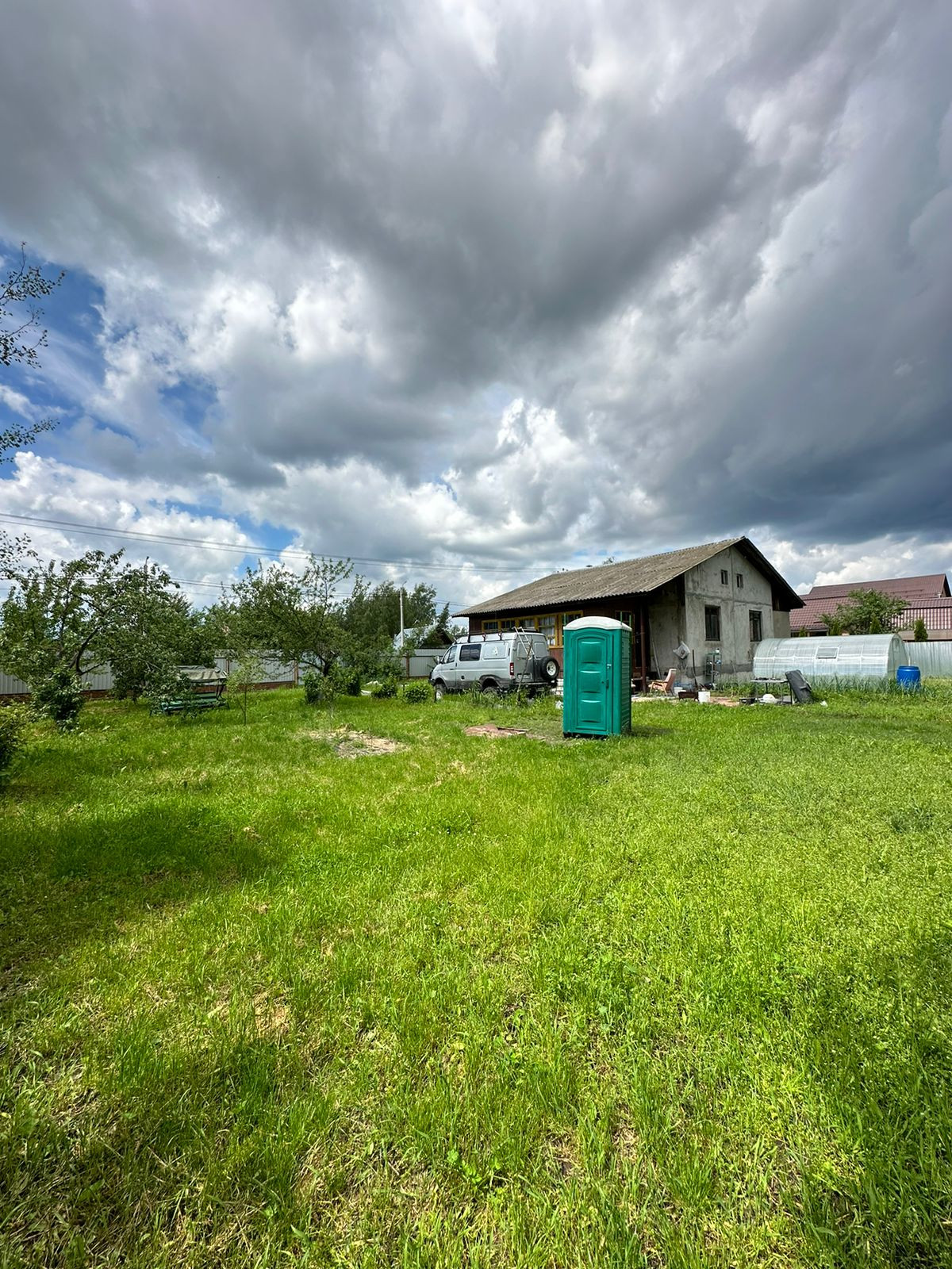 Установлена теплица.  Растут плодово-ягодные деревья.