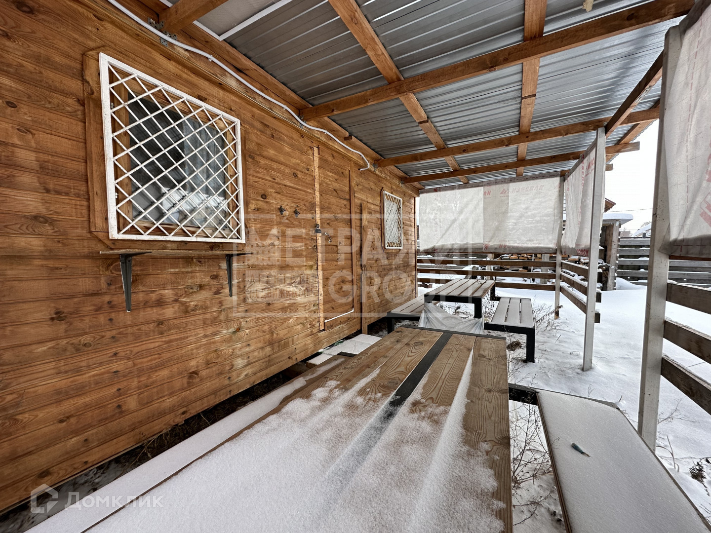 На участке стоит бытовка с навесом, столами и лавочками. Дополнительный сельский туалет. Дровенник, мангальная зона.