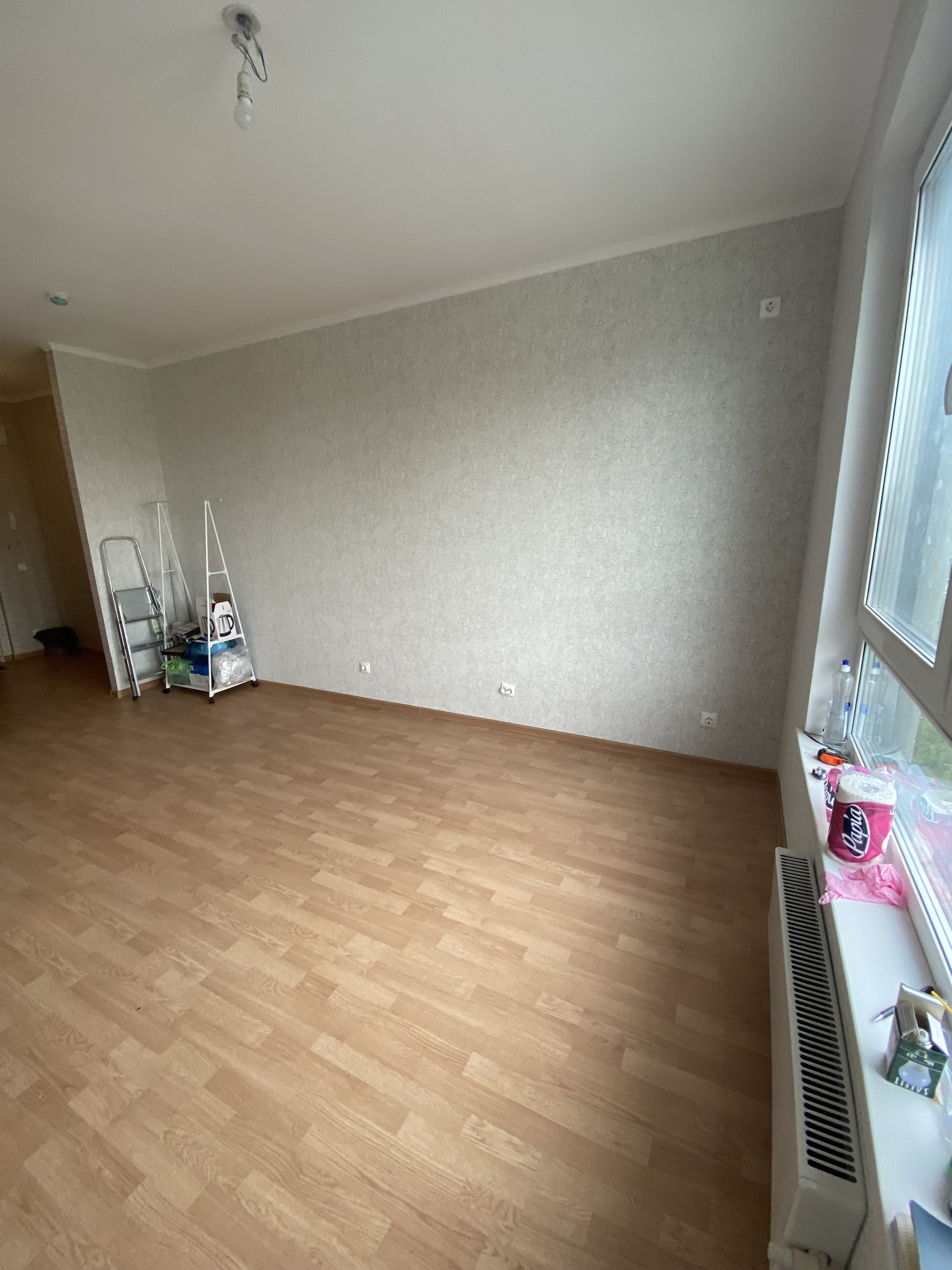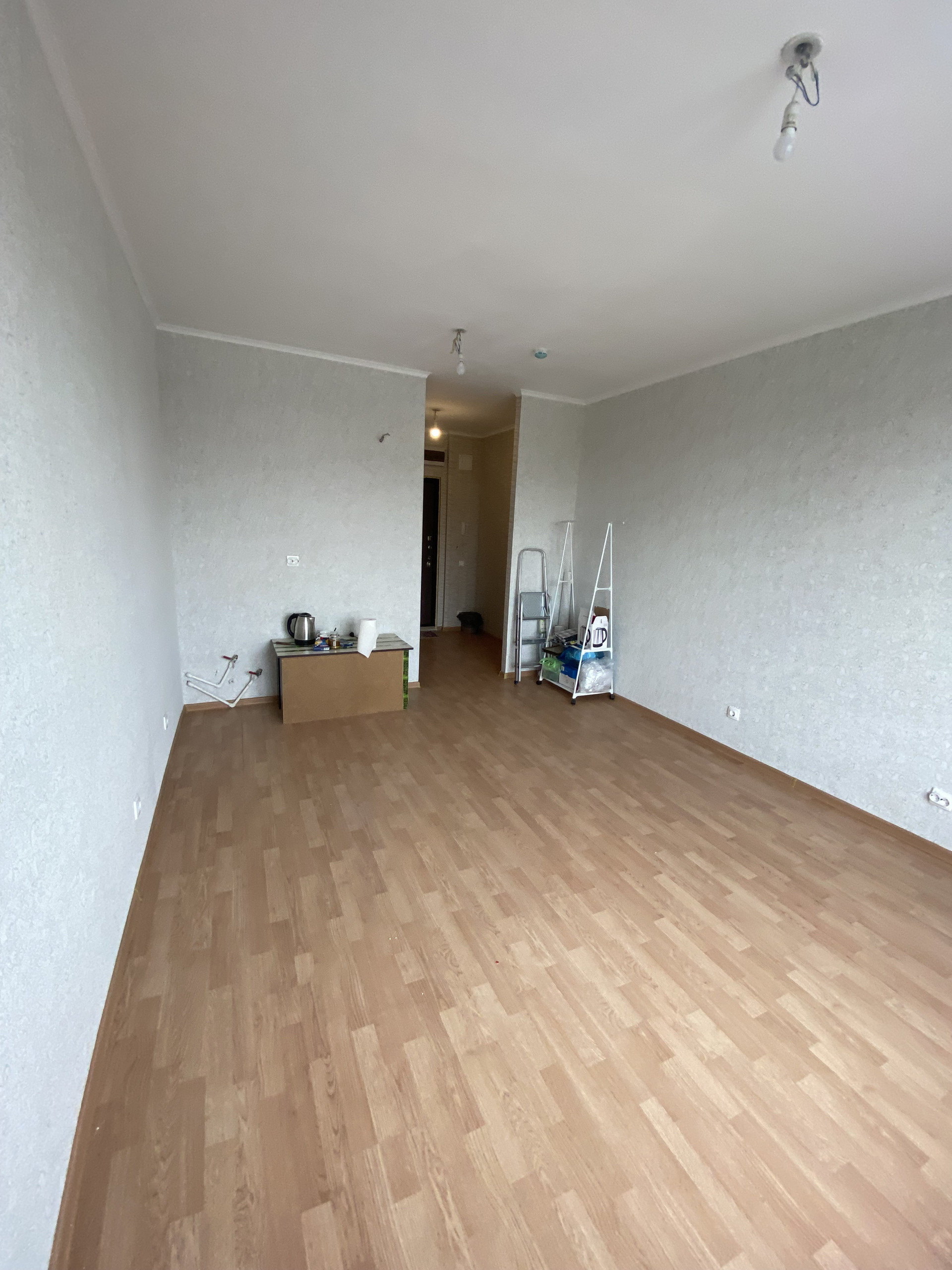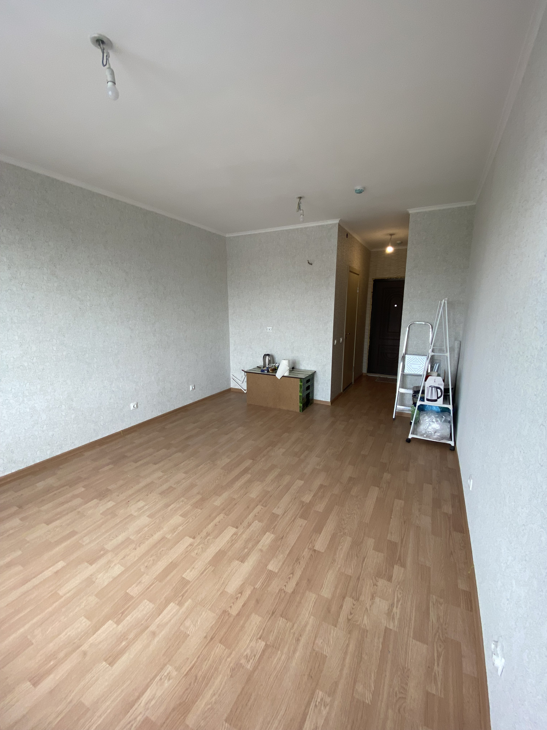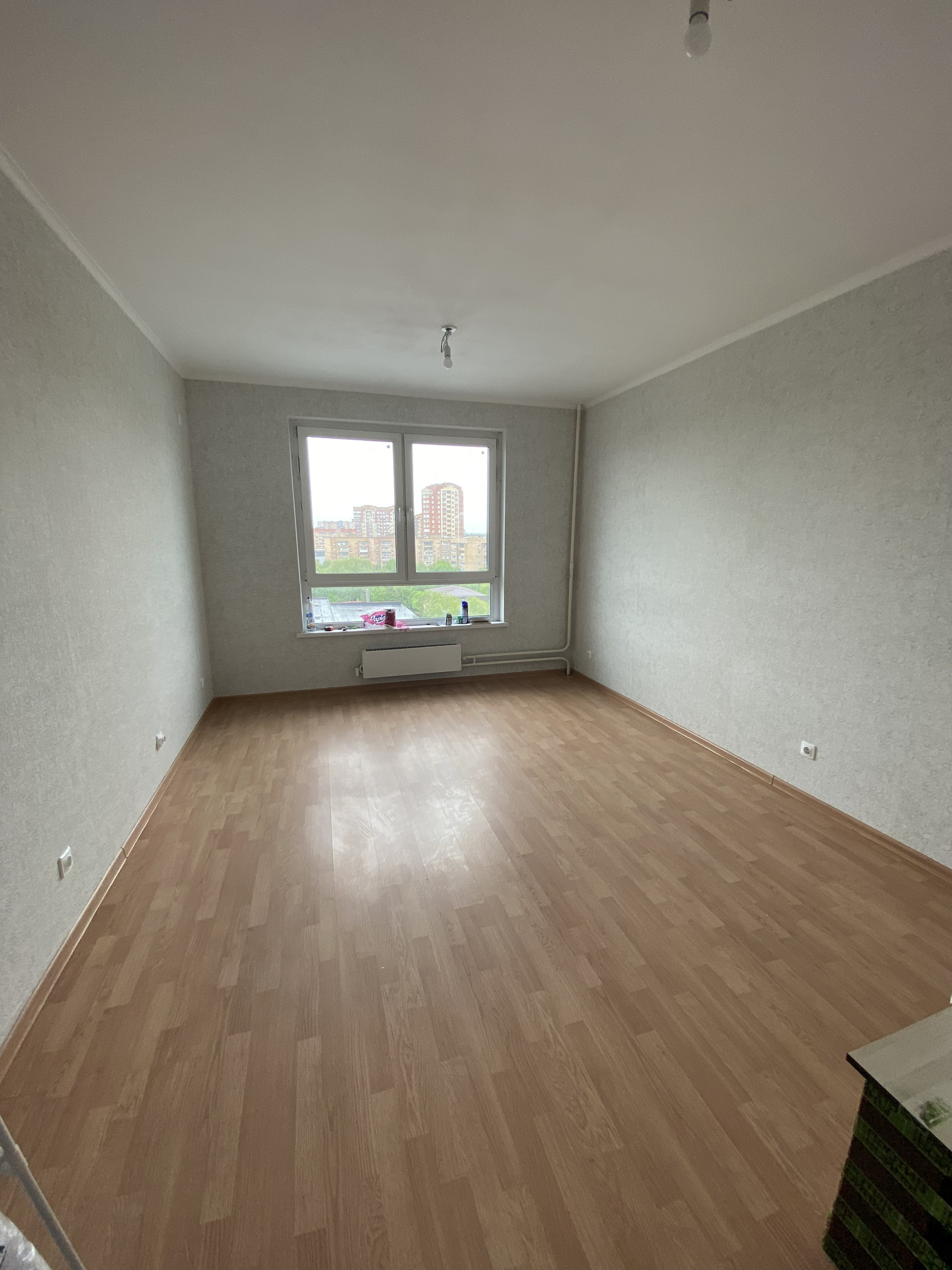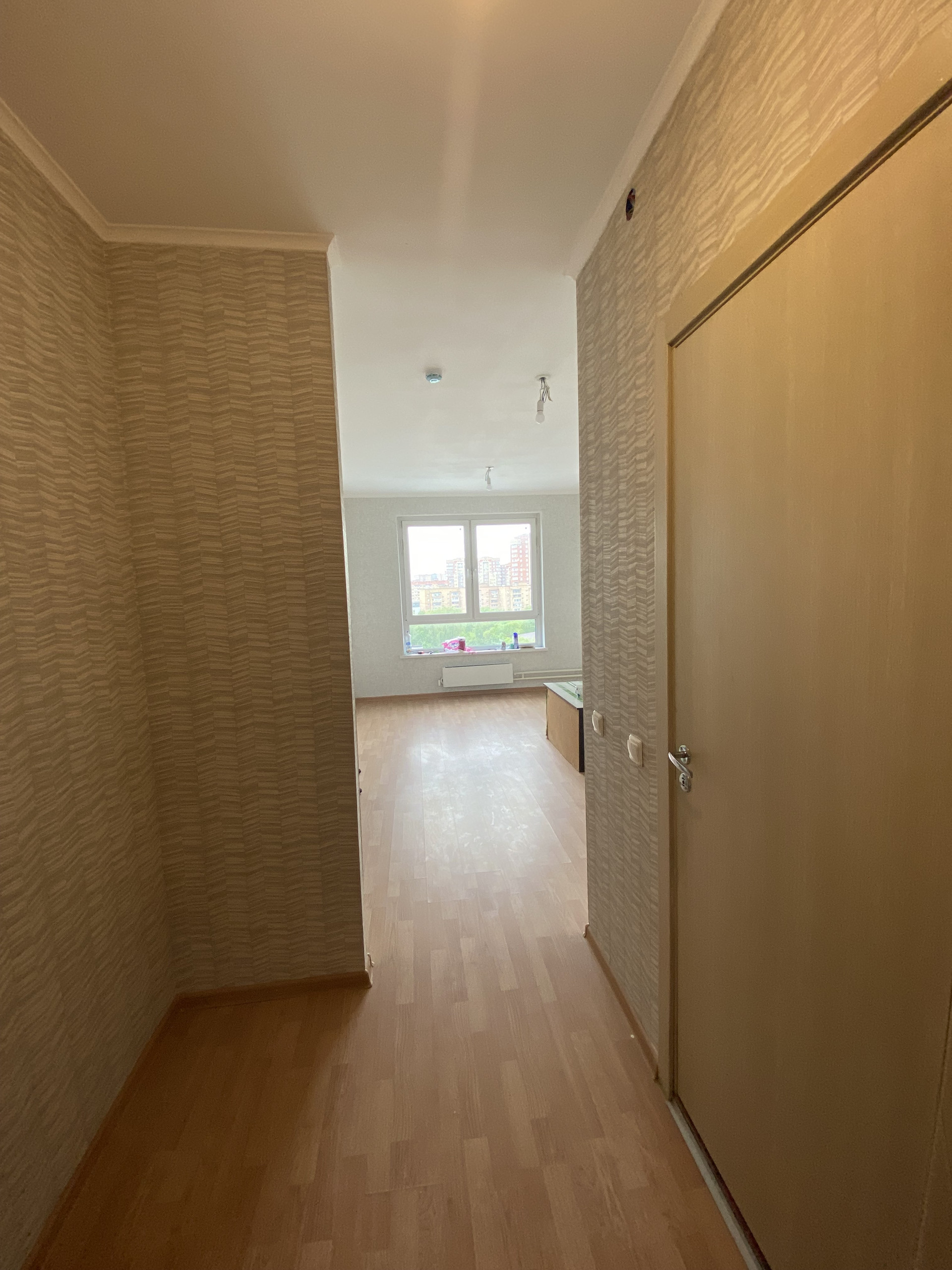 Студия 23 квадрата, продаётся с ремонтом от застройщика. На стенах обои, на полу ламинат, санузел совмещён в плитке. Входная дверь установлена новая, металлическая. При входе слева ниша для установки большого шкафа или гардероба. В комнате справа, место для кухонного гарнитура, сделаны выводы под раковину, электрический вывод для плиты и для вытяжки. комната широкая и просторная, при грамотном подходе, можно сделать конфетку. Установлен домофон, грамотно сделана разводка электрики. В комнате очень светло, установлено большое пластиковое окно. Вид на город, вечером очень красиво.