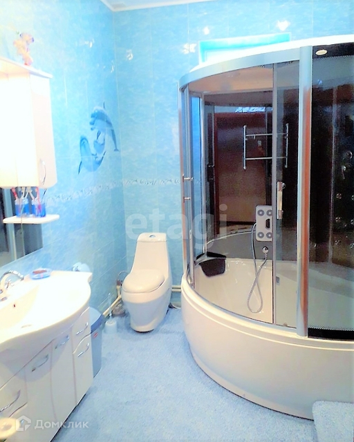 Высота потолков 3 и 3,2 метра. На каждом этаже расположен отдельный сан.узел. Ванная-джакузи на 1-м этаже и душевая кабина с функцией тропический душ (размер кабины 150х150) на 2-м этаже.