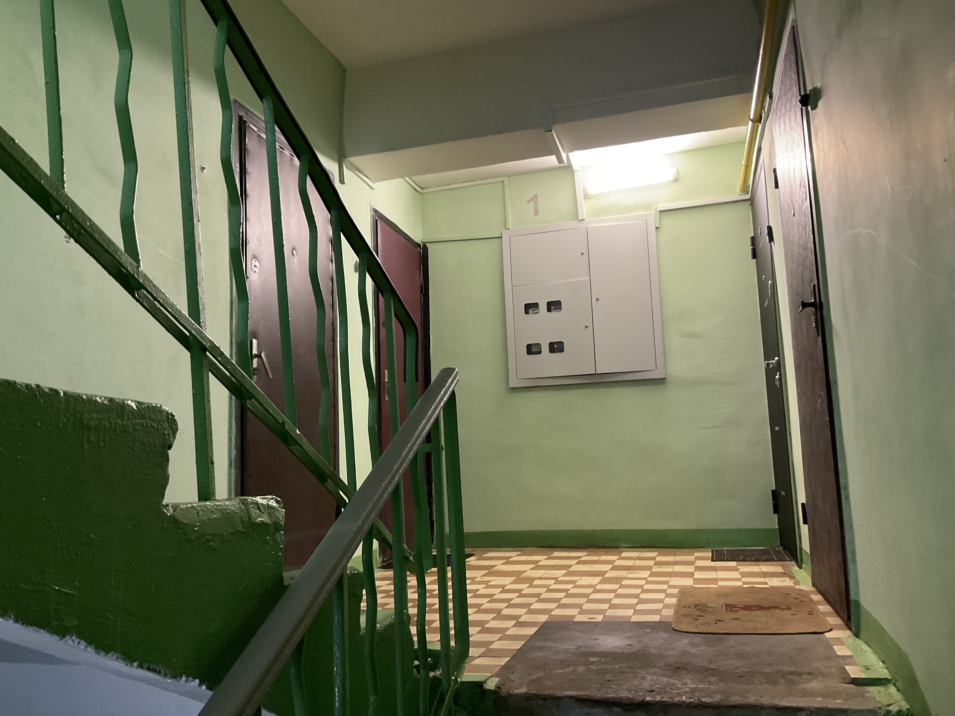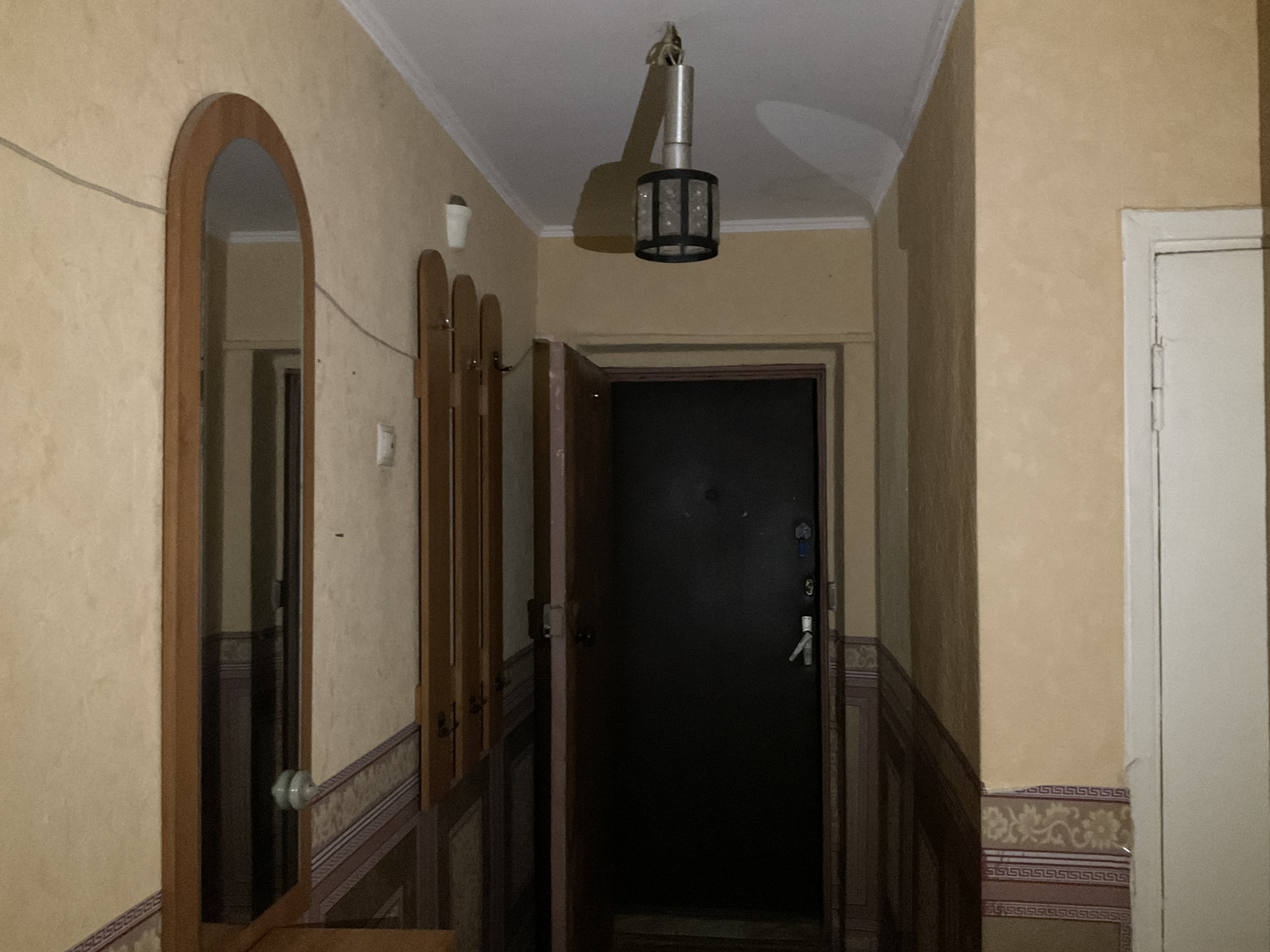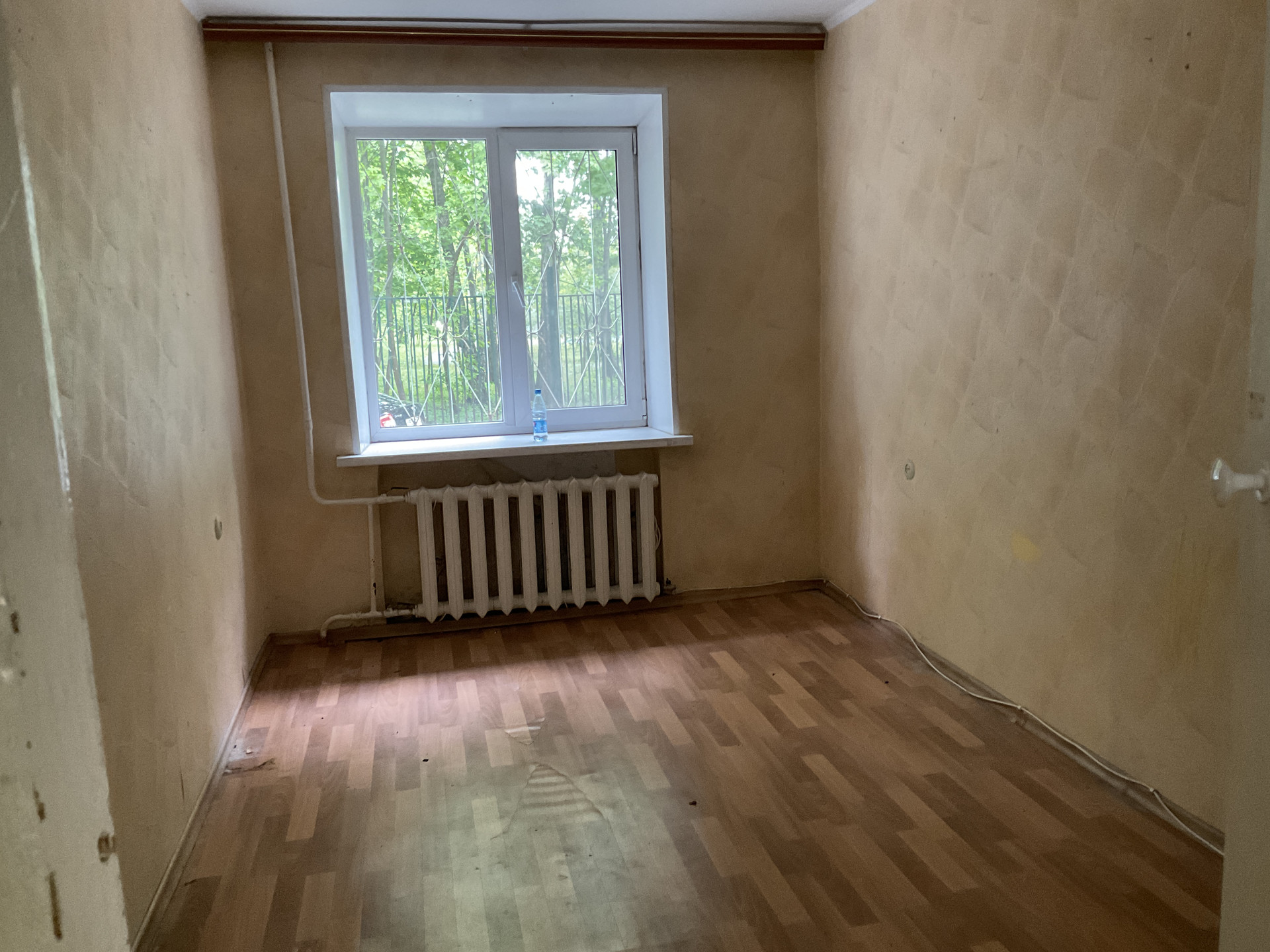 Окна пластиковые с распашными решетками, выходят во двор. На стенах обои, на полу линолеум, потолок побелен. В студию заведены коммуникации - вода, канализация, электричество, вентиляция, на горячую воду установлен новый бойлер.