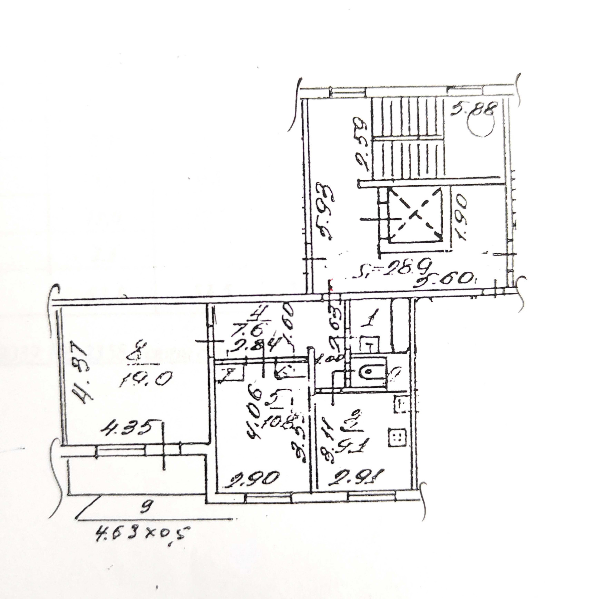 Кухня 9.1 кв.м, комнаты 19 и 12 кв.м. Фактически стены между коридором и маленькой комнатой нет.