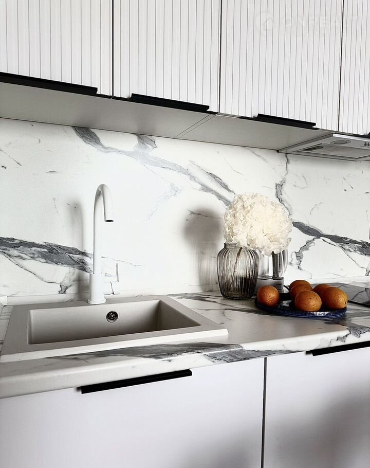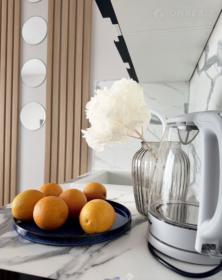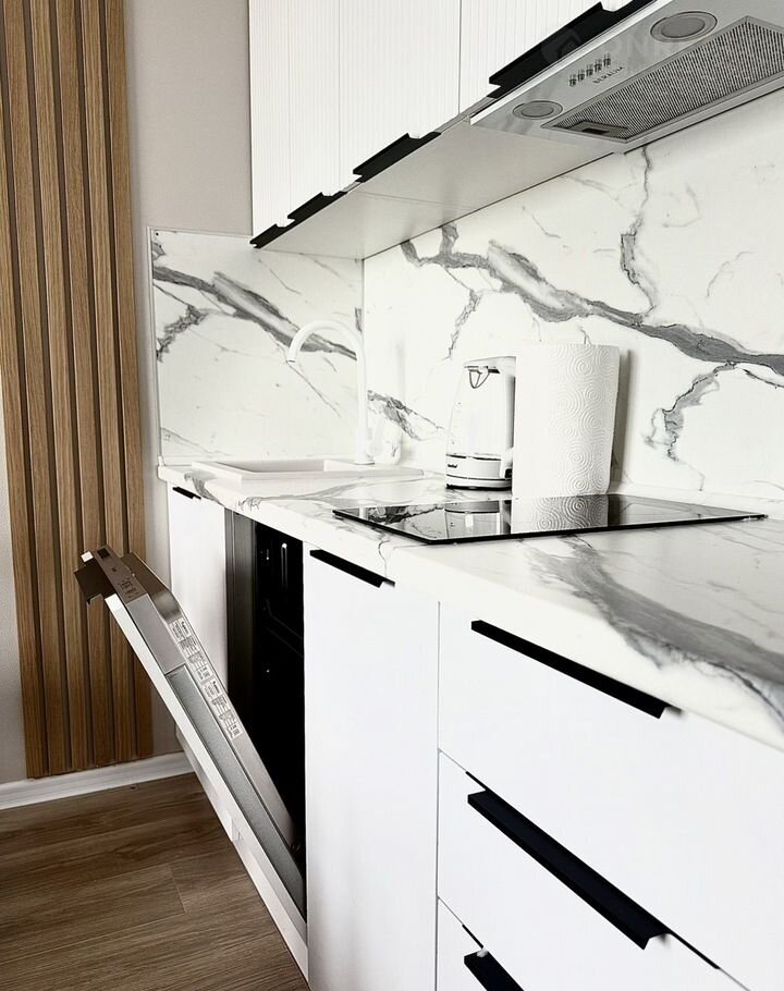 - Кухня-гостинаяс полным набором техники: посудомойка, духовка, индукционная панель, микроволновка, холодильник, вытяжка.