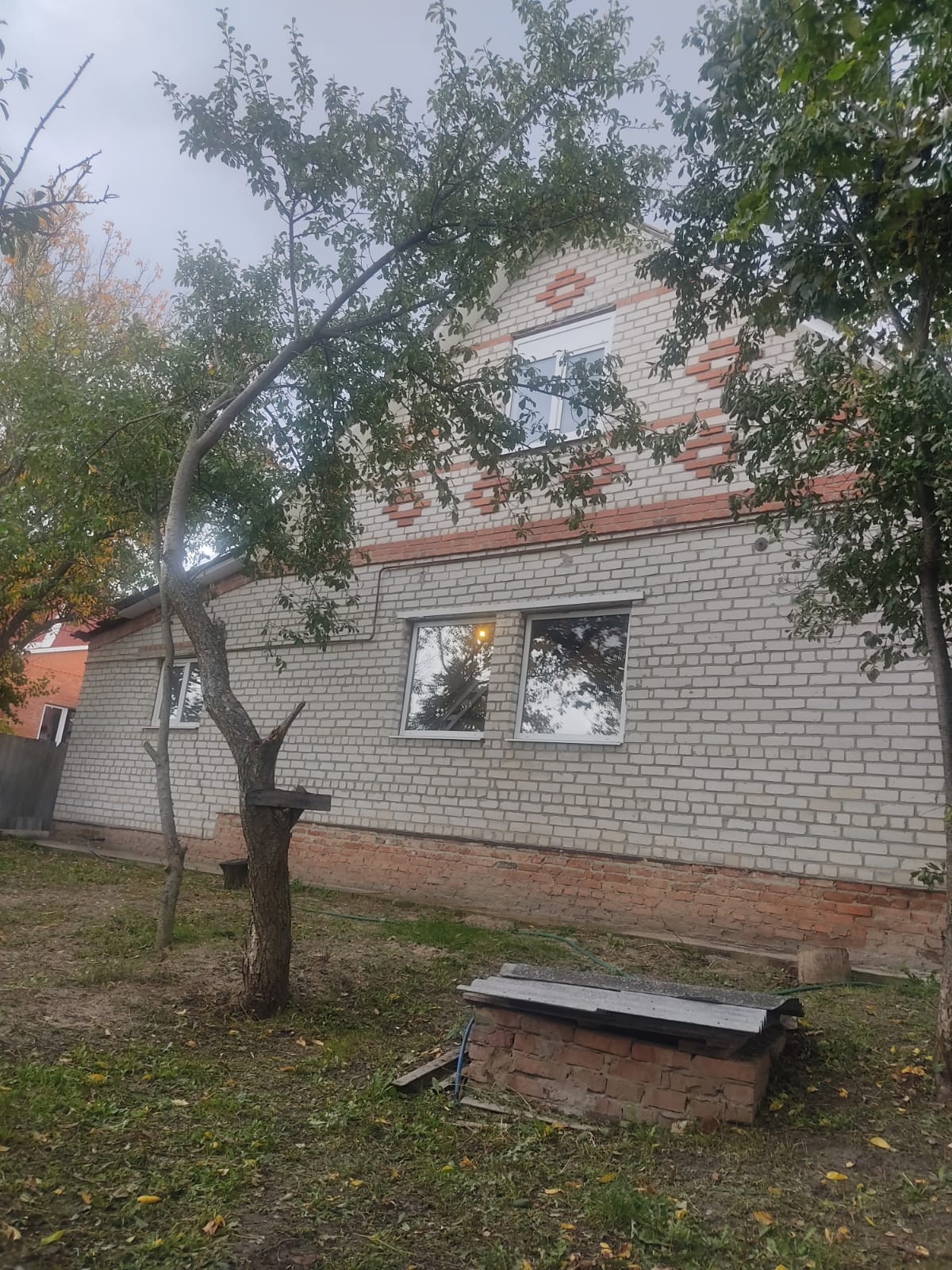 Кирпичный двухэтажный дом строился для себя, с высоким цоколем, толстыми стенами и просторными комнатами рациональной планировки.