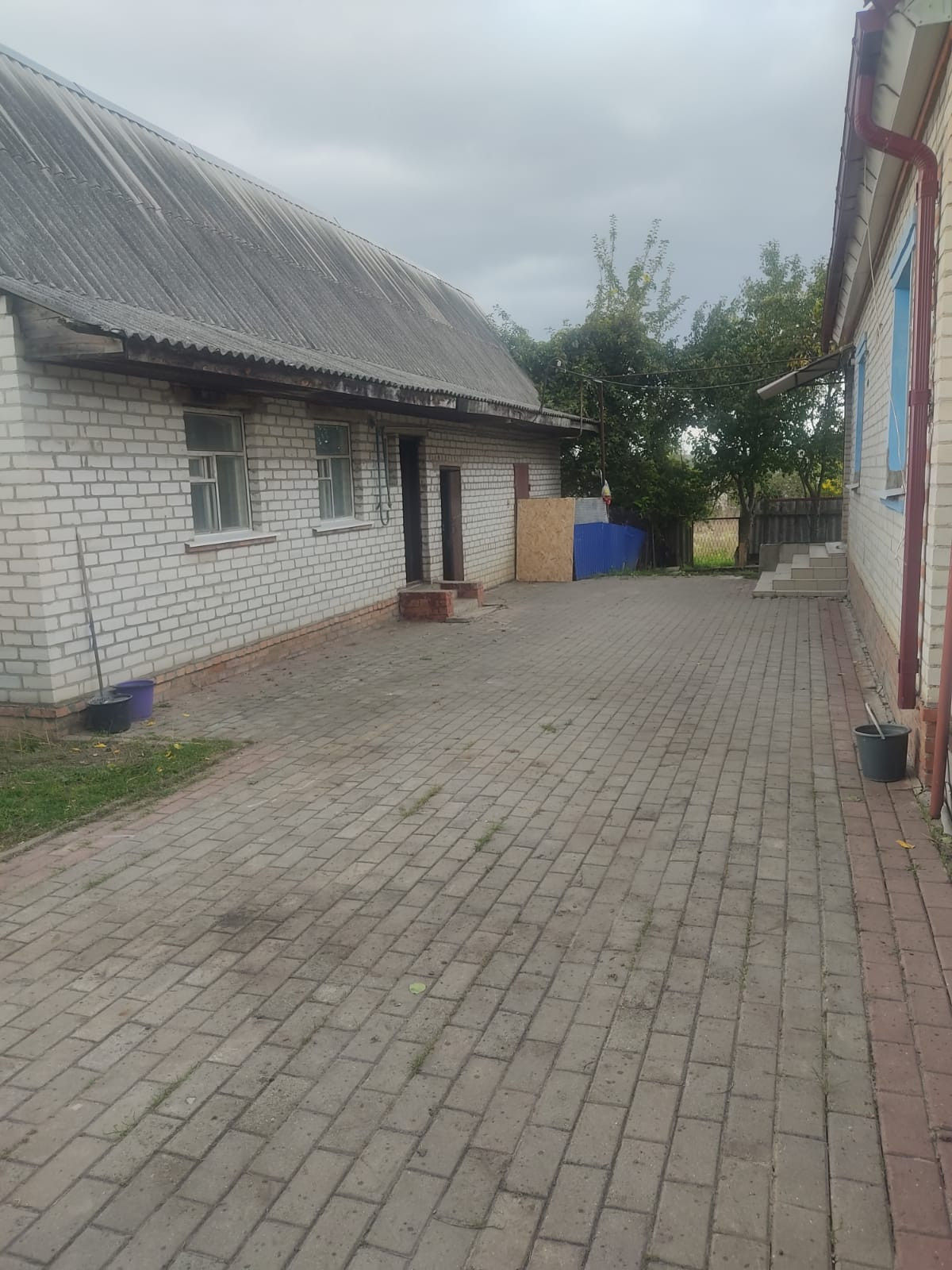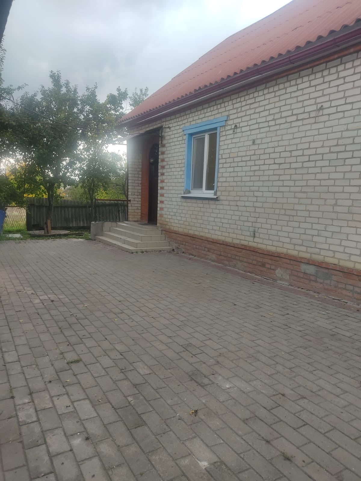 Во дворе уложена плитка, участок полностью огорожен по всему периметру современным забором.