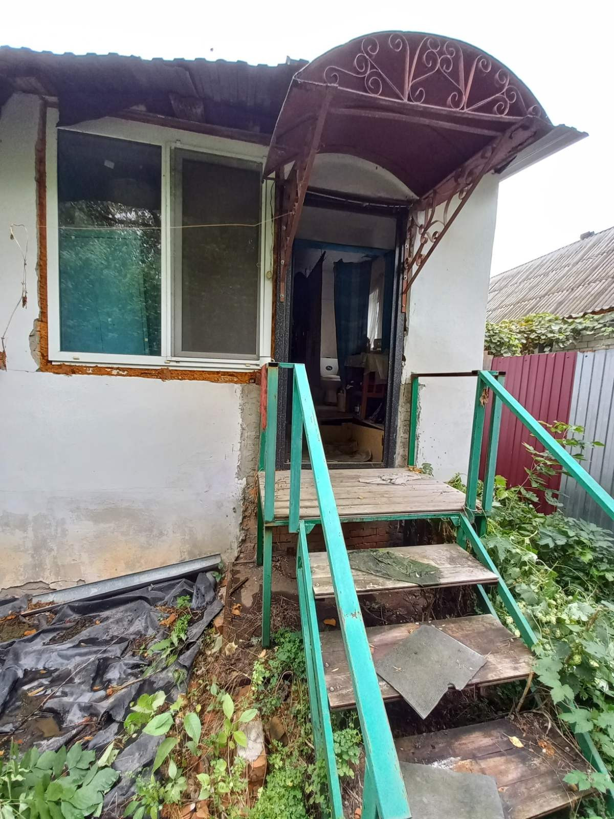 На участке растет виноград и плодоносящие деревья (груши, яблони) и кустарники.