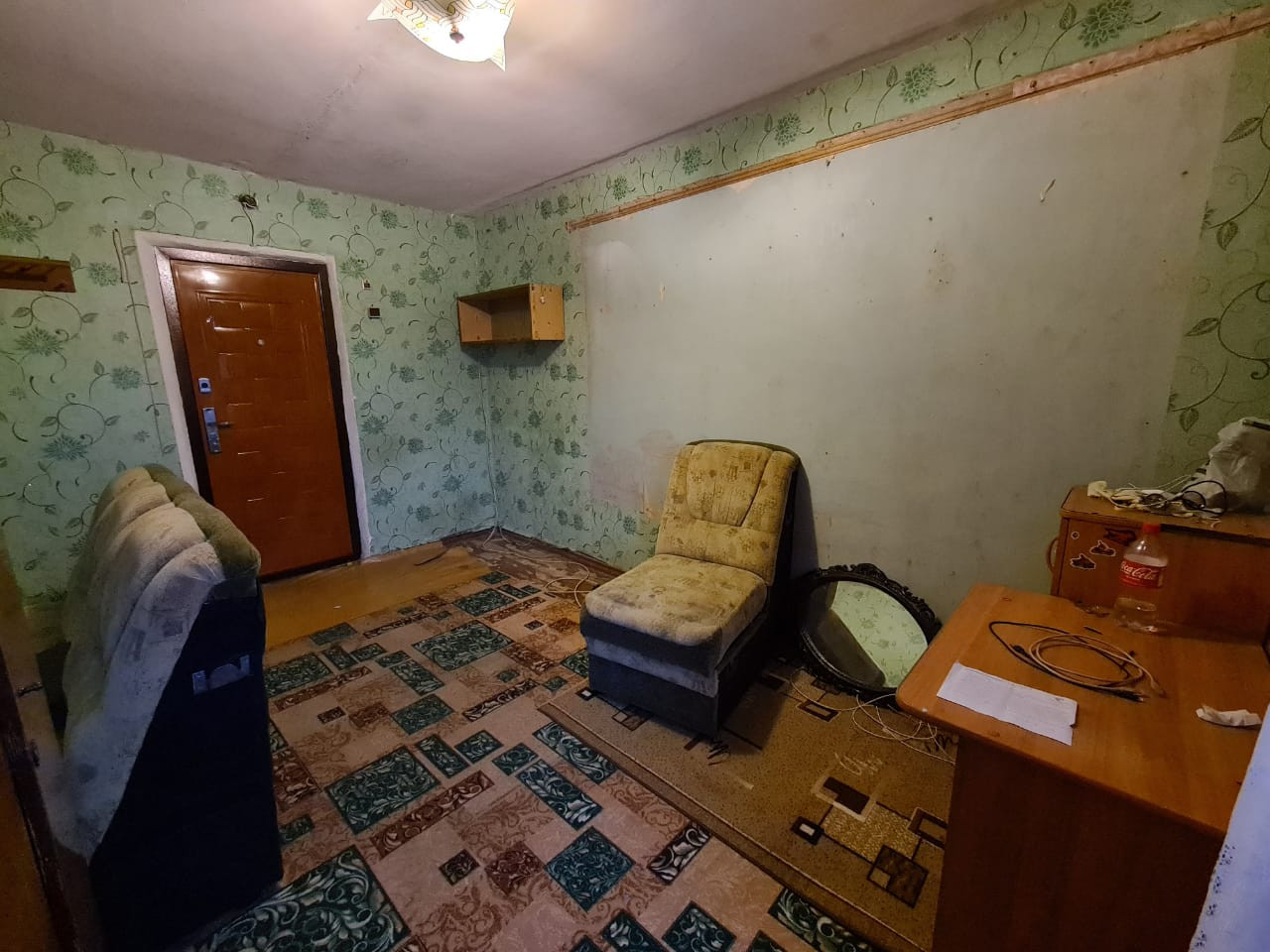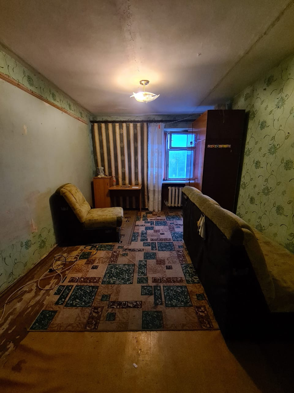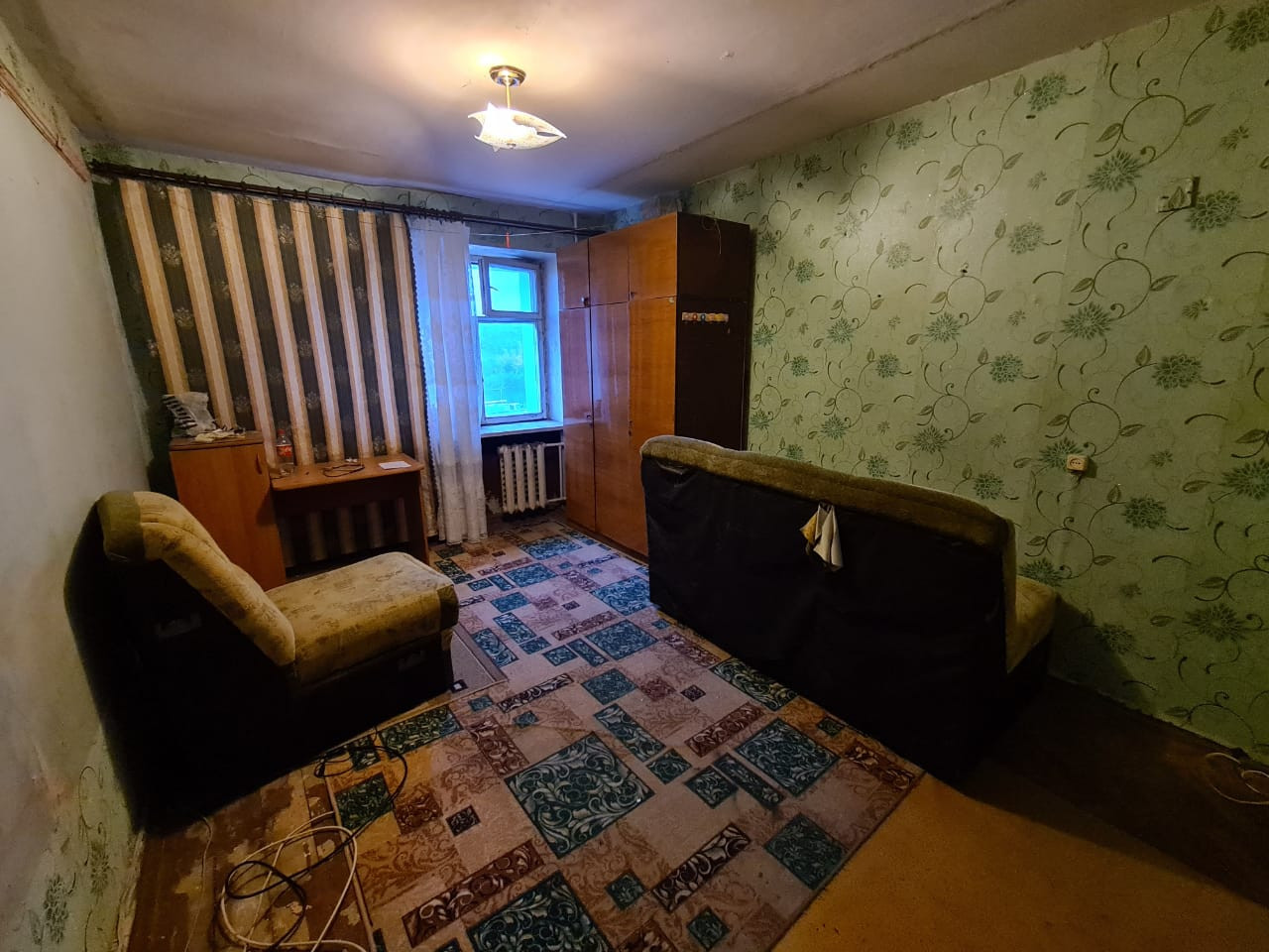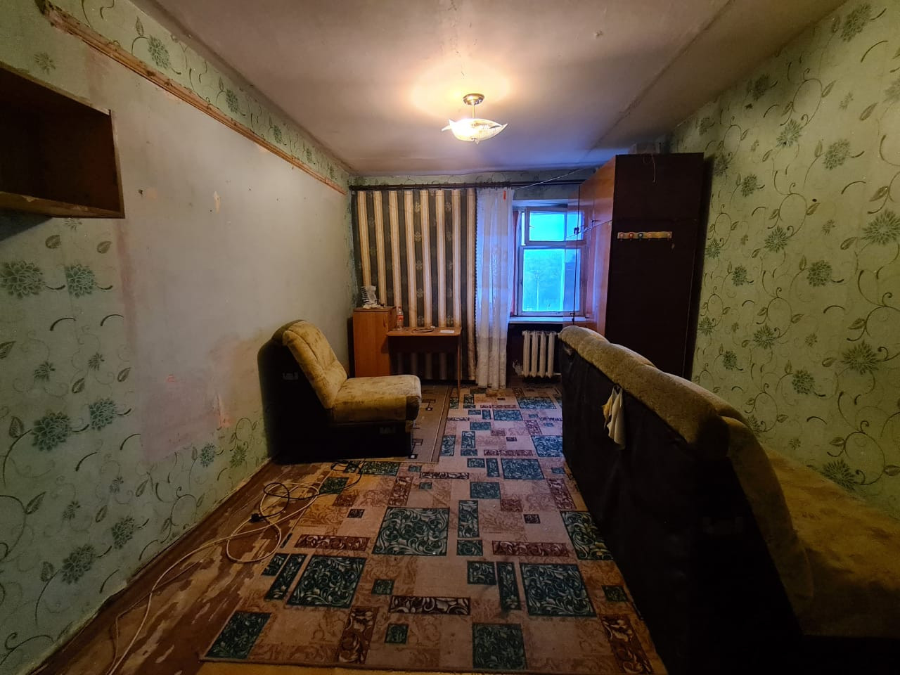 В комнате сделан косметический ремонт, но требуются небольшие вложения: окна дерево, на полу линолеум, стены и потолки выровнены.