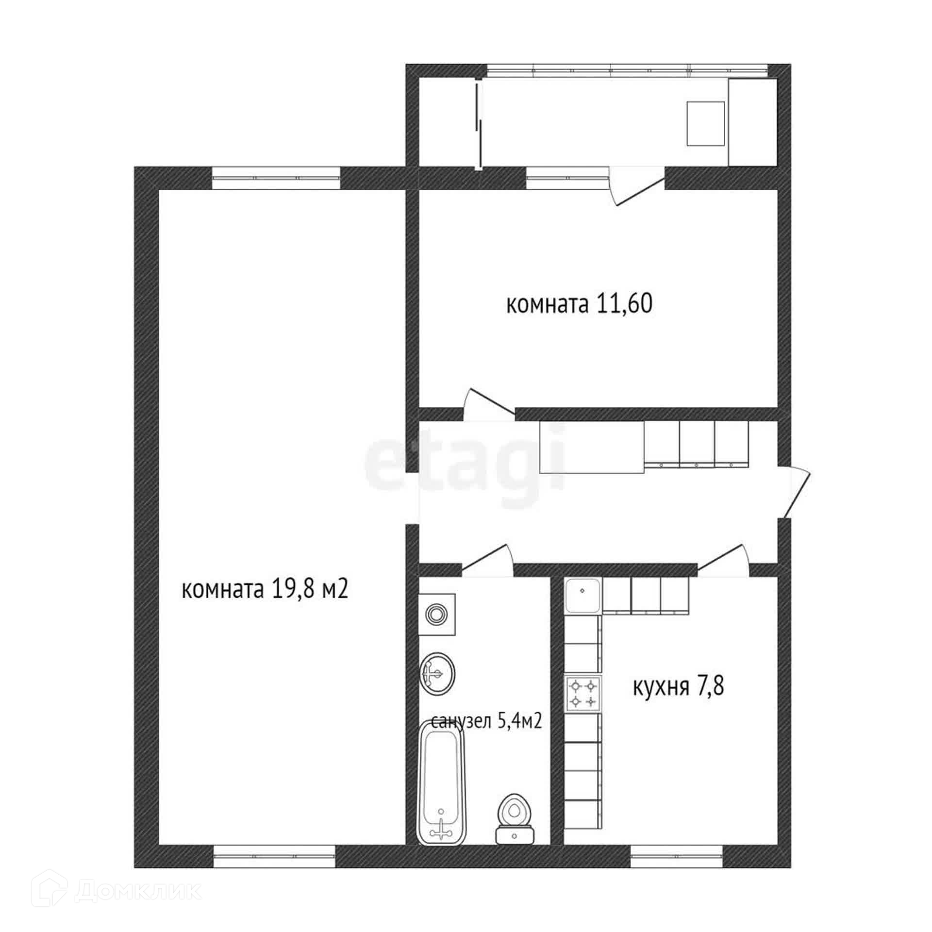 Планировка в квартире комфортная. Две изолированных комнаты. Первая 11,8м2 с выходом на теплую лоджию 7 м2. Вторая комната просторная распашонка 19,6м2, которую отлично можно зонировать на две части, тк комната с двумя окнами на разные стороны дома. Кухня 7,8м2 , совмещенный санузел 5,4м2 и прихожая.