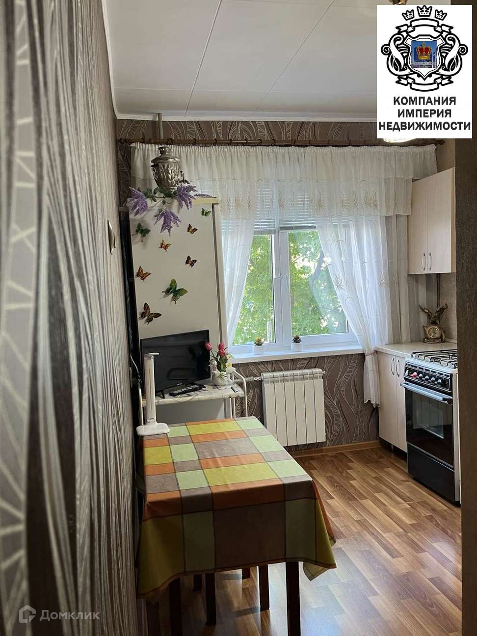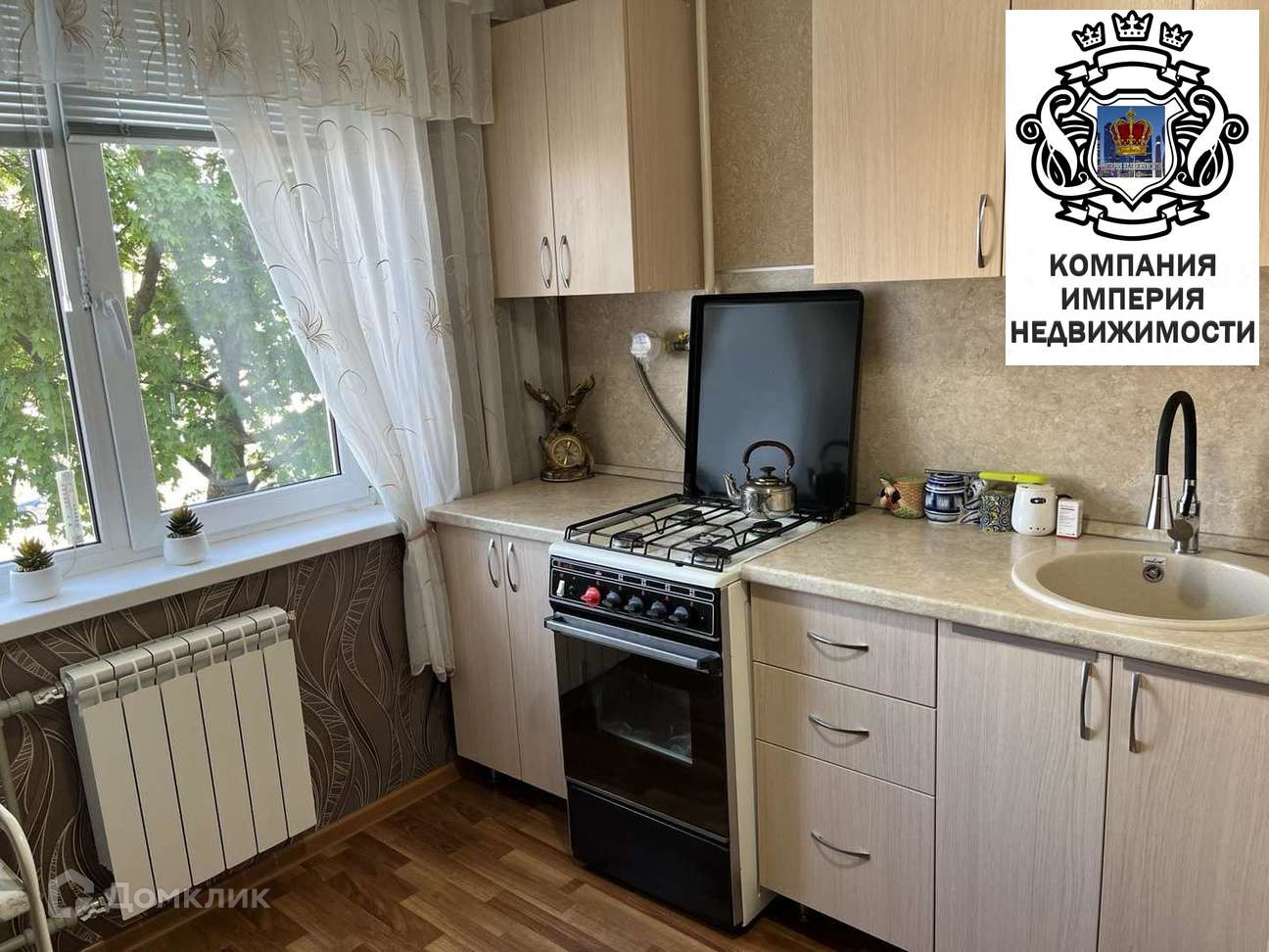 - Встроенная кухня- в светлых тонах, так же остается будущим покупателям,( на полу ламинат, современные радиаторы)