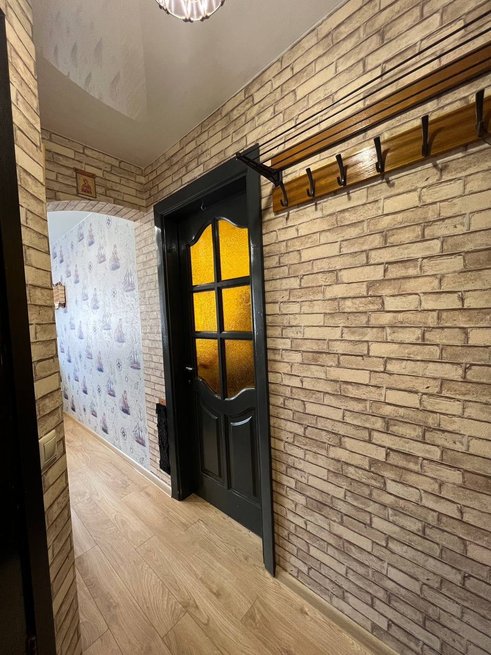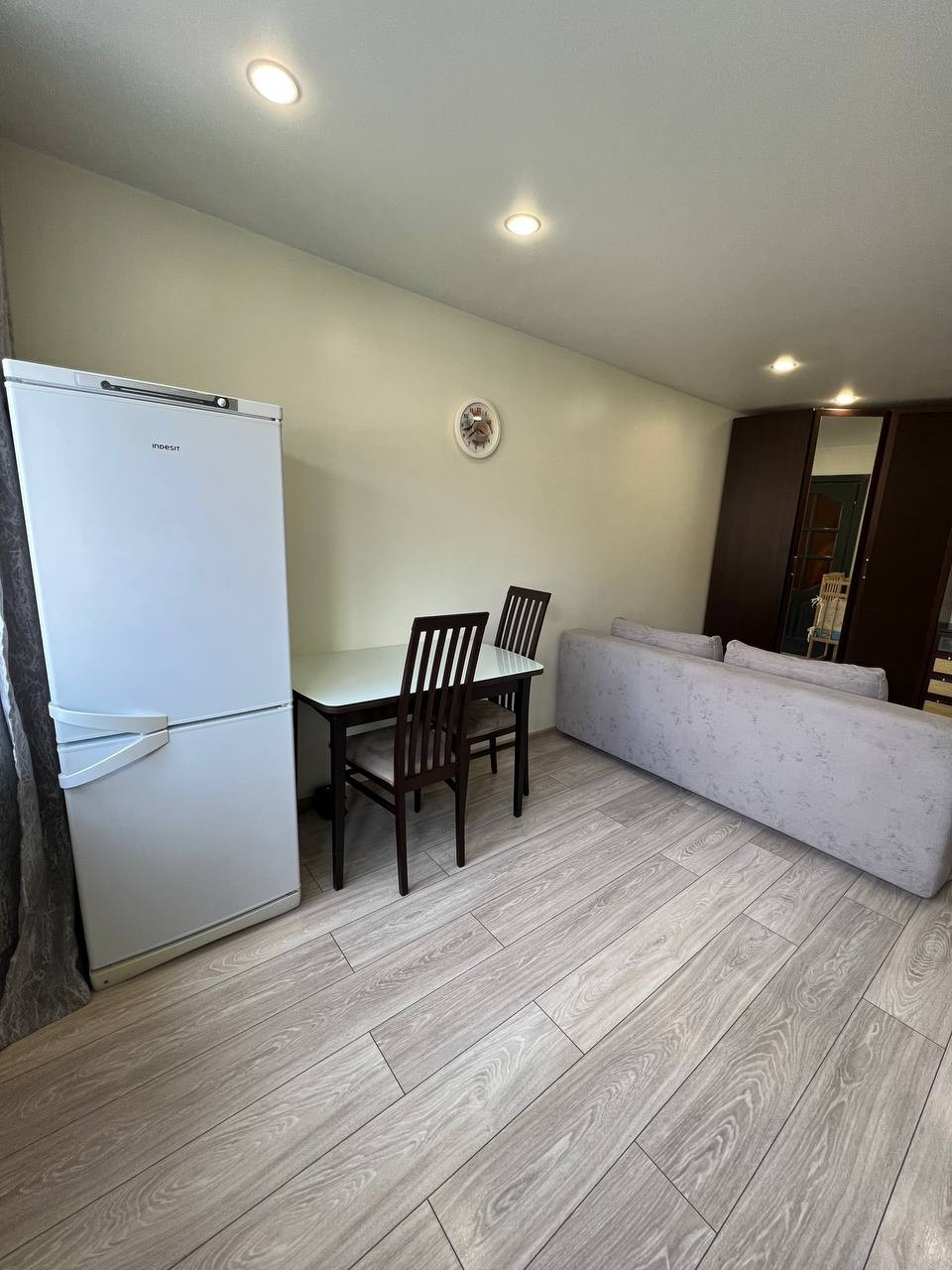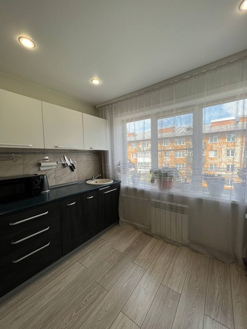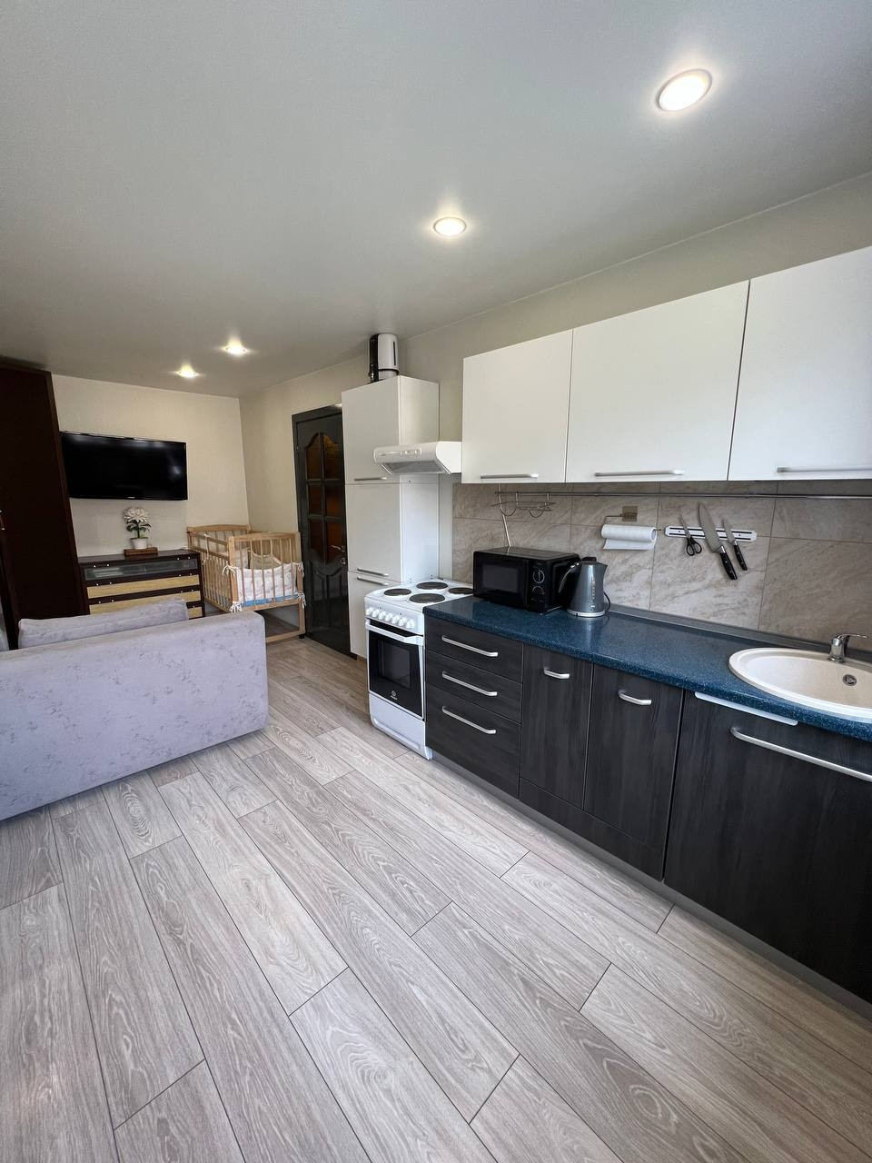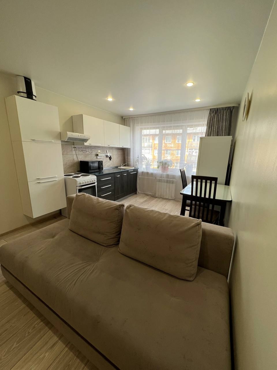 В квартире выполнен красивый ремонт по дизайнерскому проекту в выдержанных тонах. На полу качественный ламинат, с/у кафель. Планировка квартиры выполнена очень удобна кухня студия и спальня.