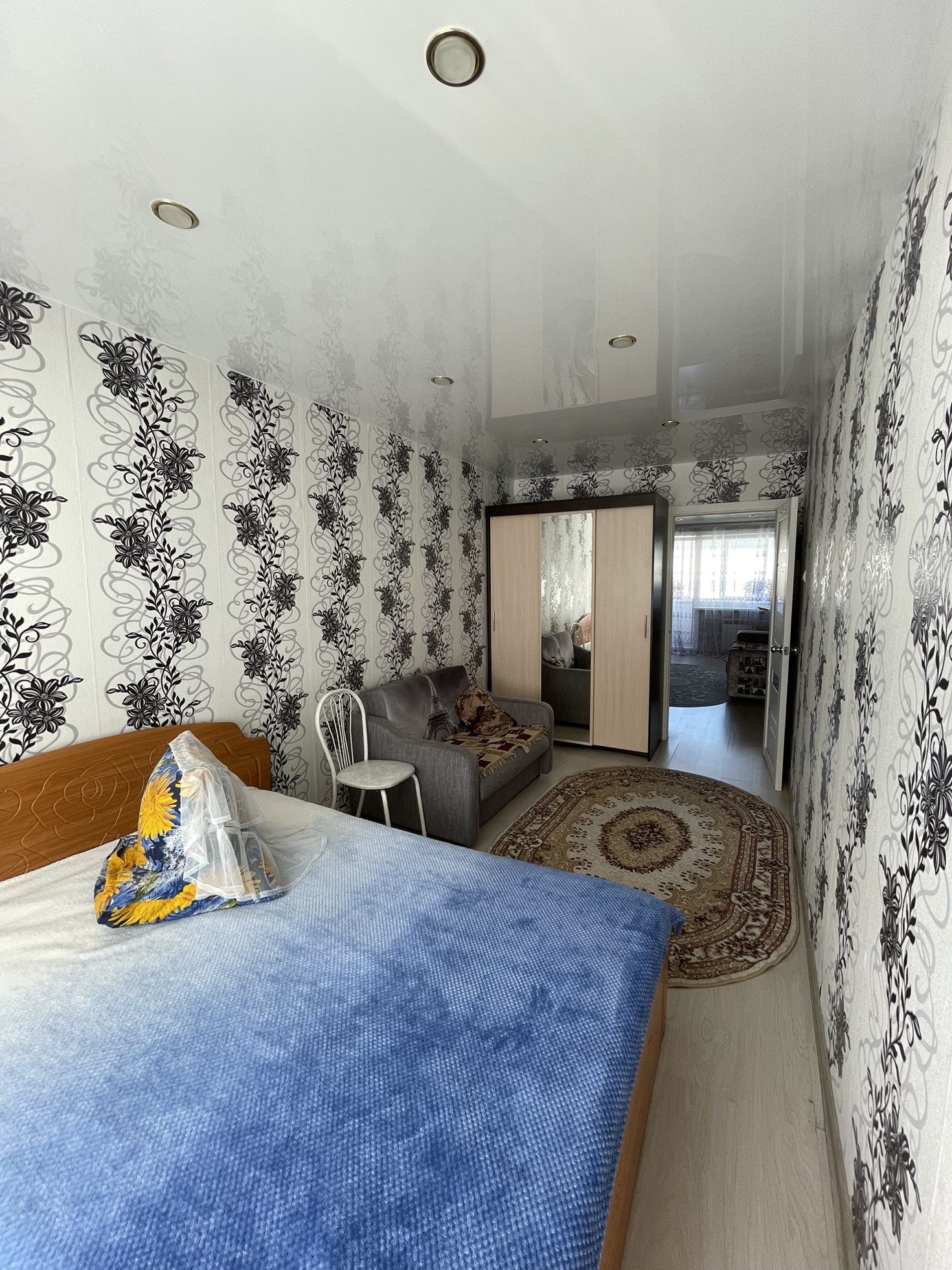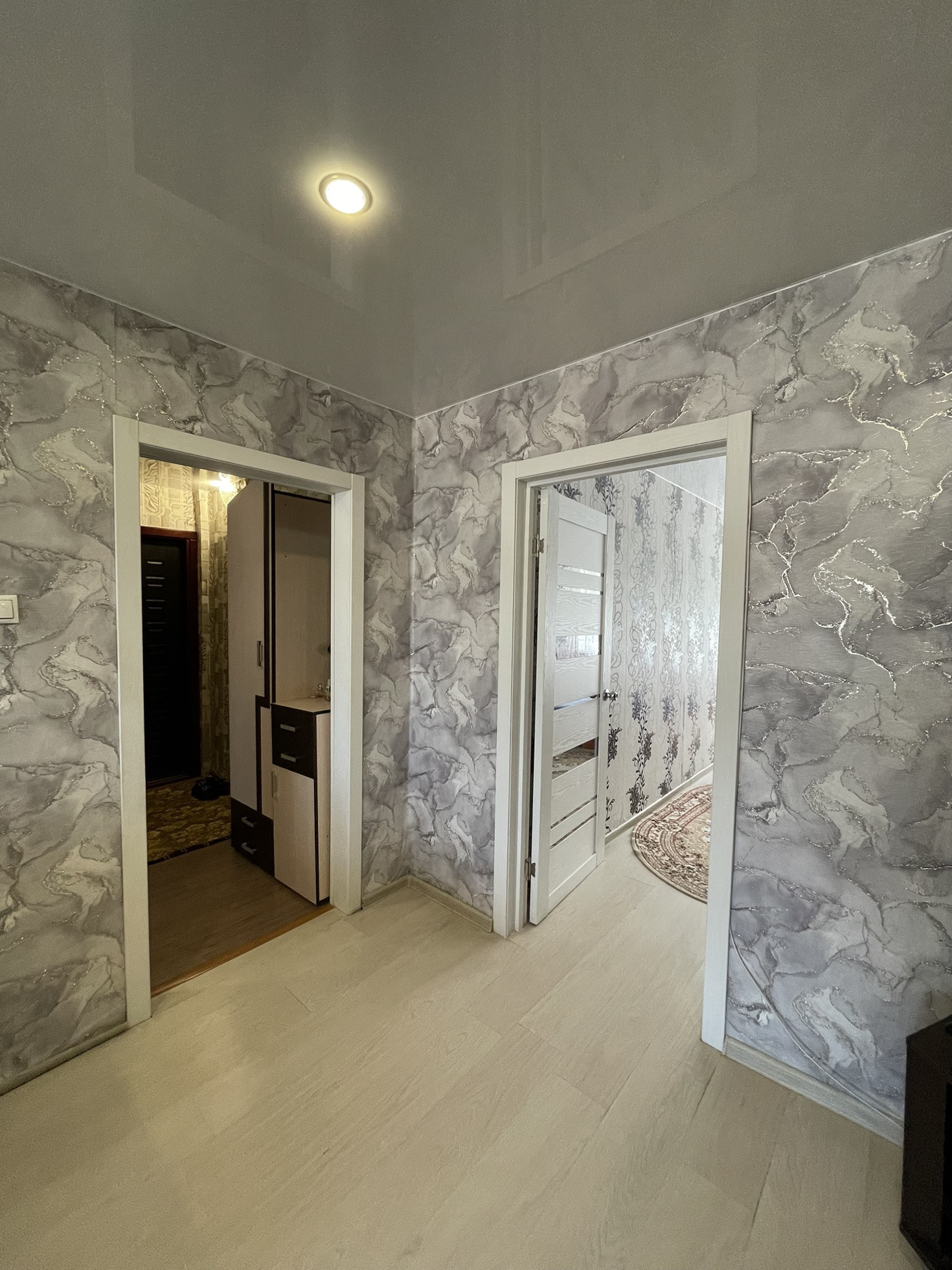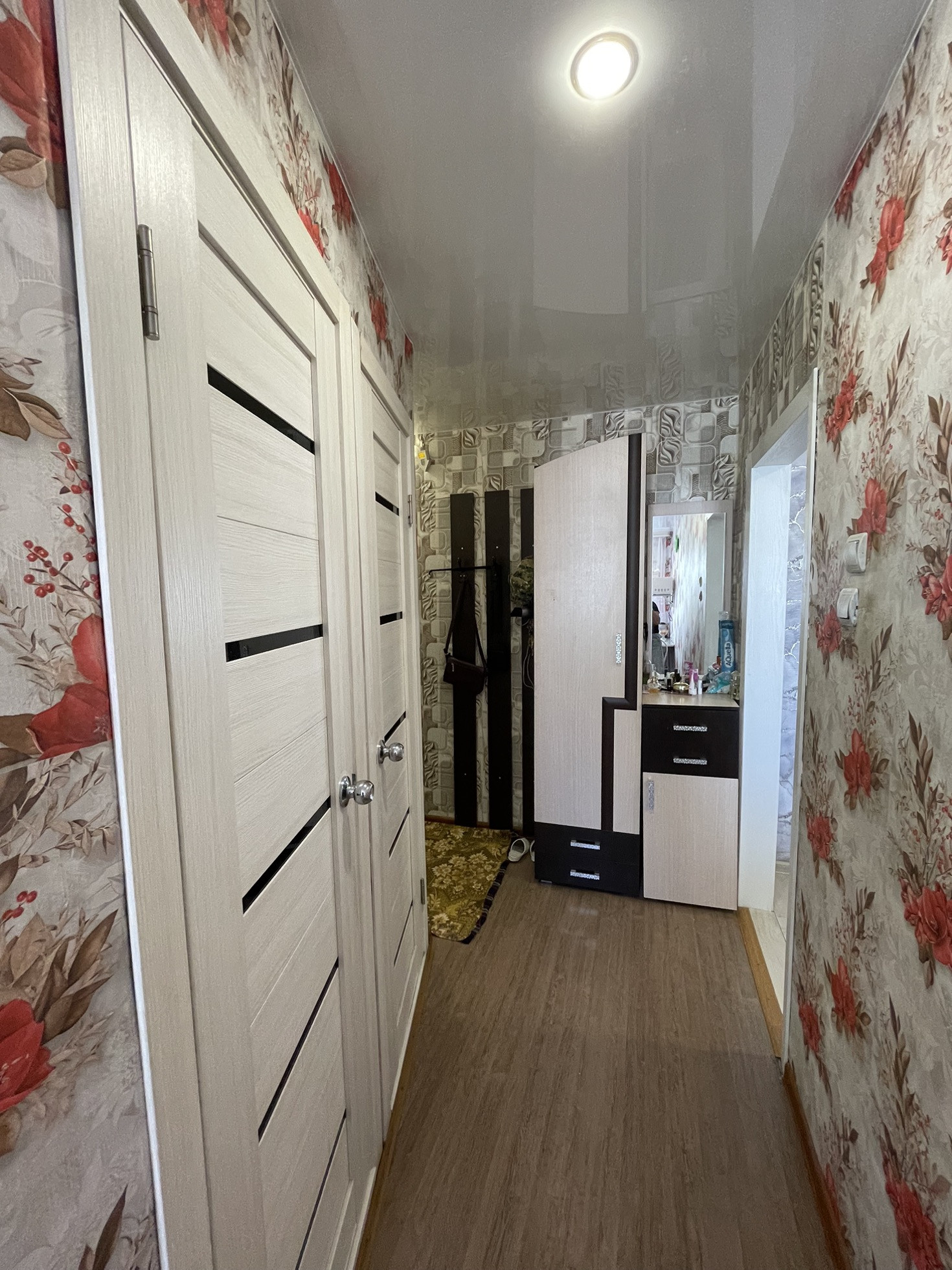 -Балкон застеклен , на полу ламинат, натяжные потолки , радиаторы  ,трубы медь,  счетчики х/г воды.
