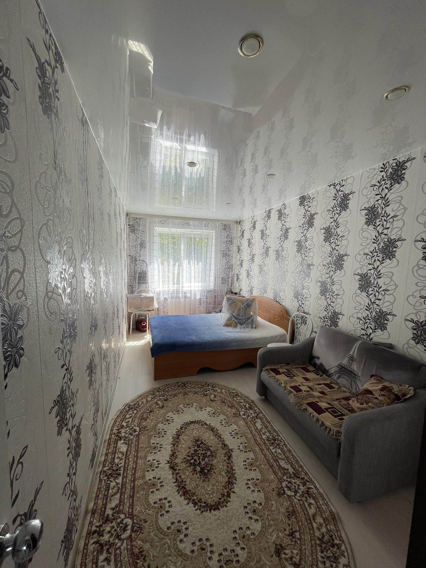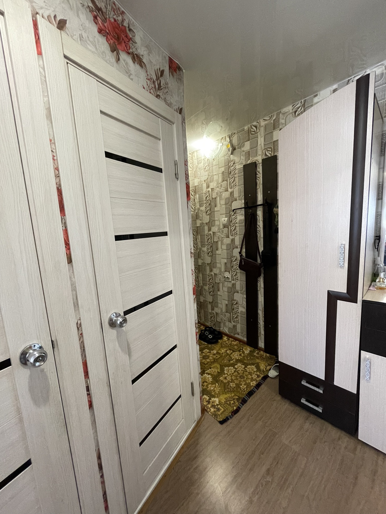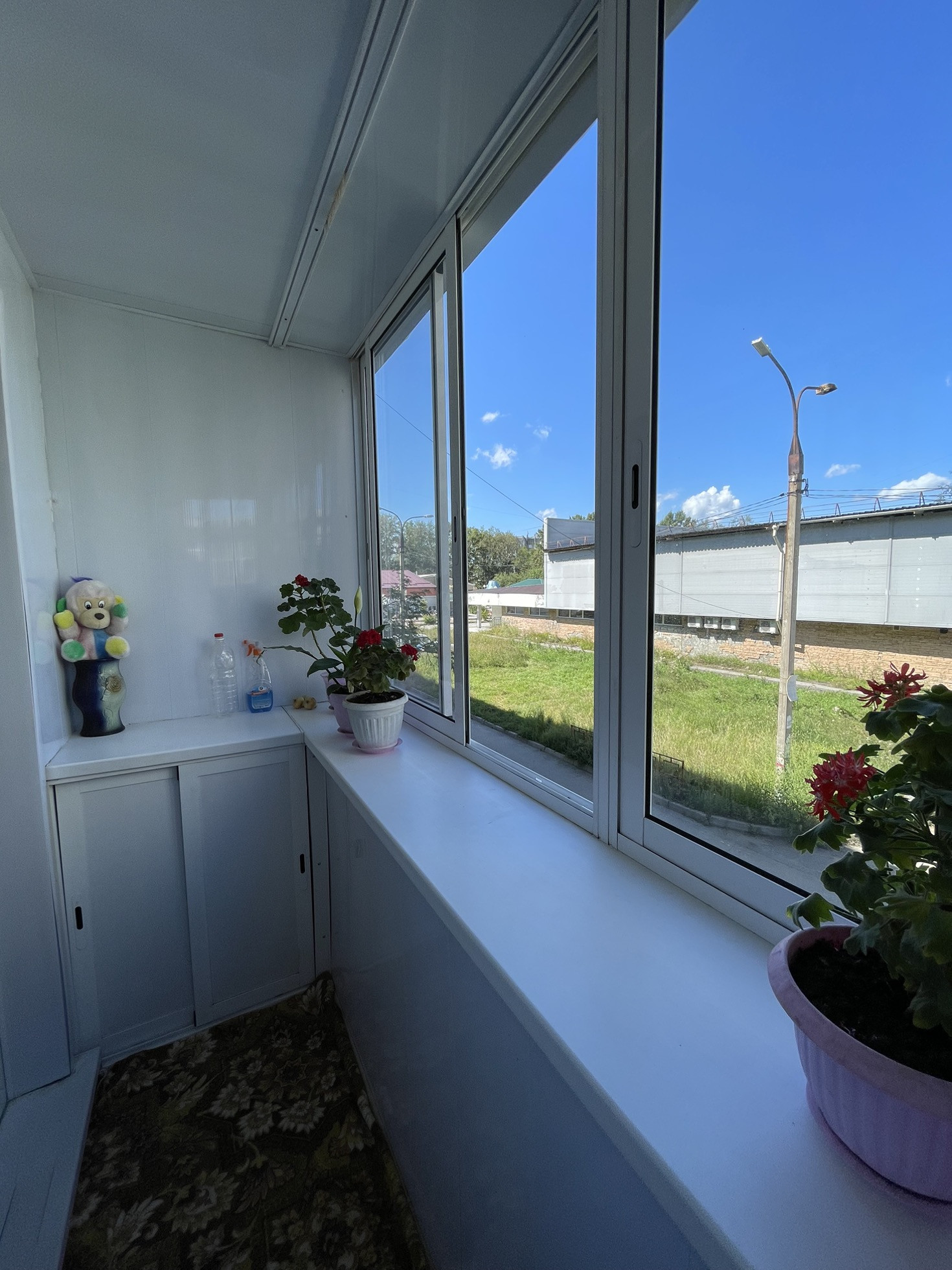 -Балкон застеклен , на полу ламинат, натяжные потолки , радиаторы  ,трубы медь,  счетчики х/г воды.