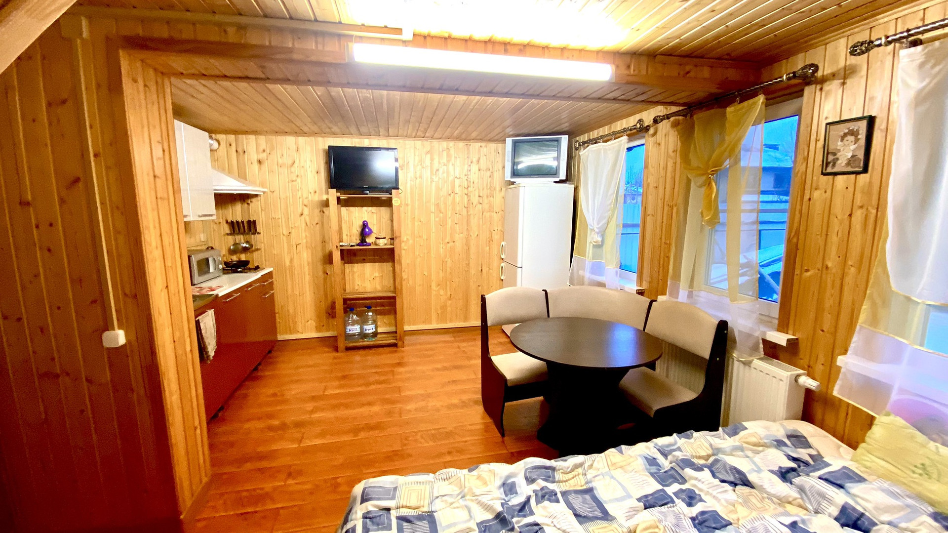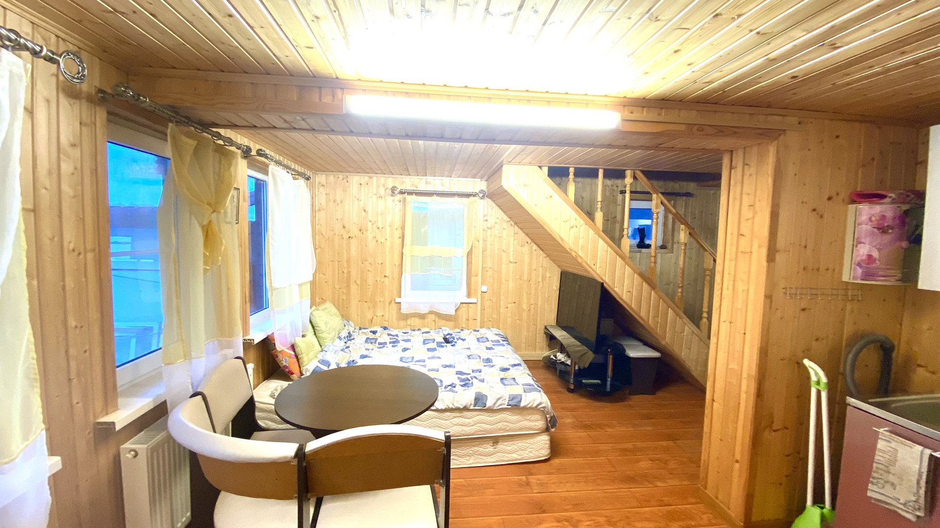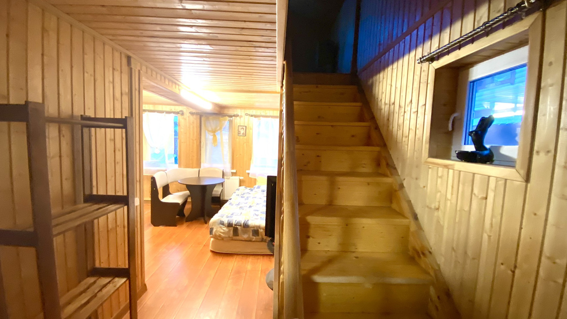 - Гостевой дом двухэтажный. Санузел совмещенный на первом этаже, кухня-гостиная, лестница на 2 этаж. на втором этаже большая спальня