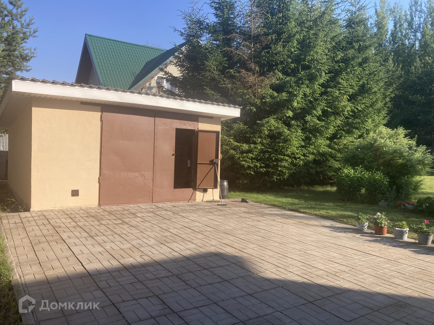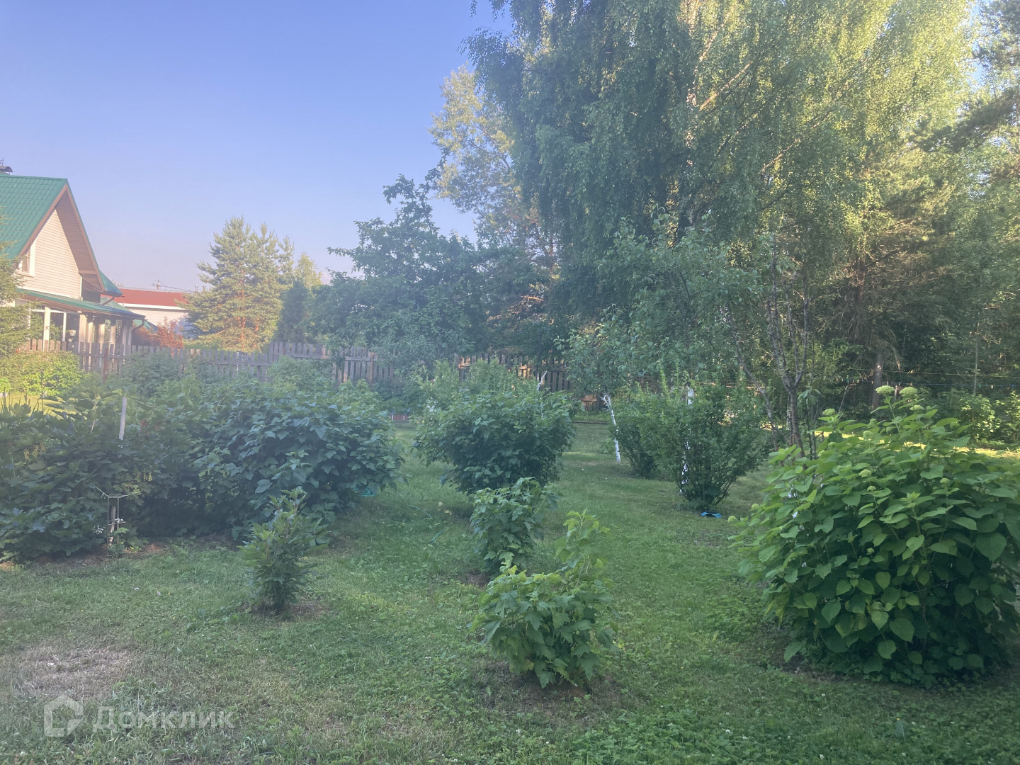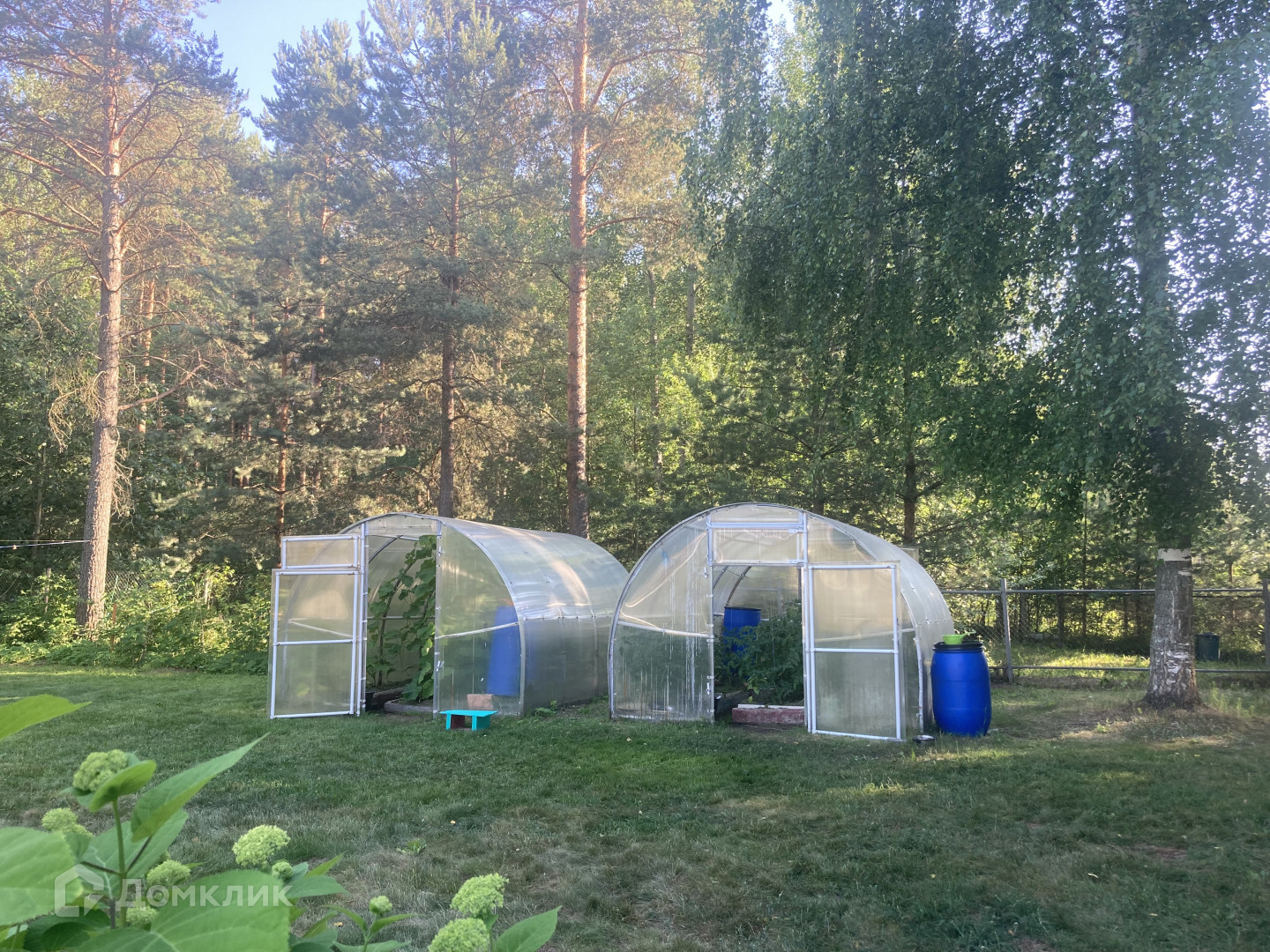На участке есть дополнительные постройки: гараж, хозяйственные постройки, теплицы. Участок ухоженный с плодовыми деревьями и кустами, грядками, клумбами и газоном, есть фонтанчик, сразу за участком - пруд и лес. Участок огорожен металлическим забором с воротами, площадка перед домом выложена тротуарной плиткой.