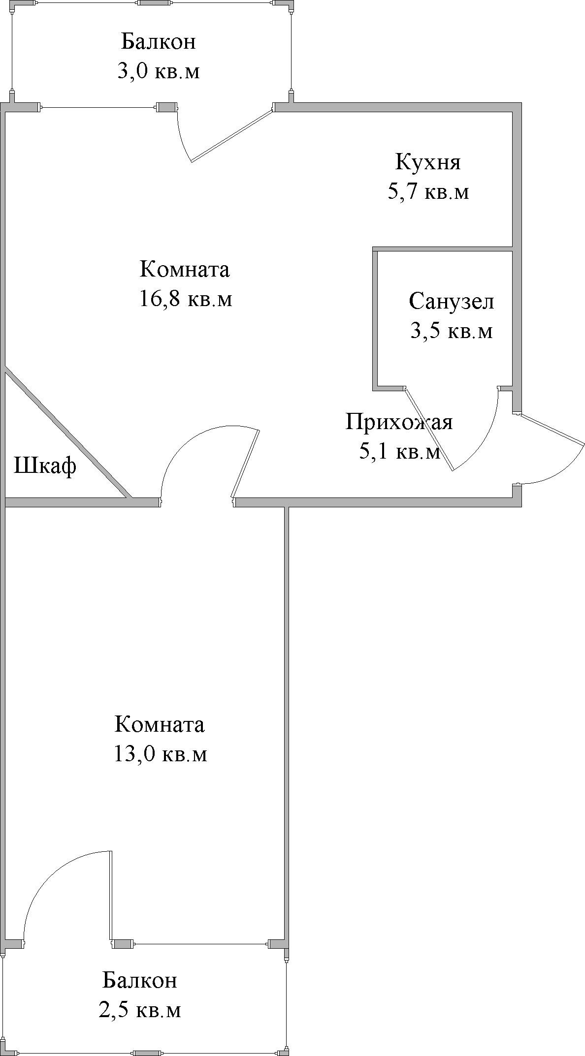 Есть два балкона 2,5 и 3,0 кв.м;