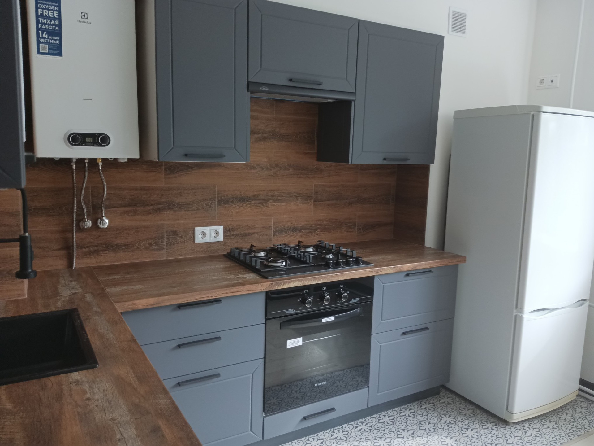 Кухня включает в себя встраиваемый духовой шкаф, варочную панель, вытяжку, посудомоечную машину и холодильник.