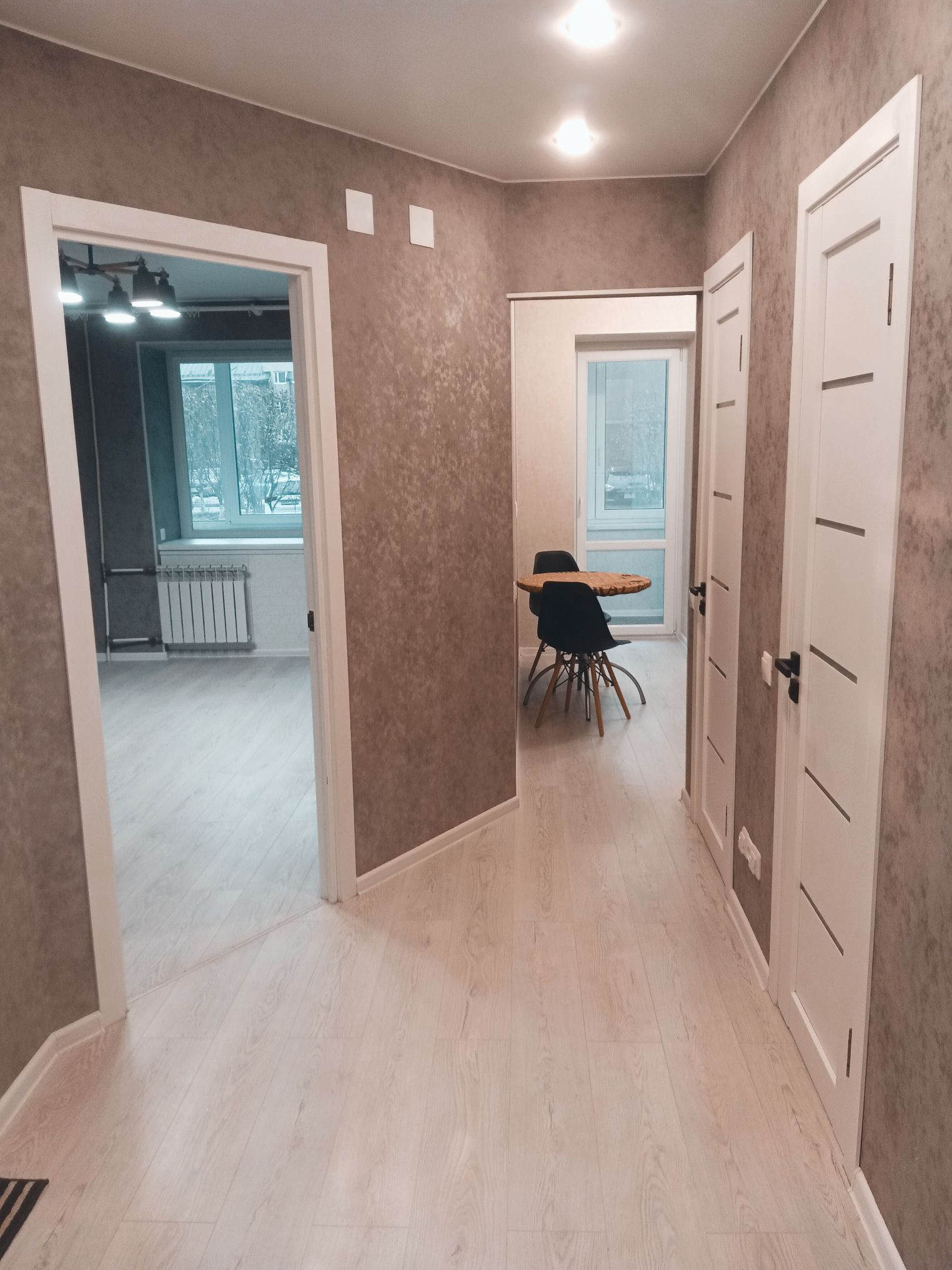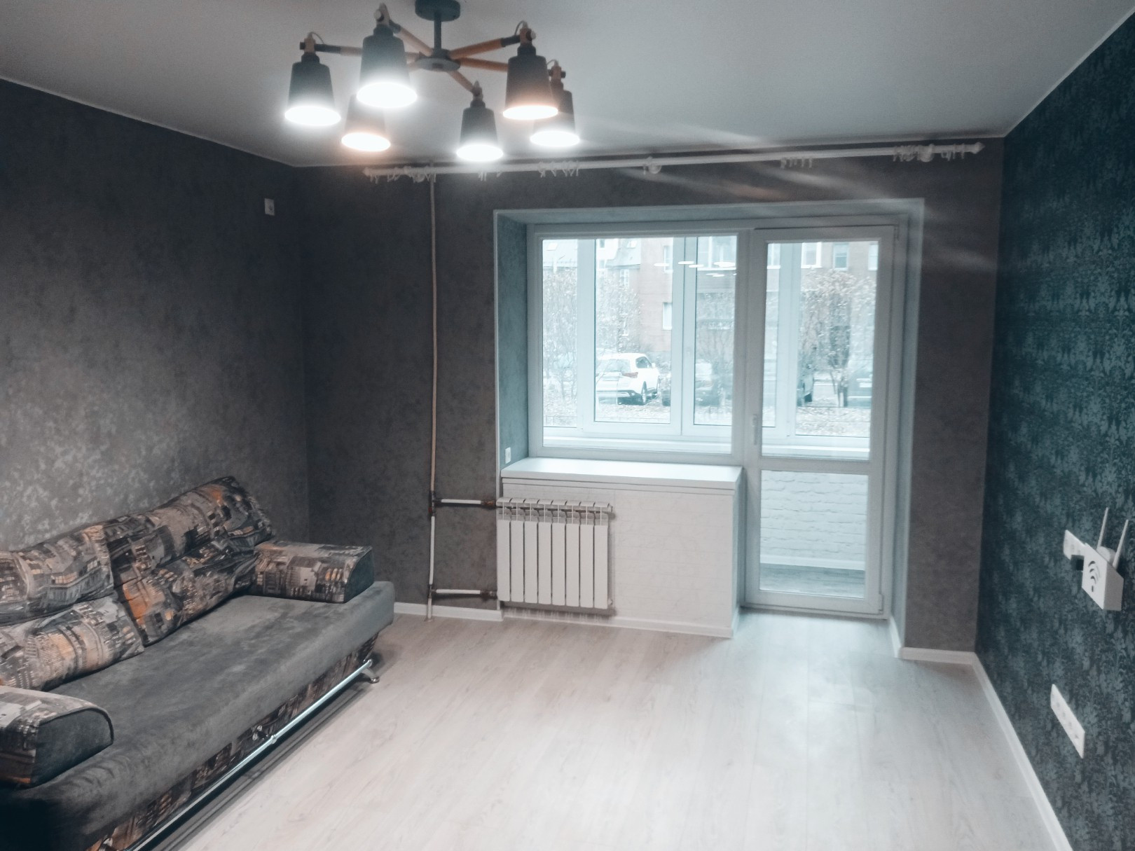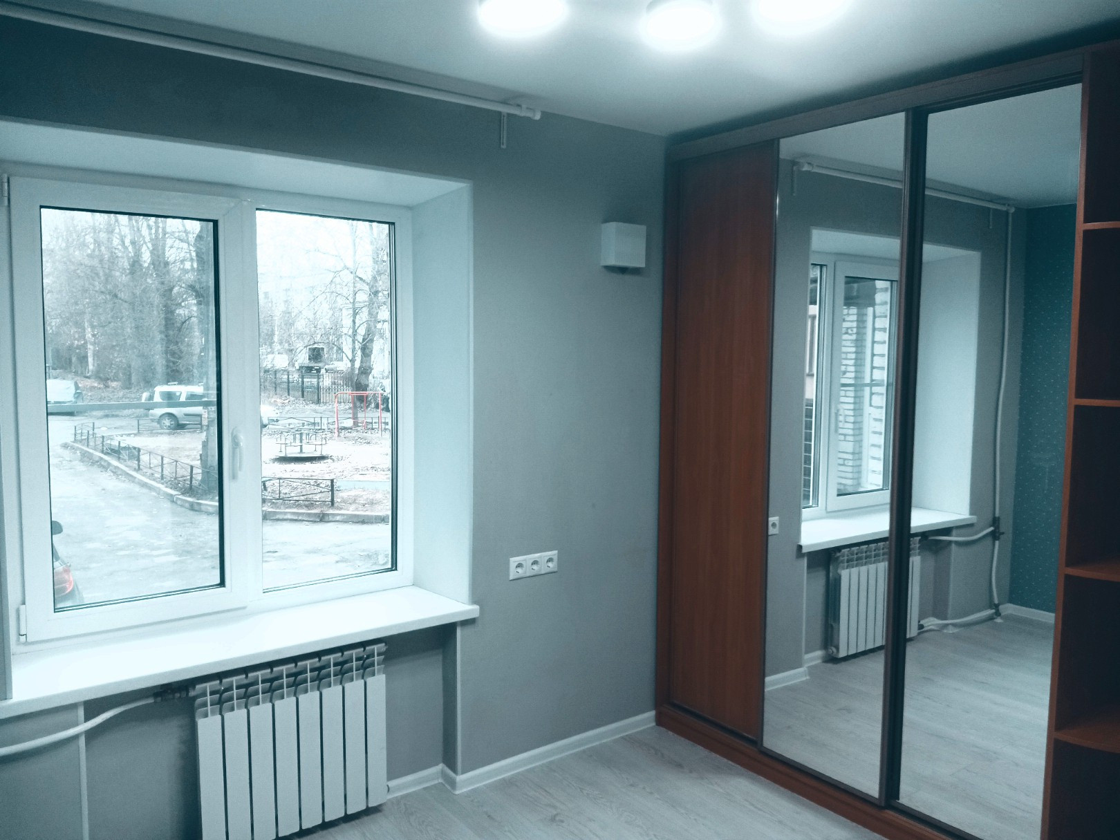 В квартире проведен капремонт с заменой электропроводки и труб, полы заменены на бетонную стяжку, постелен ламинат. Стены выровнены по маякам. Потолки натяжные. Полы в ванной, туалете и на лоджиях с подогревом. Обе лоджии утеплены и остеклены двухкамерными стеклопакетами.