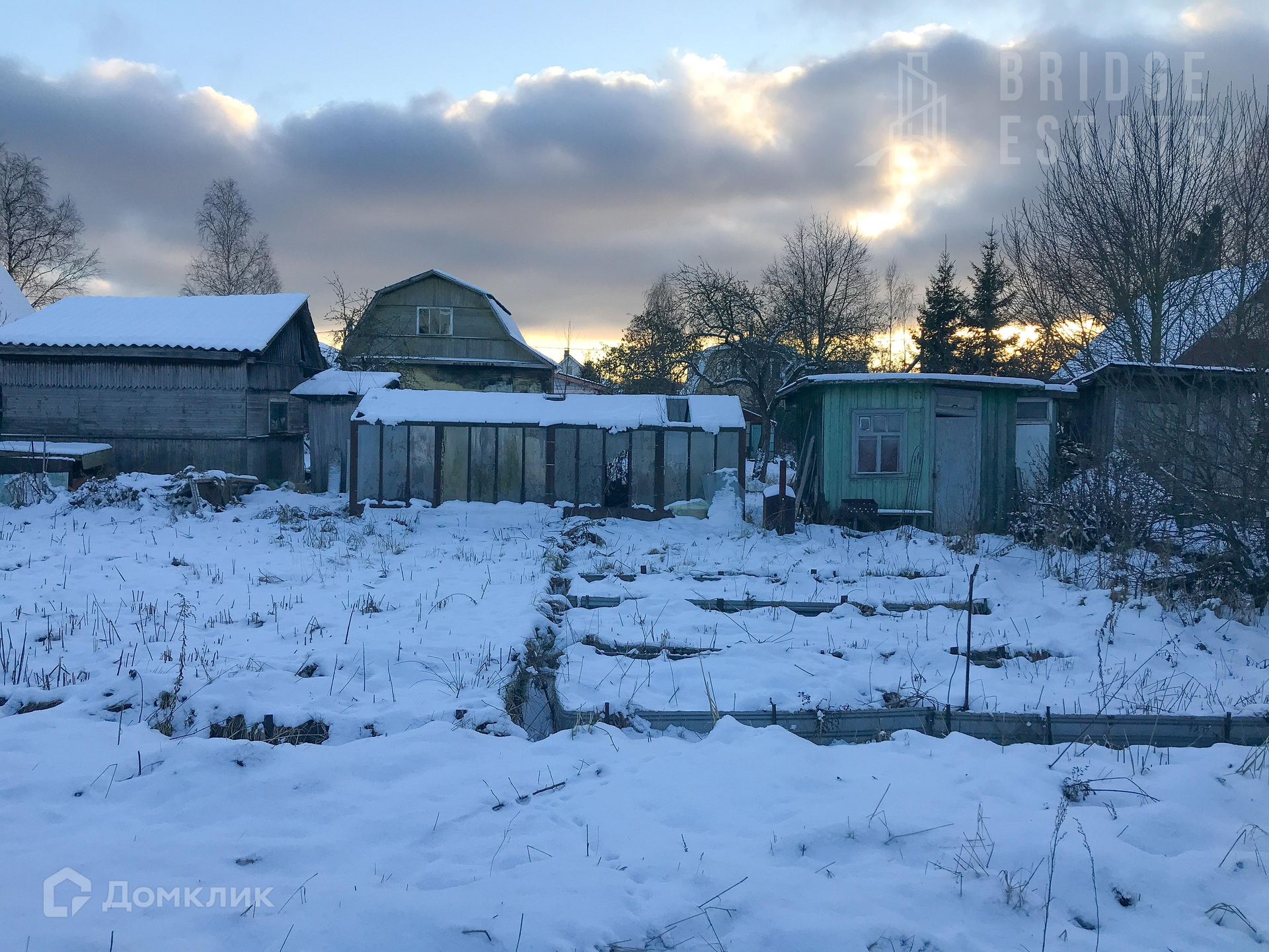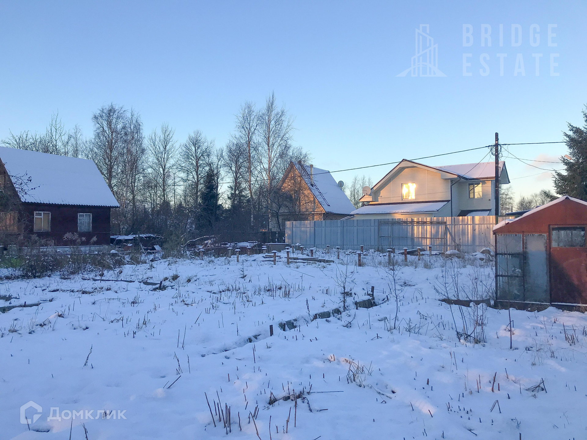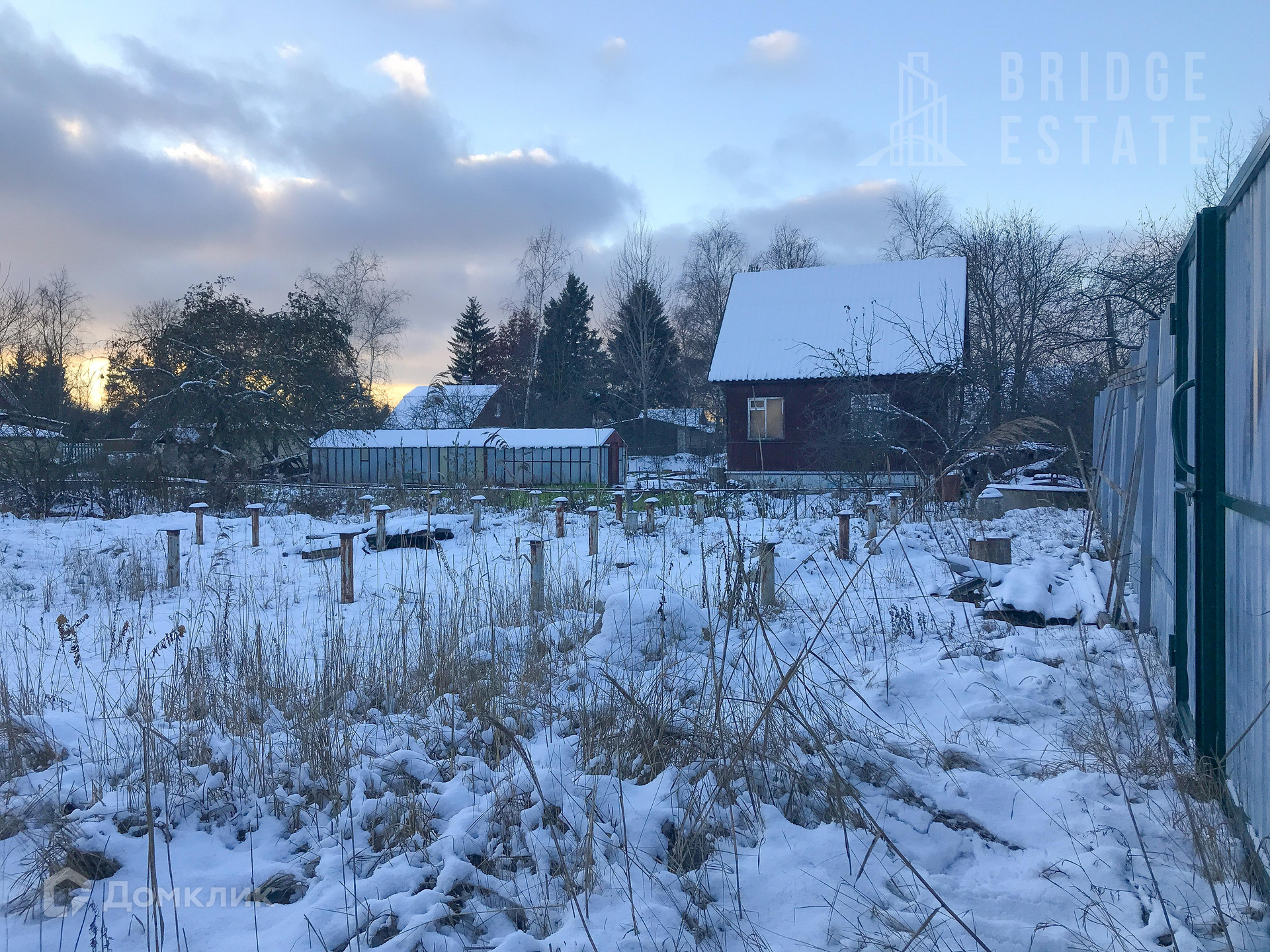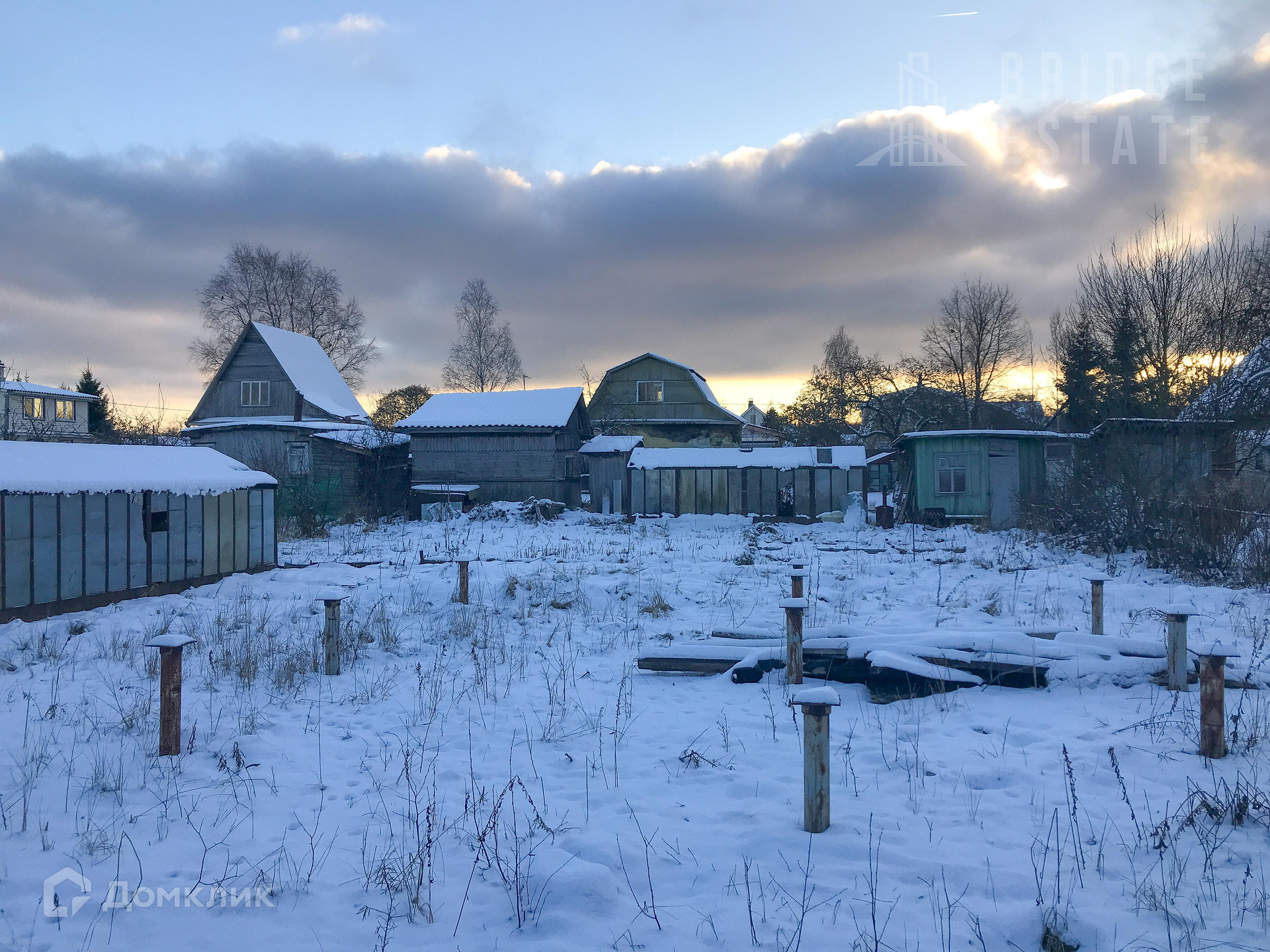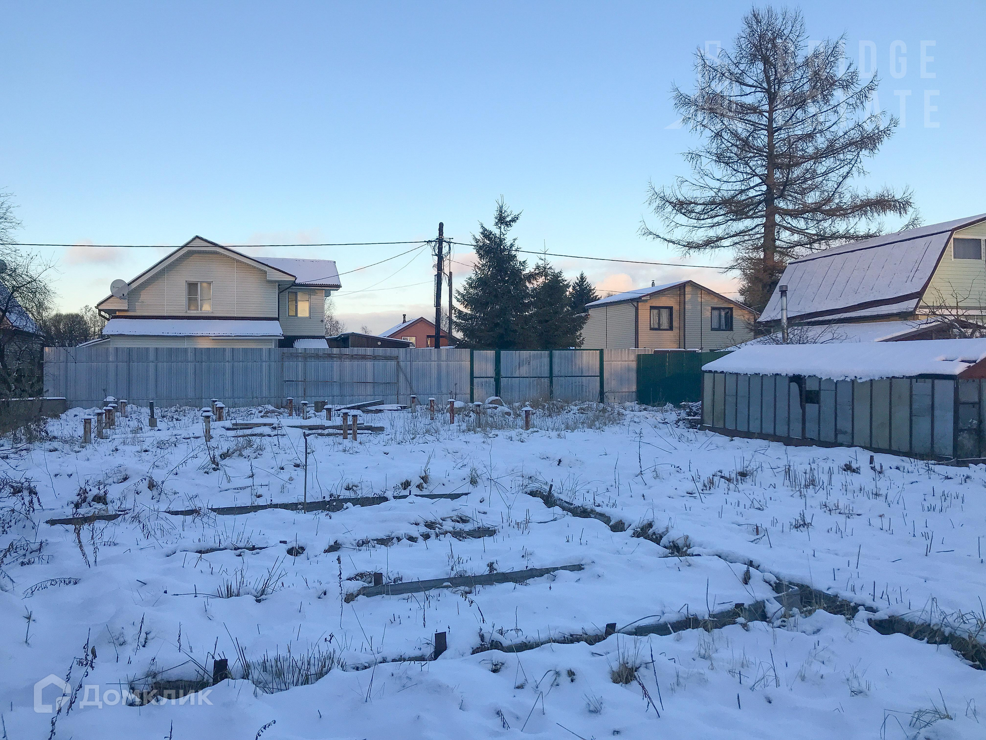 Участок богат постройками - две теплицы, хозблок и туалет, может что-то и пригодится. Растут яблони, сливы. Частично построен забор, сделан заезд для автомобиля.