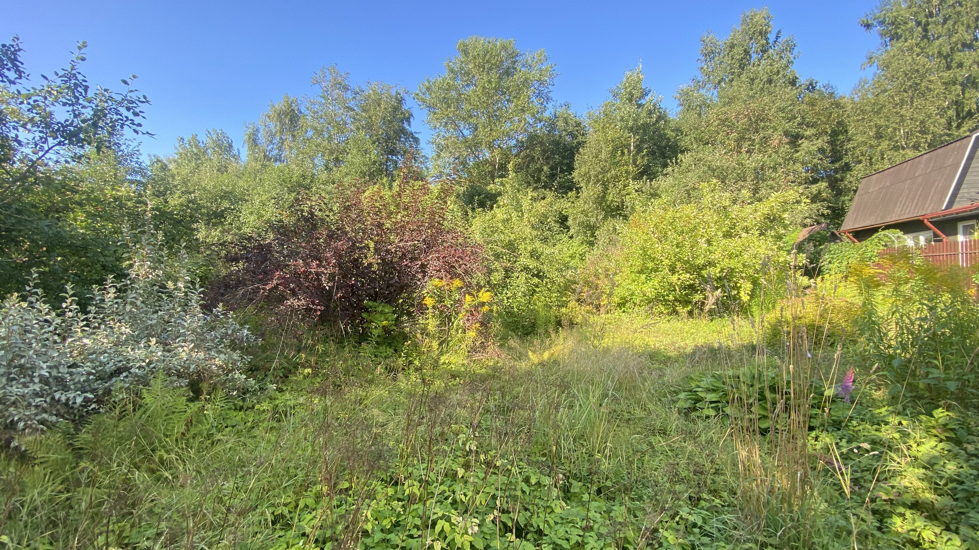 На участке много плодовых деревьев , яблони , груша .
