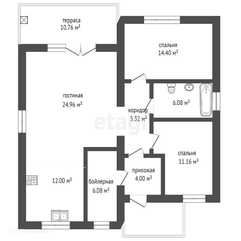 Современная, функциональная планировка: две спальни, просторная кухня гостиная с выходом на террасу, совмещенный с/у, прихожая, отдельная бойлерная.
