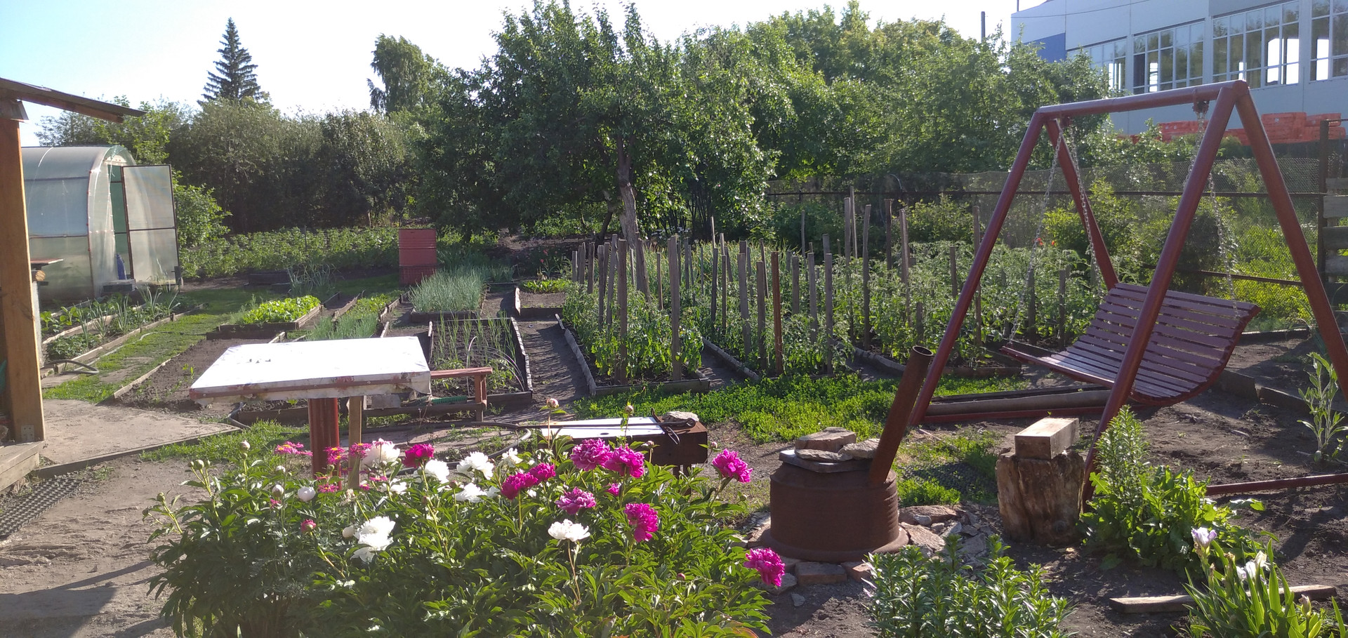 Мангальная зона с беседкой и качелью, есть печь под казан.