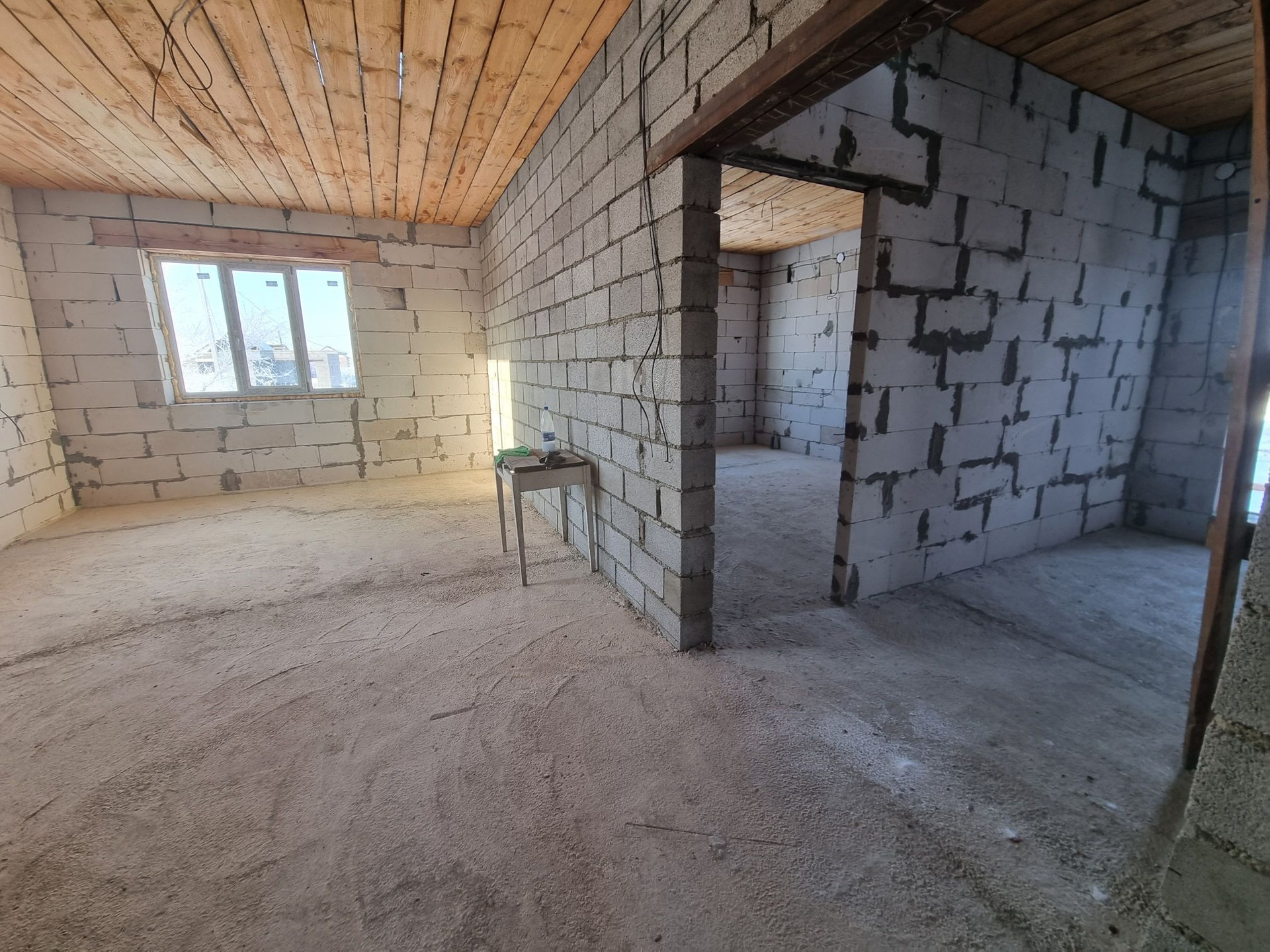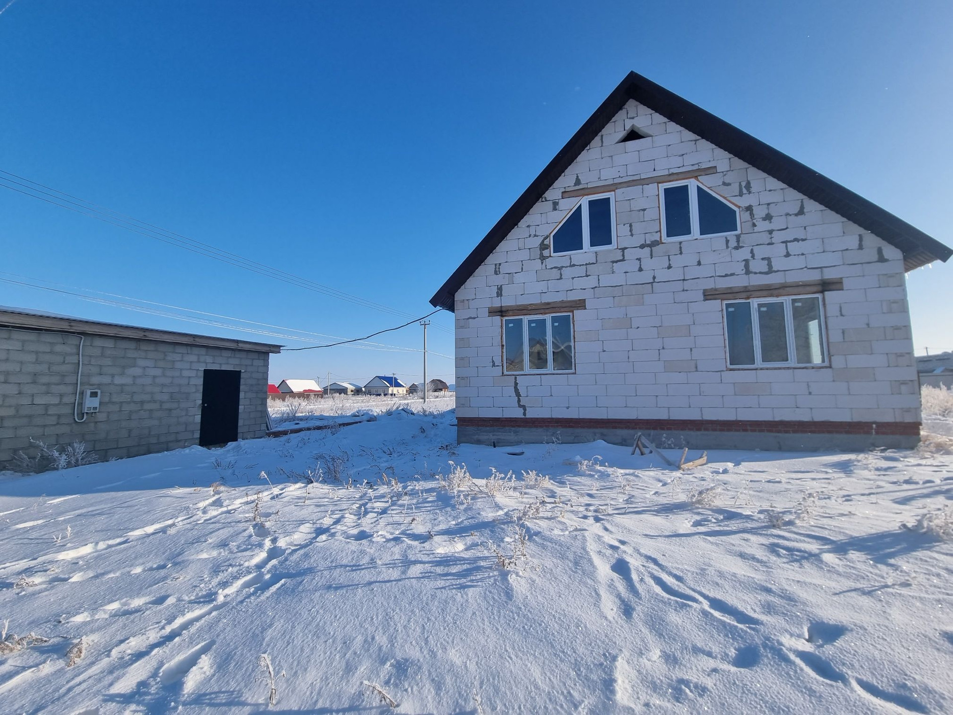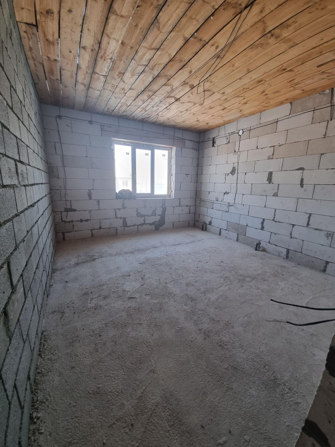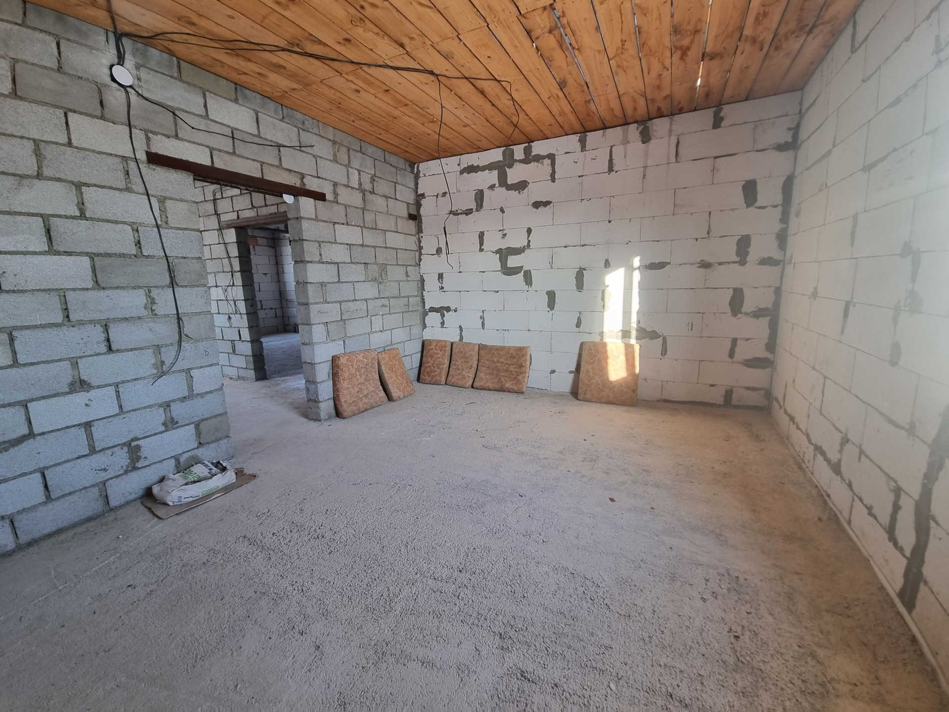 Дом под крышей, крыша металлочерепица. ‍♂️Материал стен- инсиблок, перегородки-шлакоблок, ленточный фундамент. Полы залиты, установлены пластиковые окна. Электричество на 220 и 380 проведено по дому, выгребная яма 4 метра, заведена канализация, трубы под воду. Газ и вода проходят по улице.