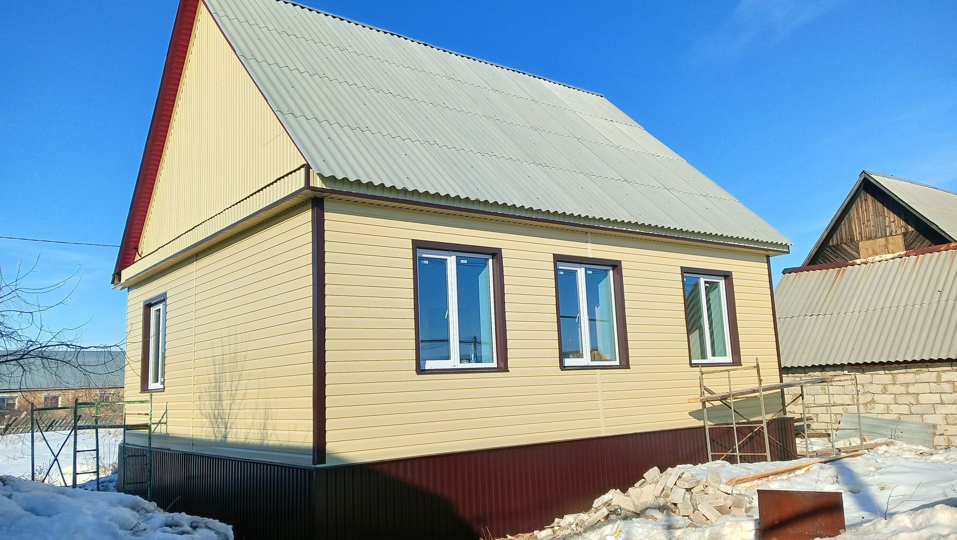 Продам дом в стадии завершения из пеноблока, утеплён минеральной ватой, обшит металлическим сайдингом, пластиковые окна, электричество 380В, вода в доме. Просторная кухня, зал и две спальни, высокие потолки. На участке имеется гараж и времянка под одной крышей, во времянке капитальный сухой погреб. В шаговой доступности остановка общественного транспорта, магазин и детский сад. Асфальт до дома. Можем довести дом до завершения строительства с учётом Ваших пожела́ний за дополнительную плату.