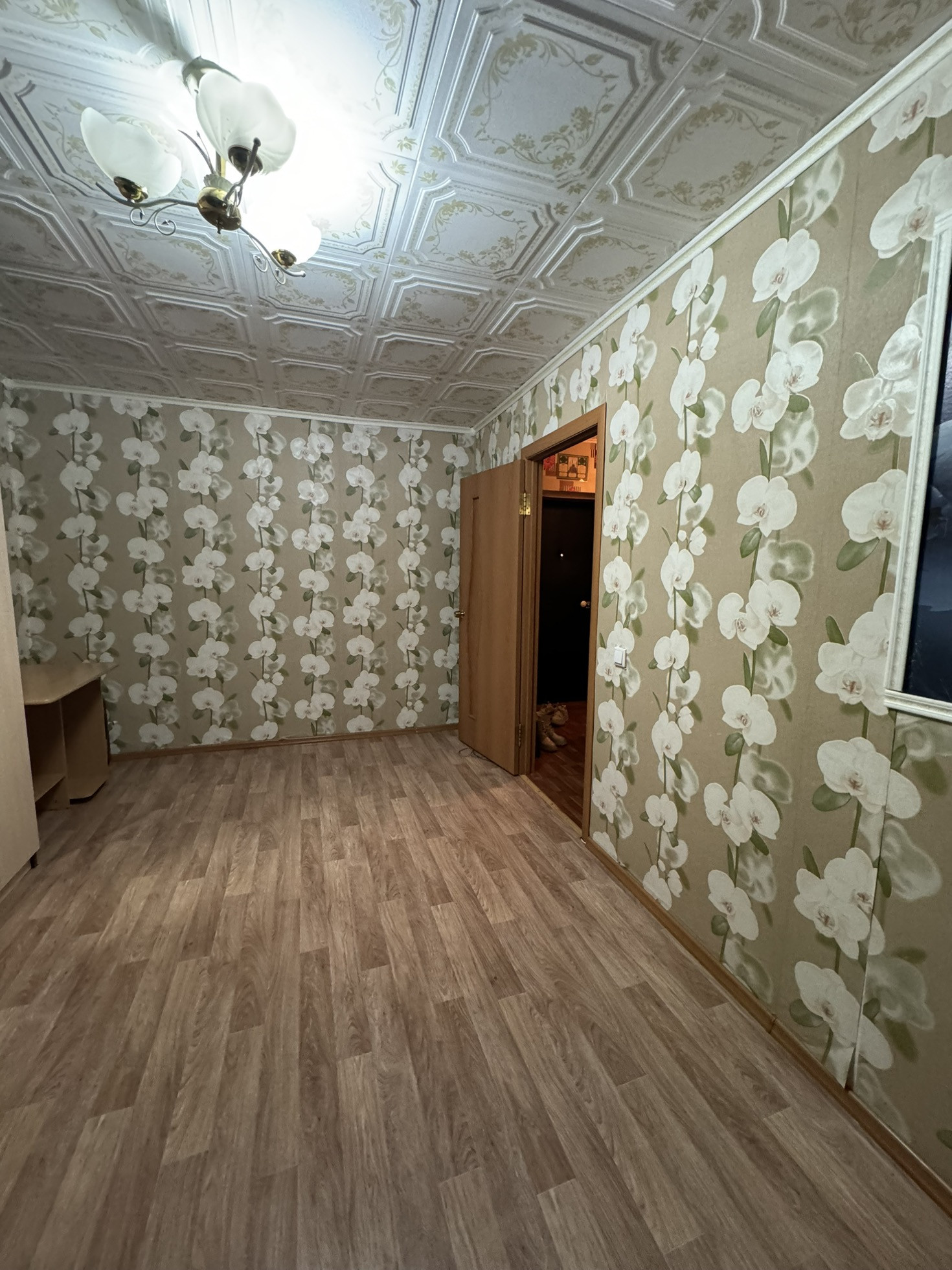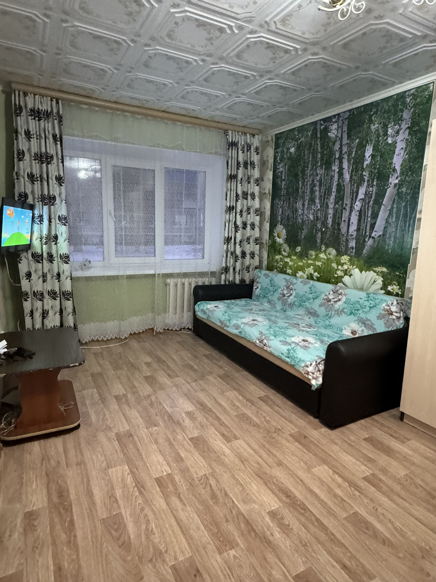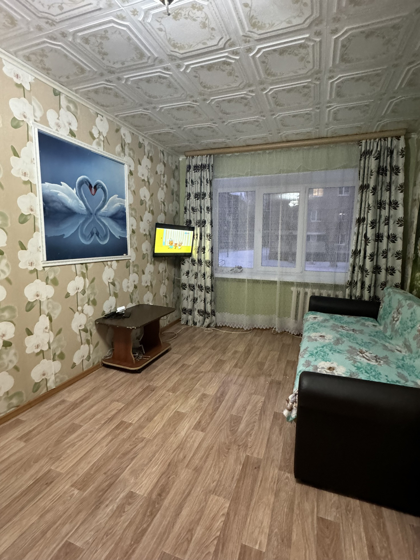 Постелен линолеум, натяжные потолки, пластиковые окна.