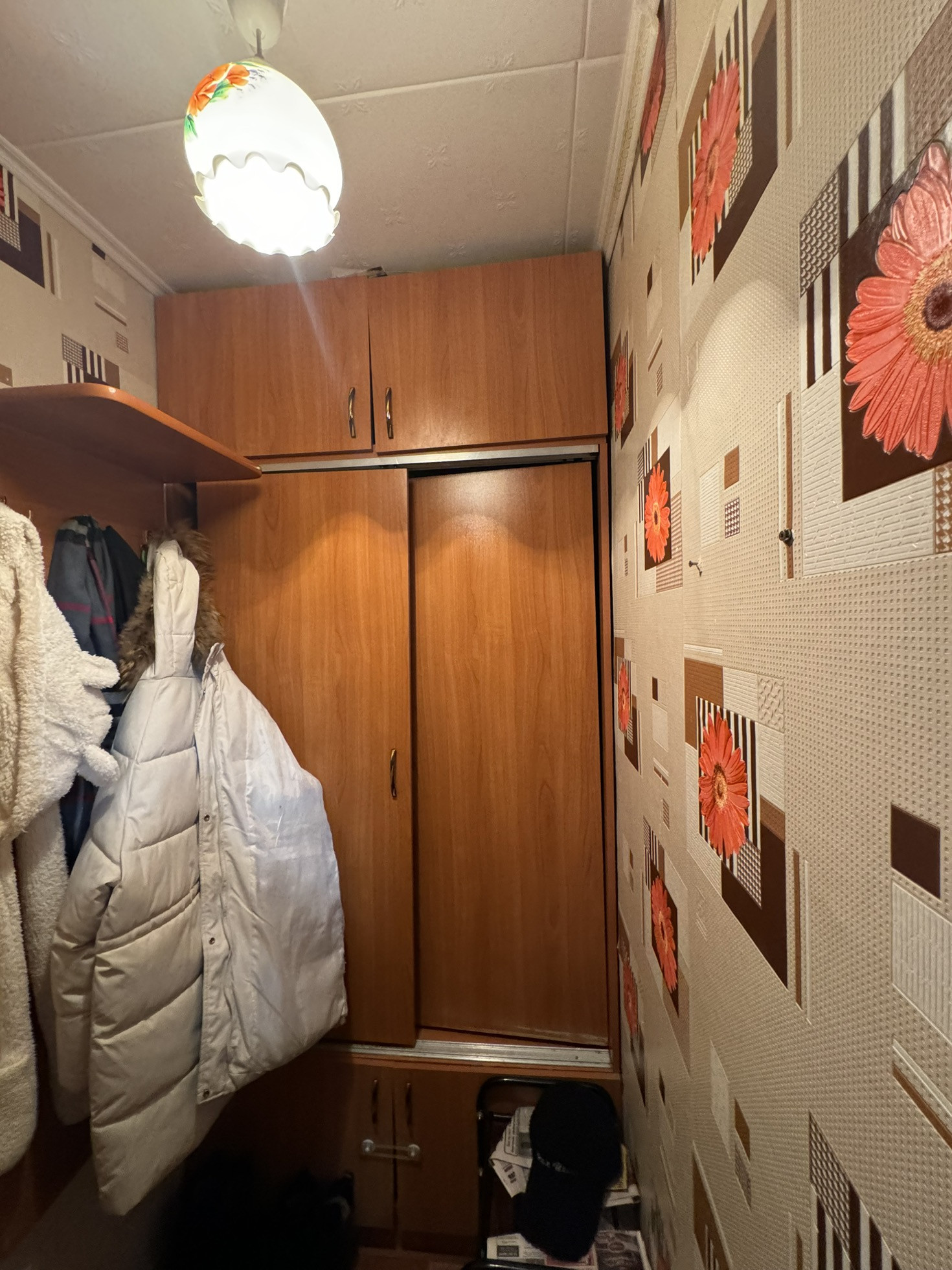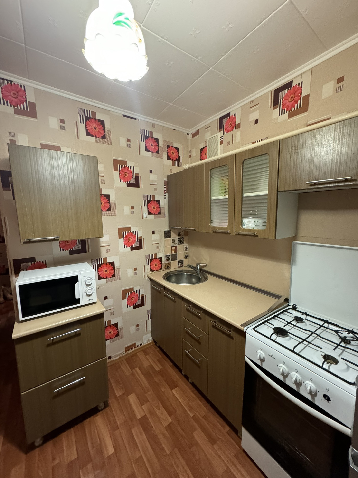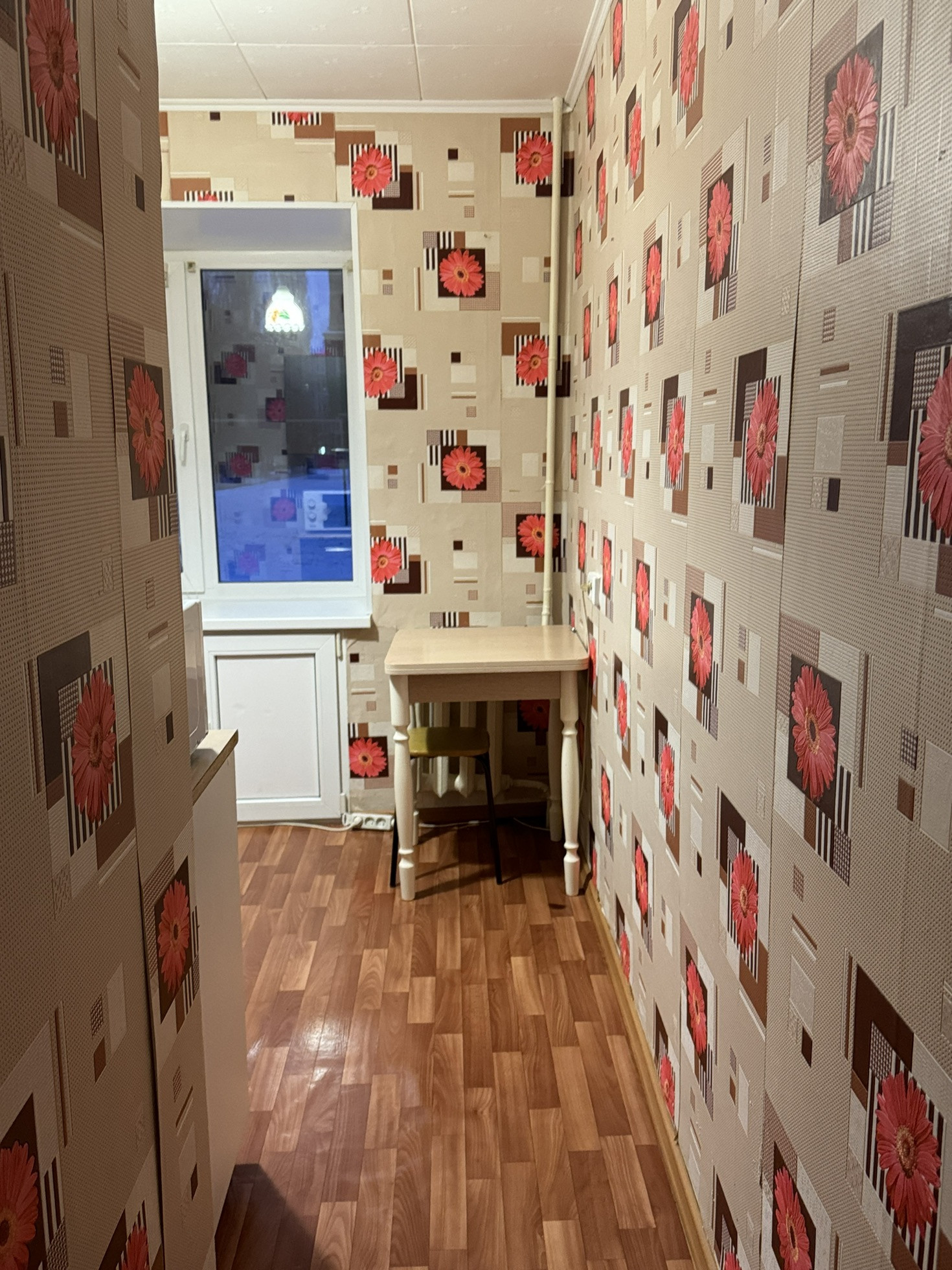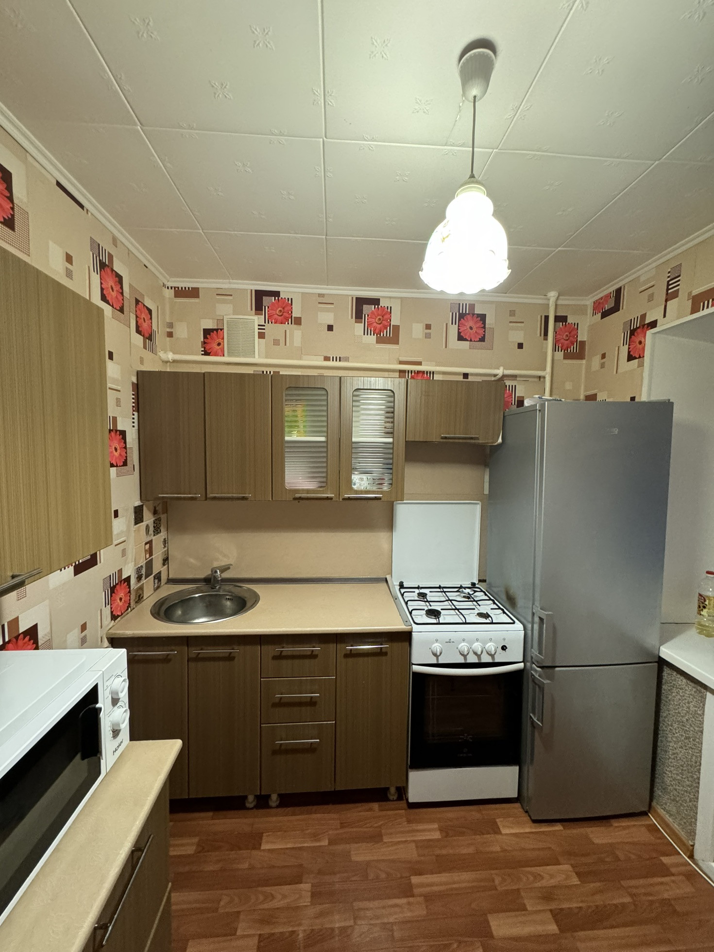 Постелен линолеум, натяжные потолки, пластиковые окна.
