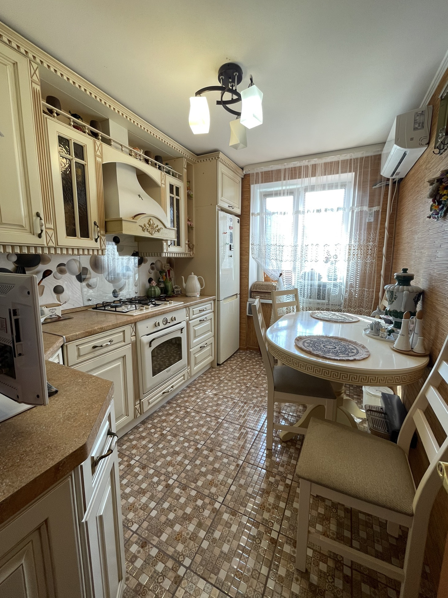 Остаётся кухонный гарнитур , встроенная техника : посудомоечная машина , варочная поверхность, духовой шкаф, система фильтрации питьевой воды.