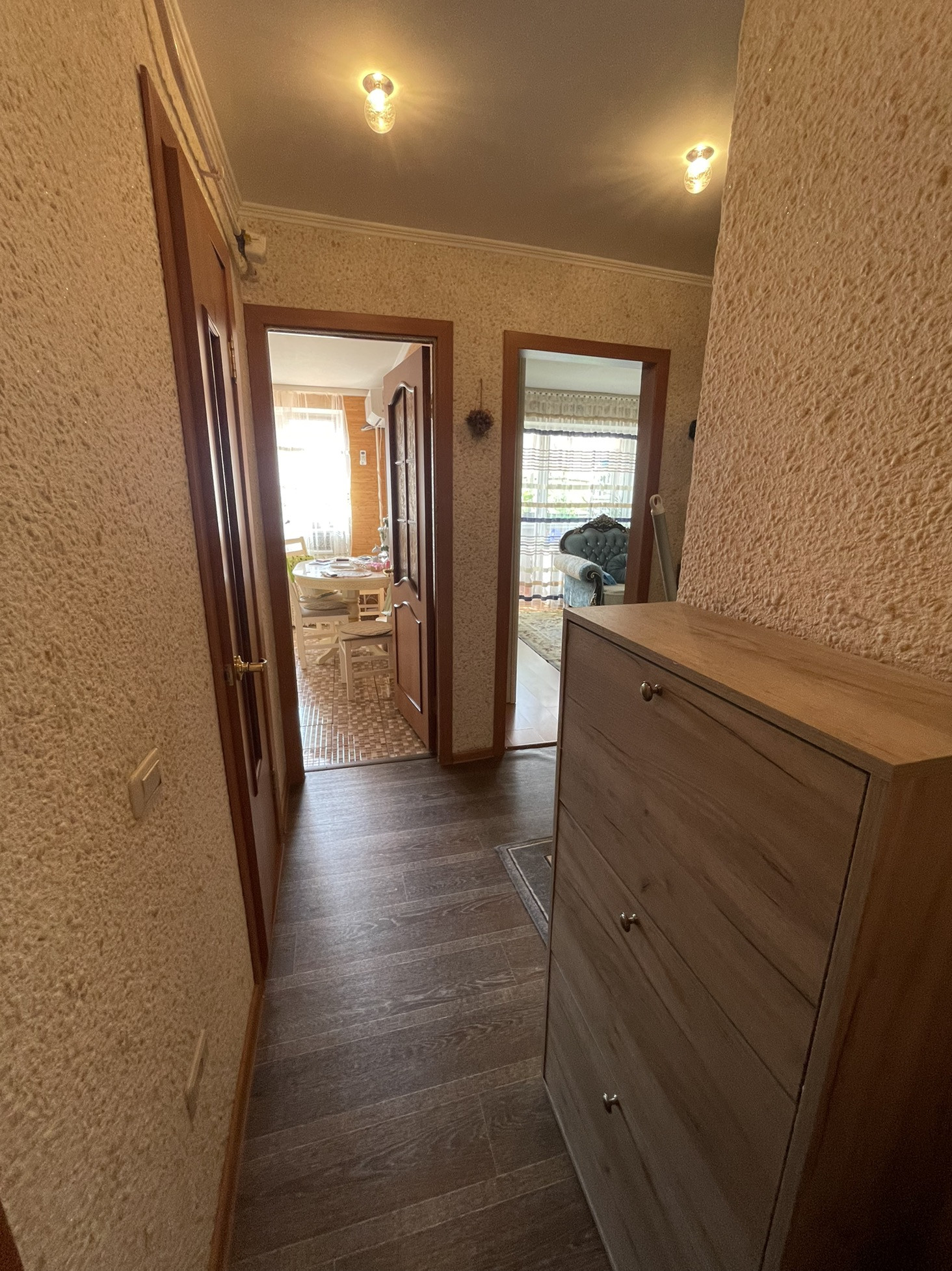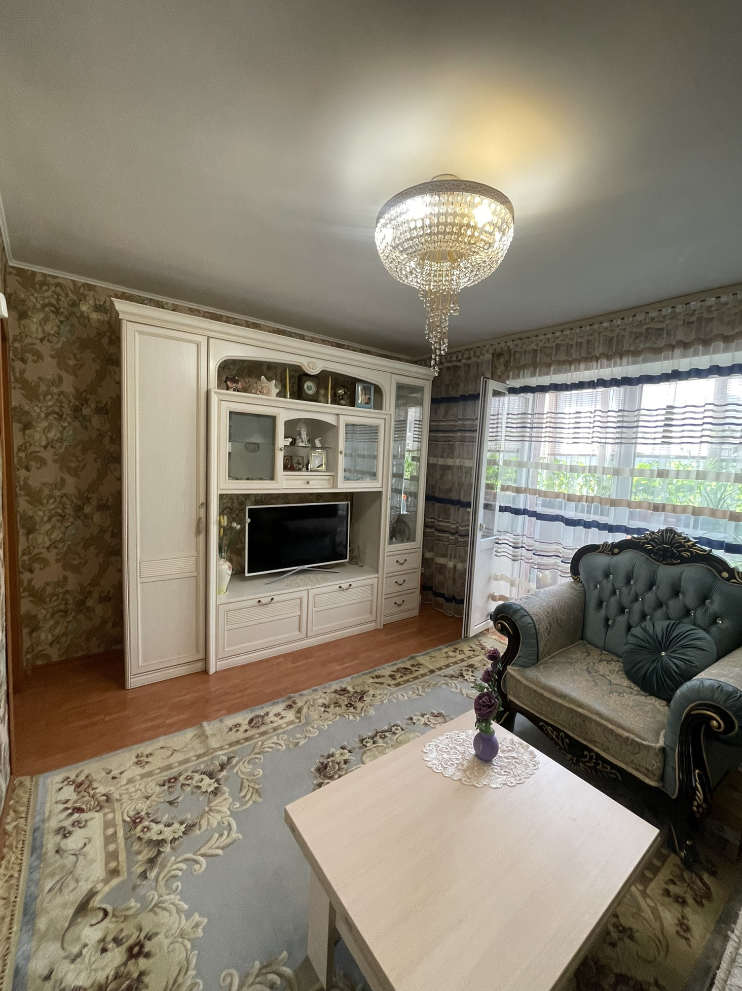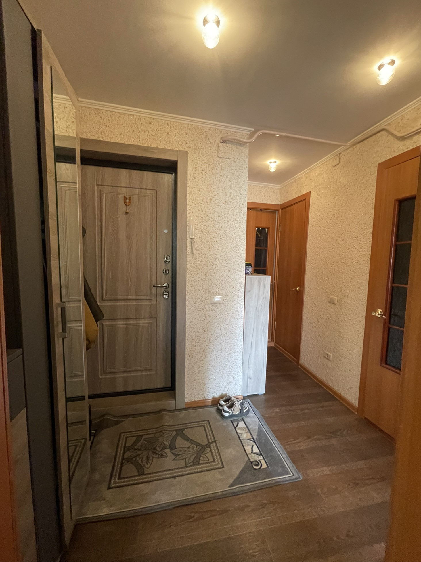 Остаётся встроенный шкаф купе в гостиной , мебель в прихожей.