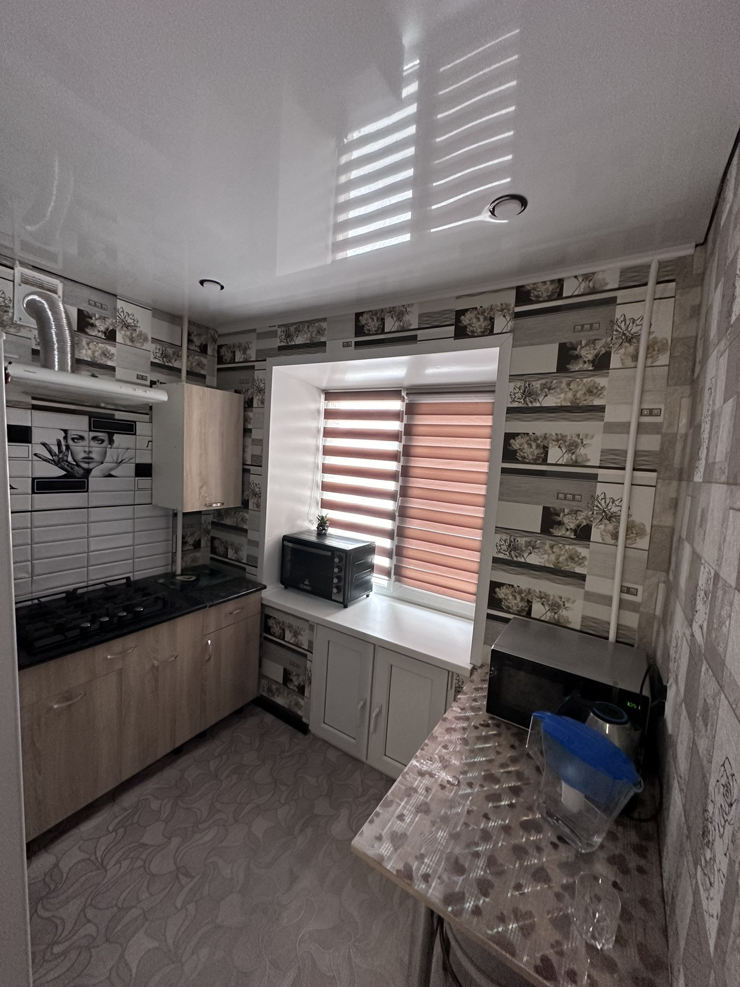 По всей квартире натяжные потолки, окна пластиковые, новая входная дверь. Санузел совмещен, счетчики все новые, балкон застеклен ремонт свежий.