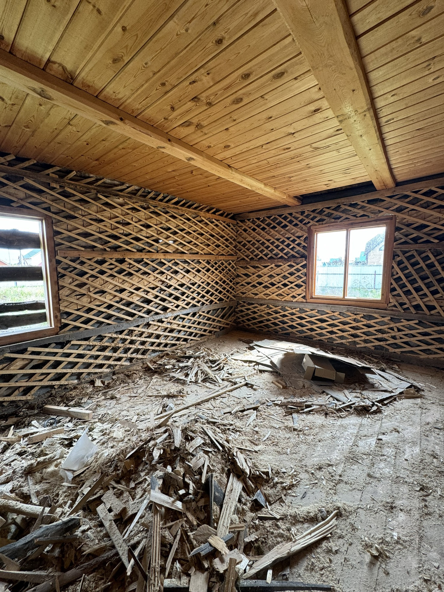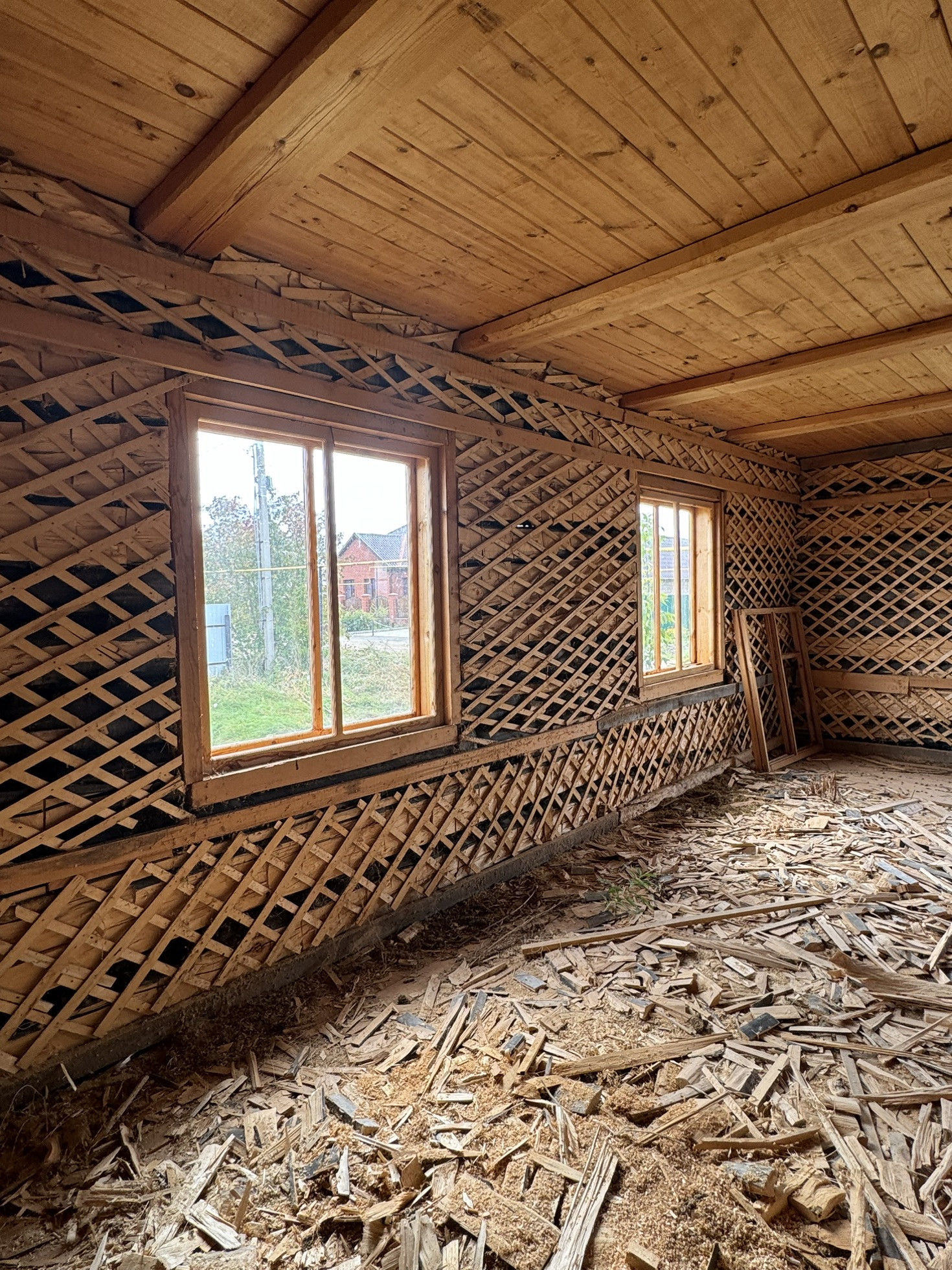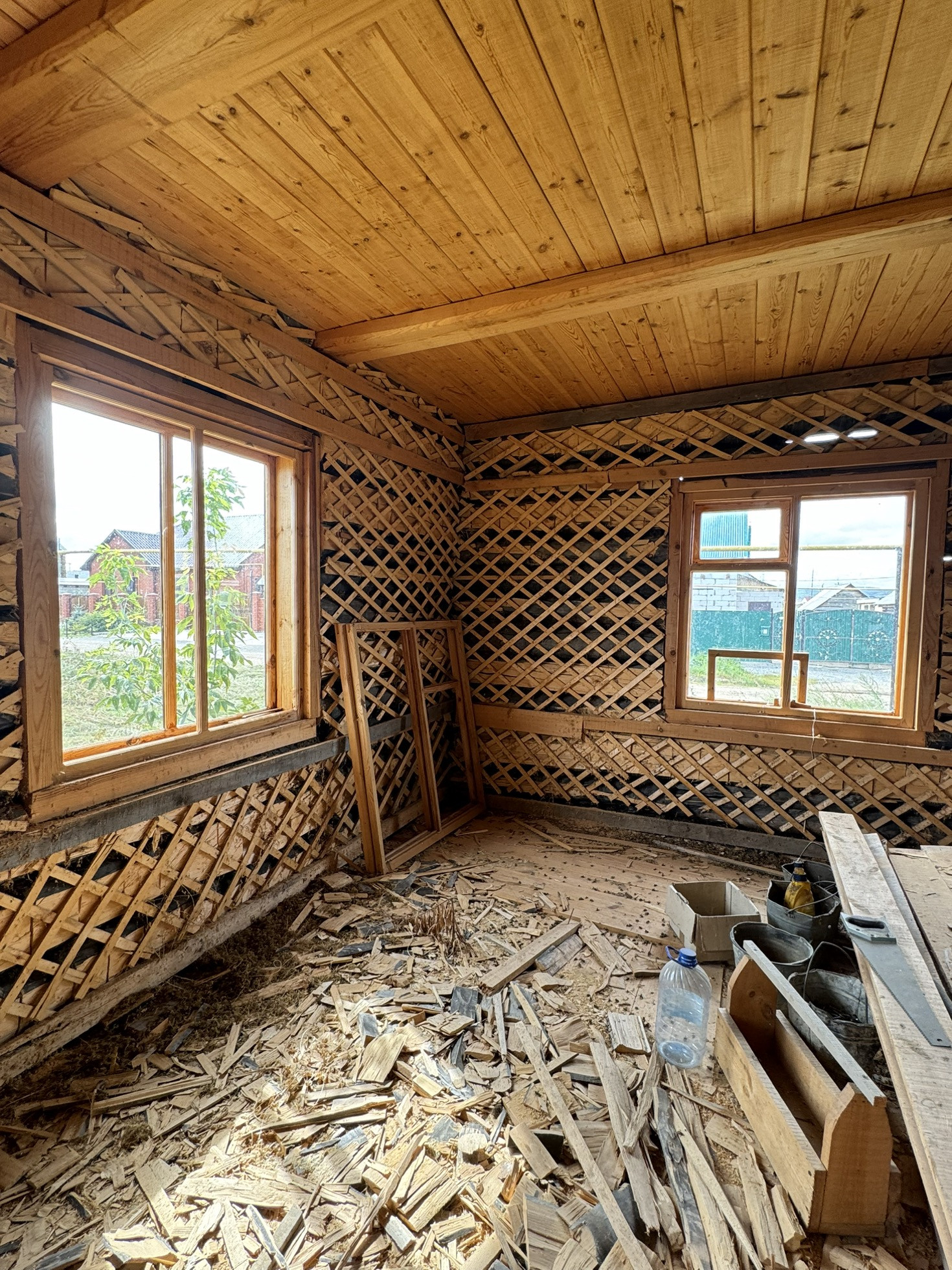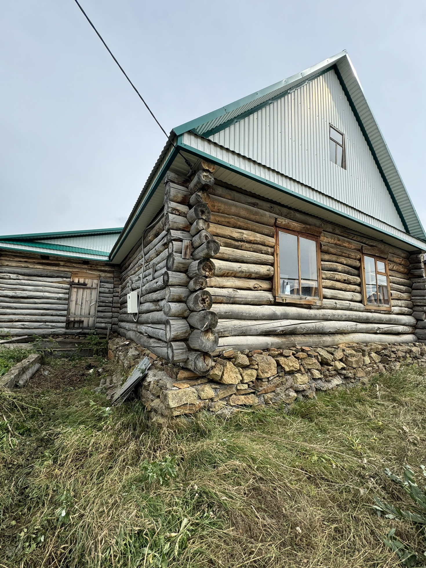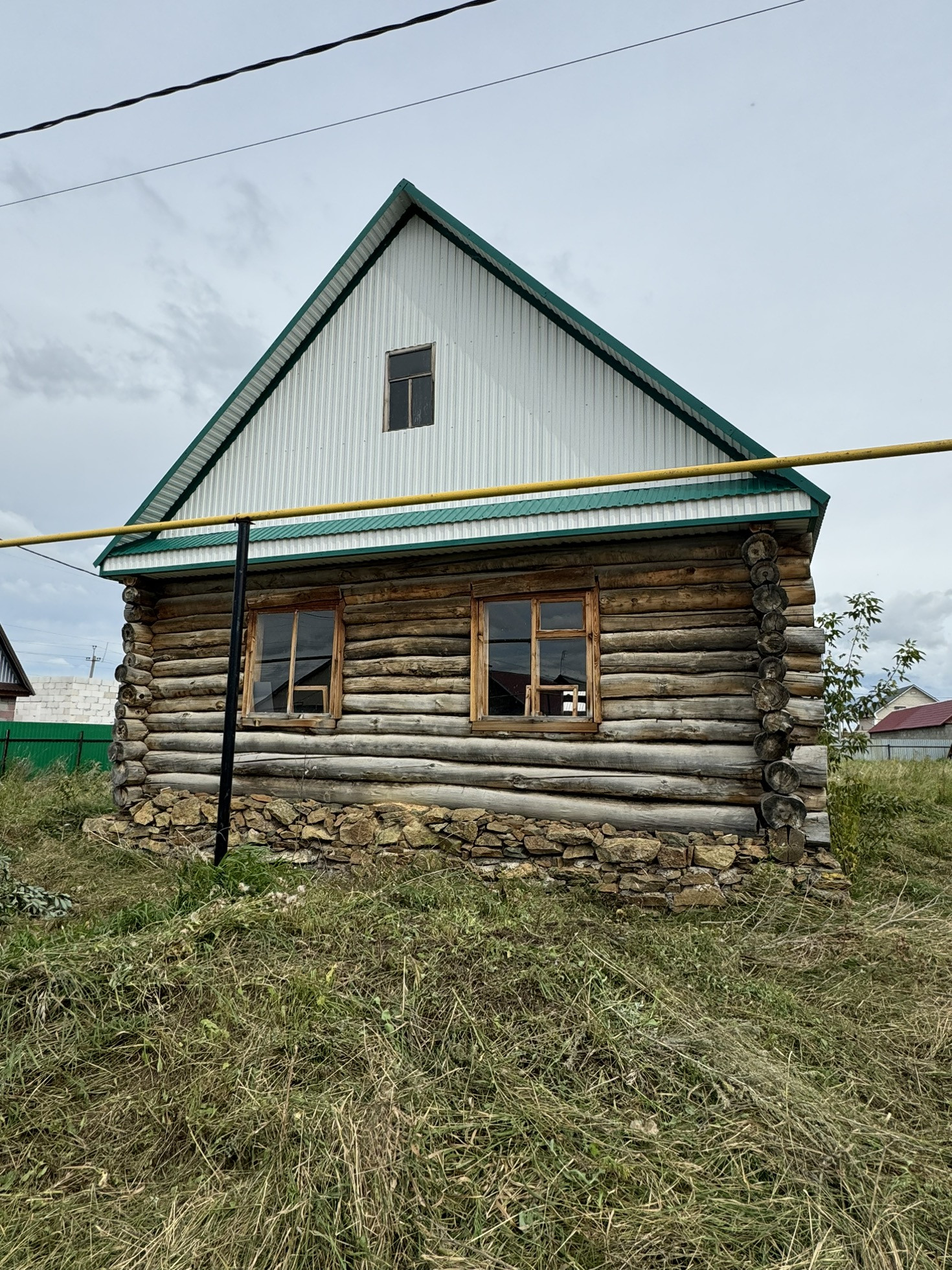 Бревенчатый дом. Установлены окна.