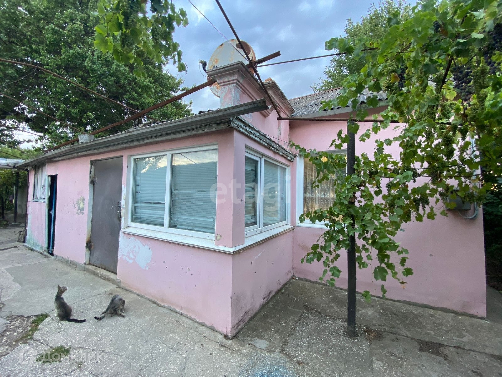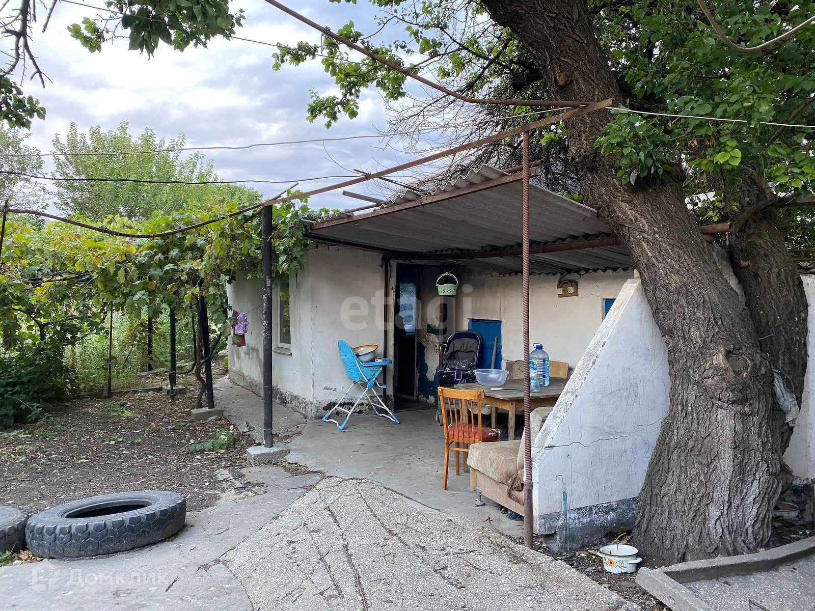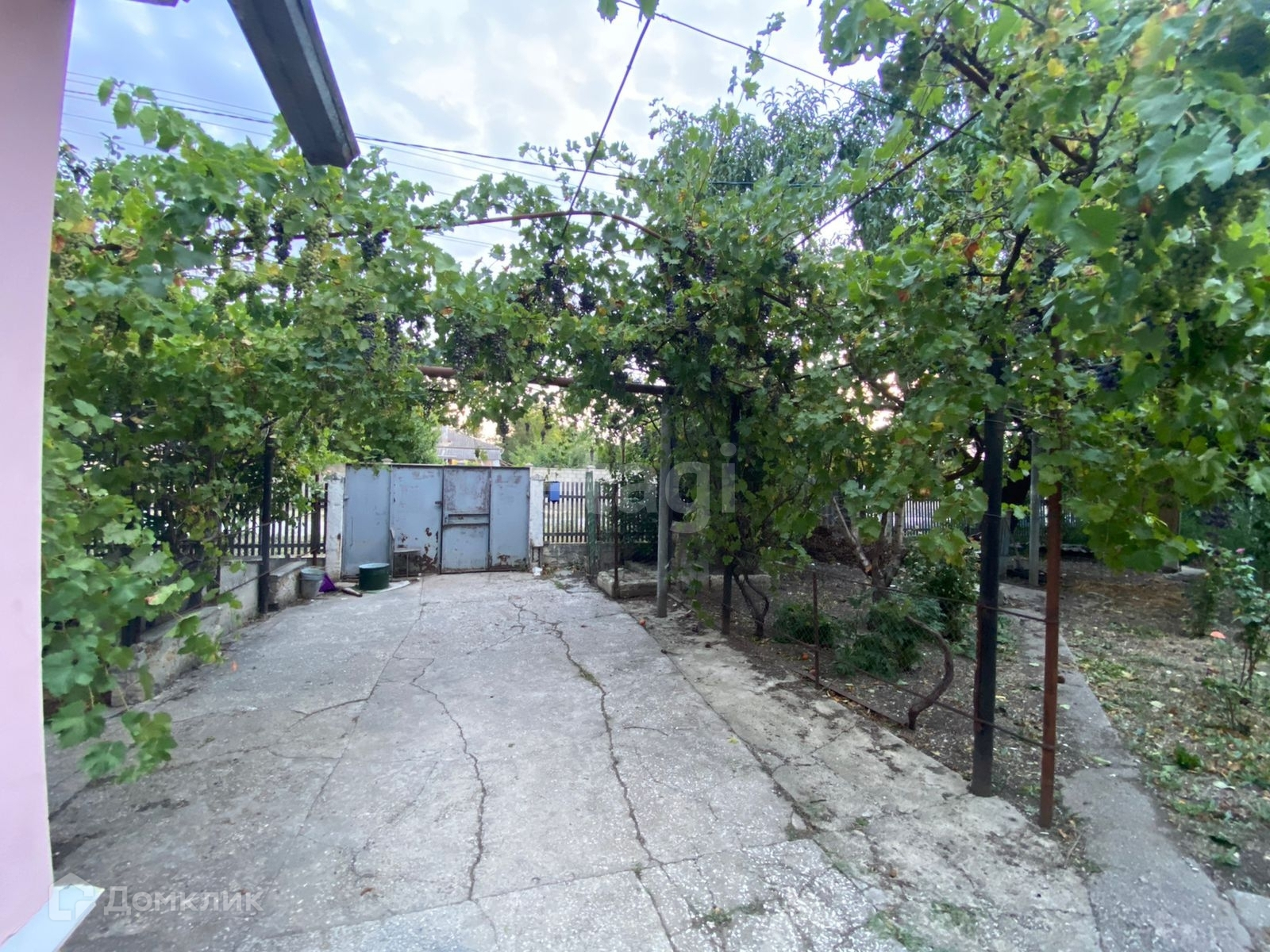 От дождя двор защищает виноградная лоза в виде навеса.
