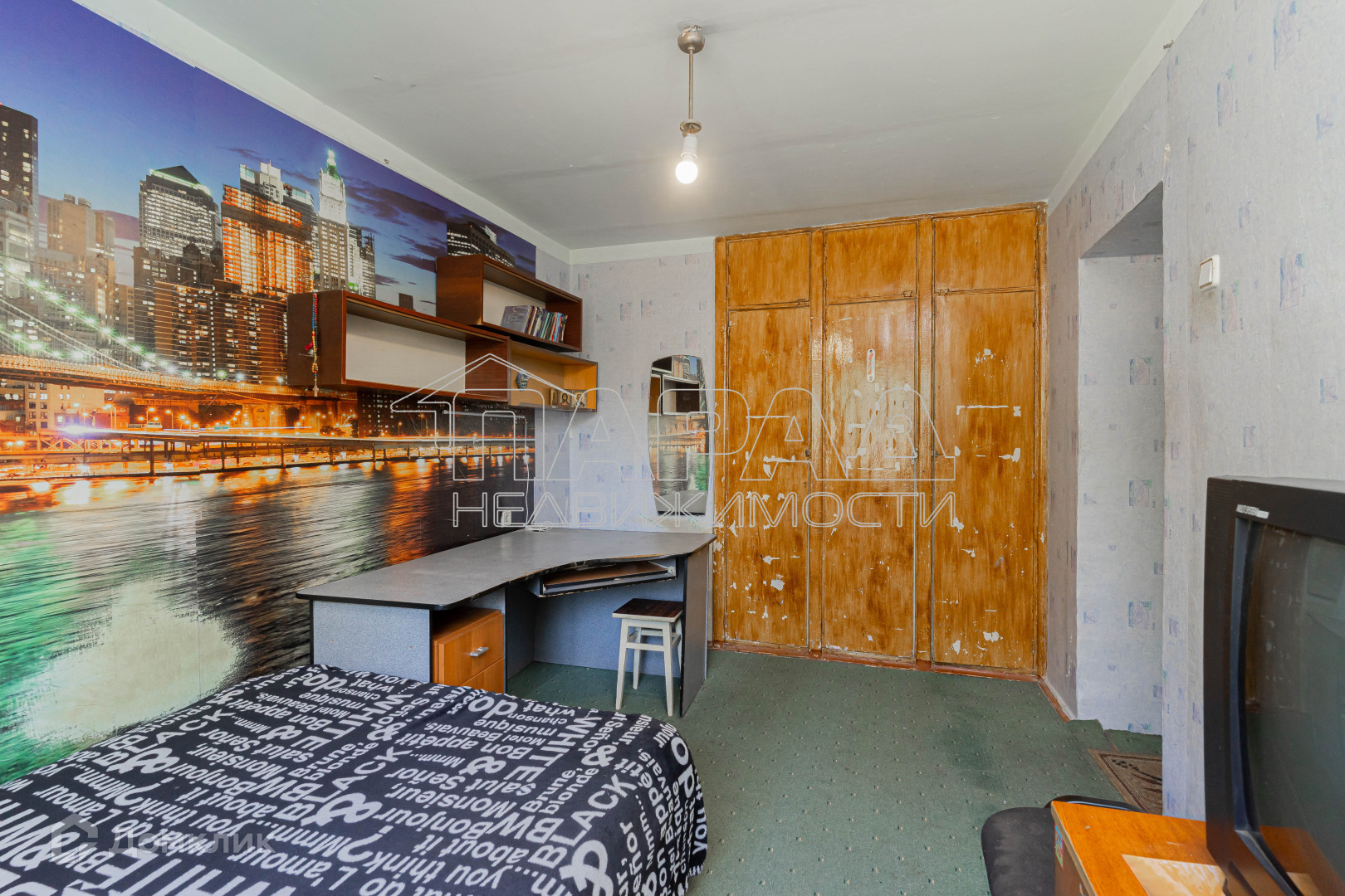 Остается: тумбочка с телевизором, письменный стол, стулья.