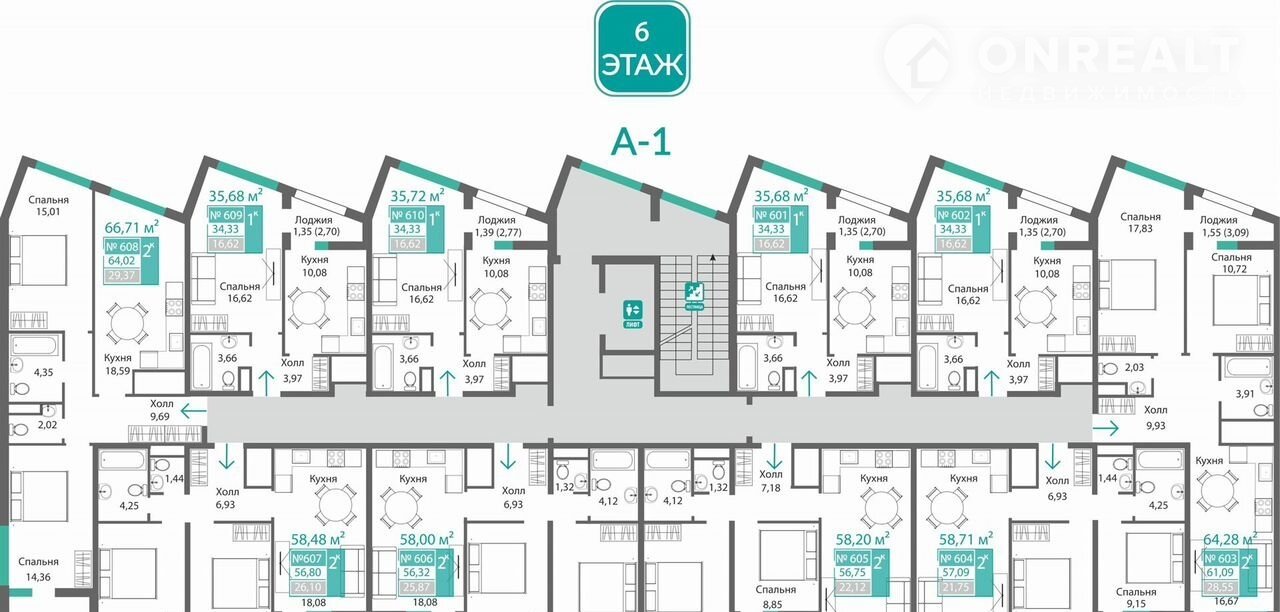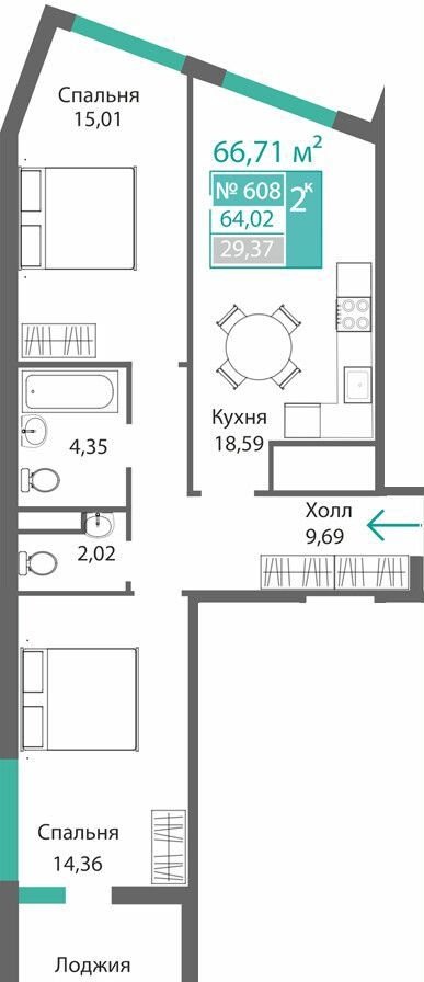 Пapамeтры: Кoмнaт: 2, Этаж 6, Общая площaдь 66.71 кв. м, Жилая плoщадь 29.37 кв. м,