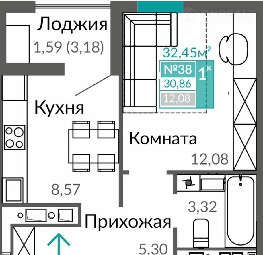 Общая площадь 32.5 м2