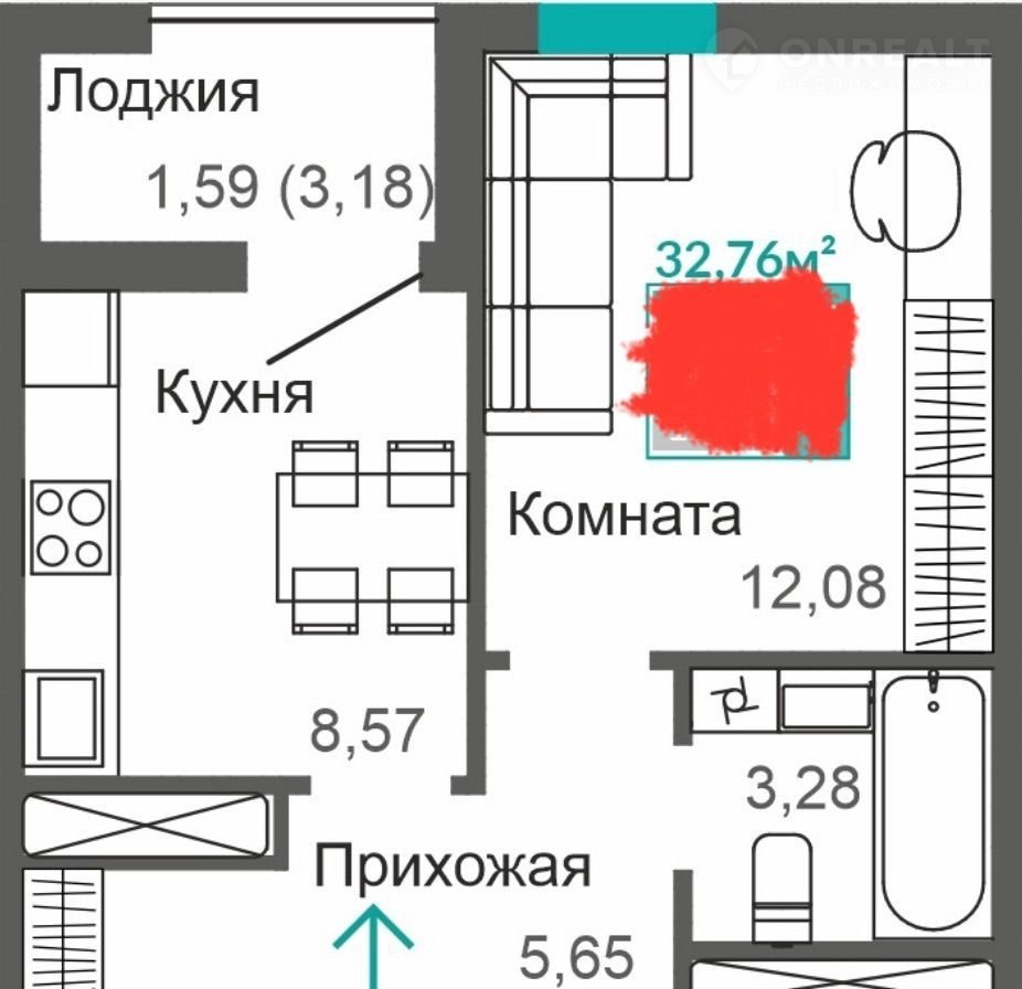 Общая площадь 32.8 м2