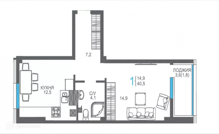 Общая площадь 40.5 м2