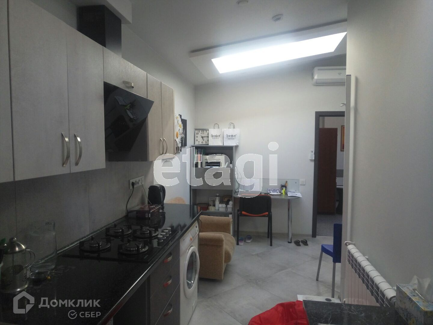 Есть своя оборудованная кухня, 2 санузла, система кондиционирования, охранная сигнализация,пожарная сигнализация,газ, вода, электричество. Счётчики на всё.