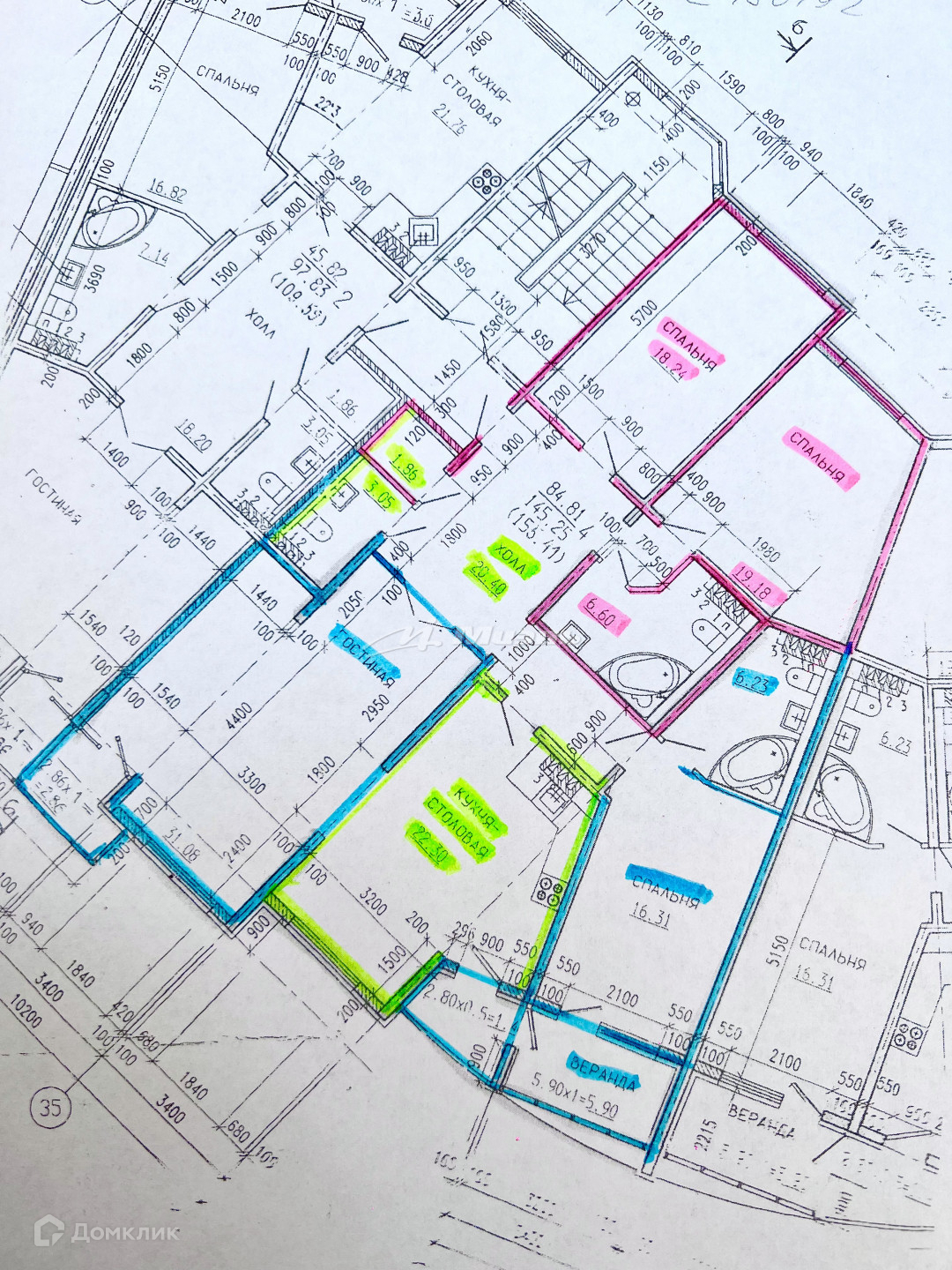(розовым на плане выделена наша часть, зеленым - общая, синим - второго собственника)