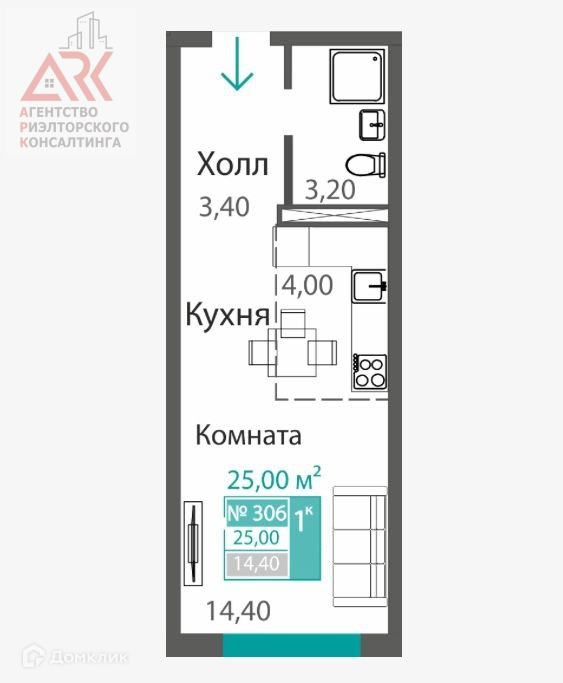 Общая площадь 24 кв. м., комната 14 кв. м.