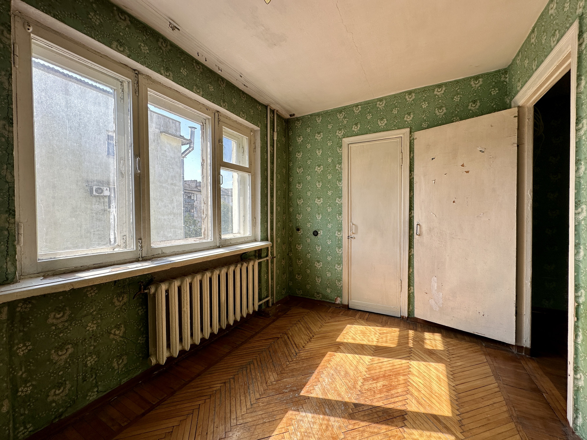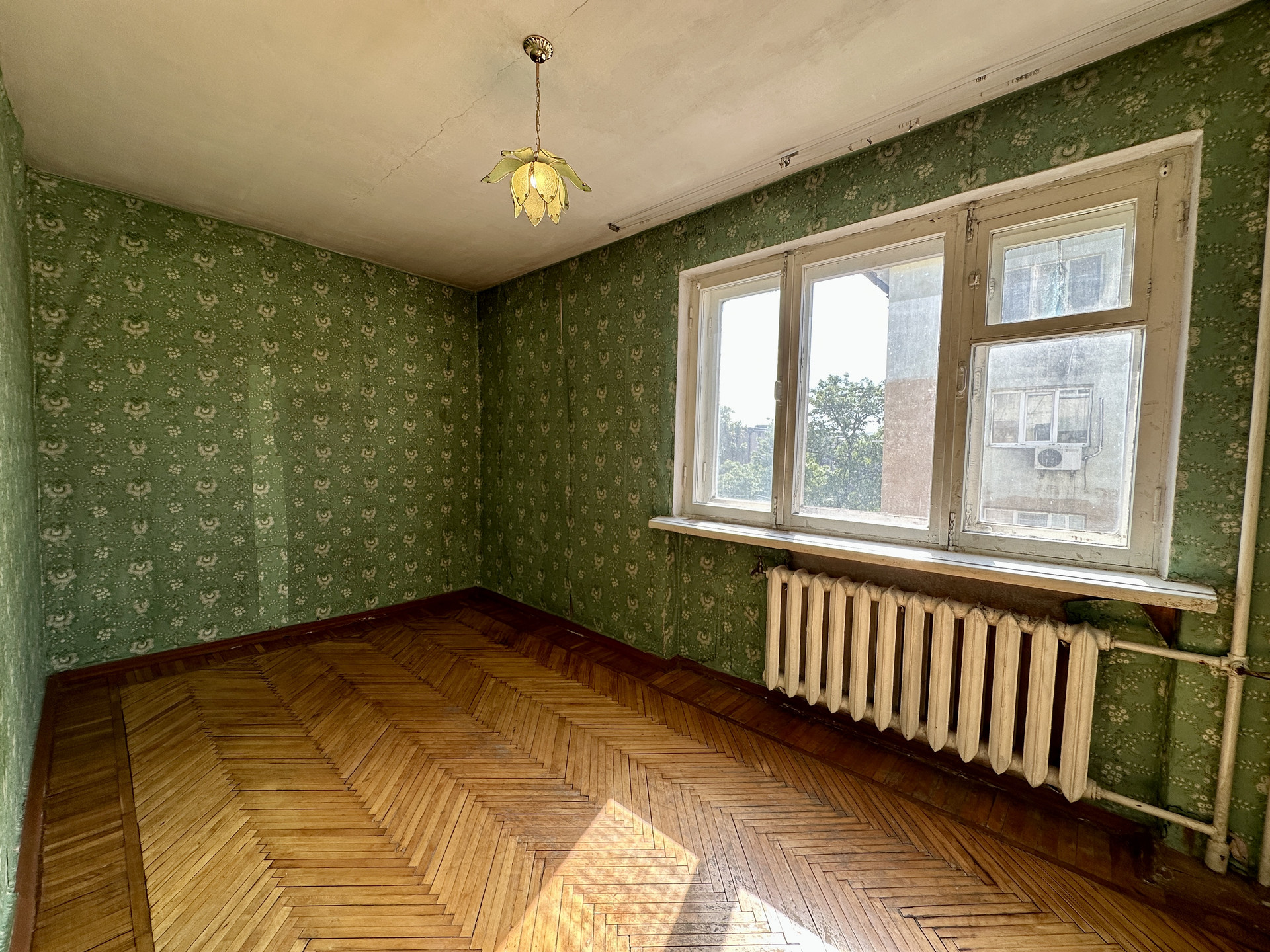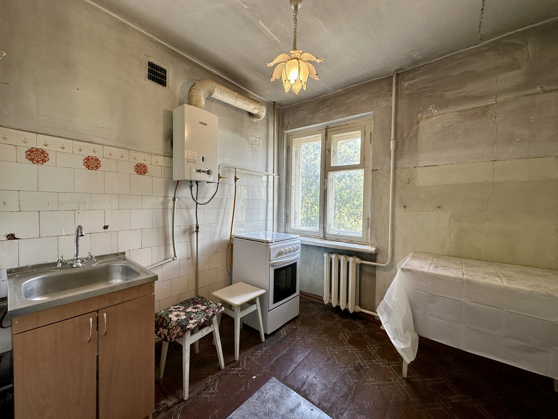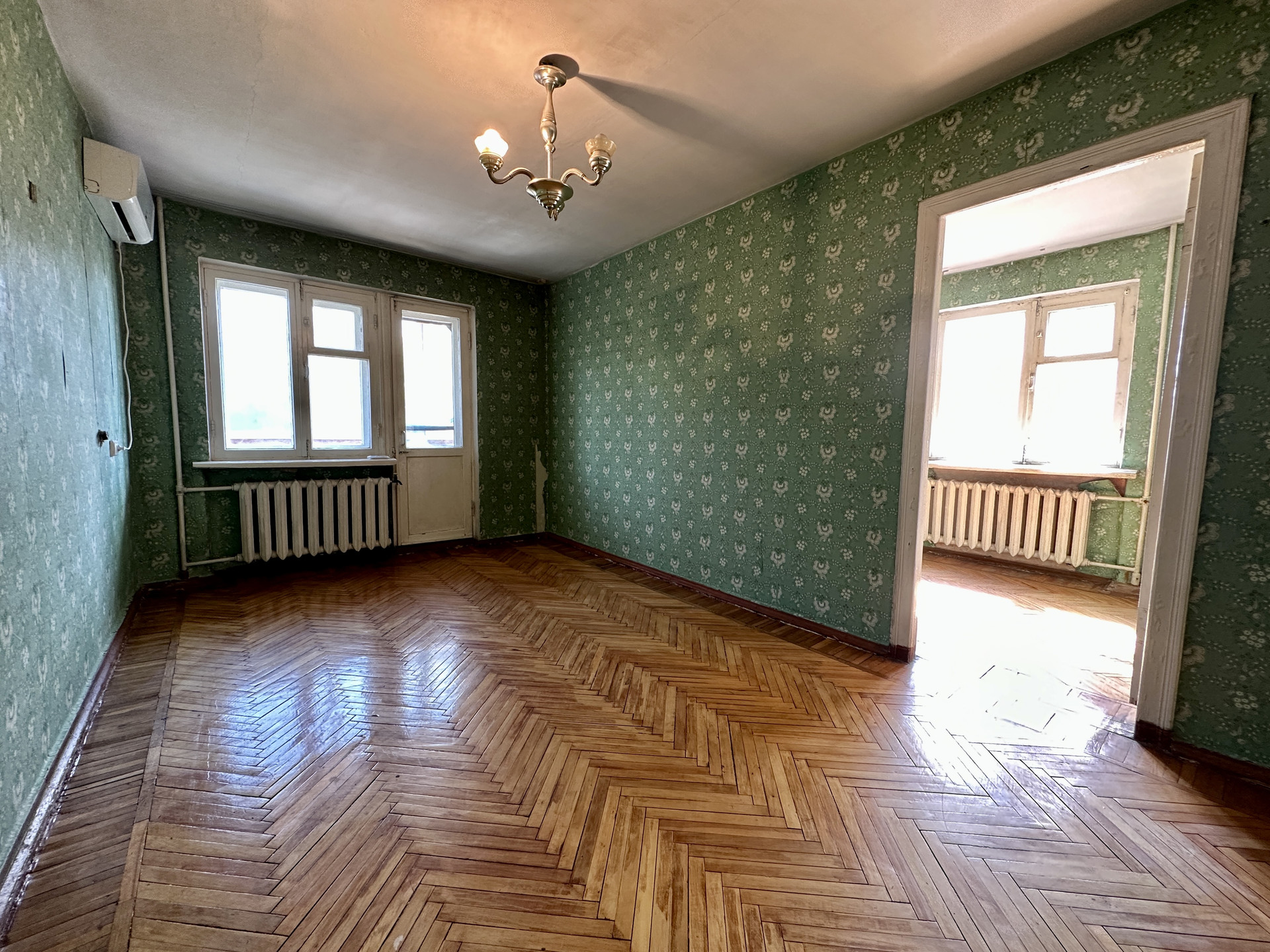 Квартира с советским ремонтом, в зале установлен кондиционер, в комнатах уложен дубовый паркет,  сан. узел в советском кафеле, в кухне установлена современная газовая колонка Bosh, на балконе установлены металлопластиковые окна, вся инженерика работает, если быть не привередливым то можно зайти и жить.