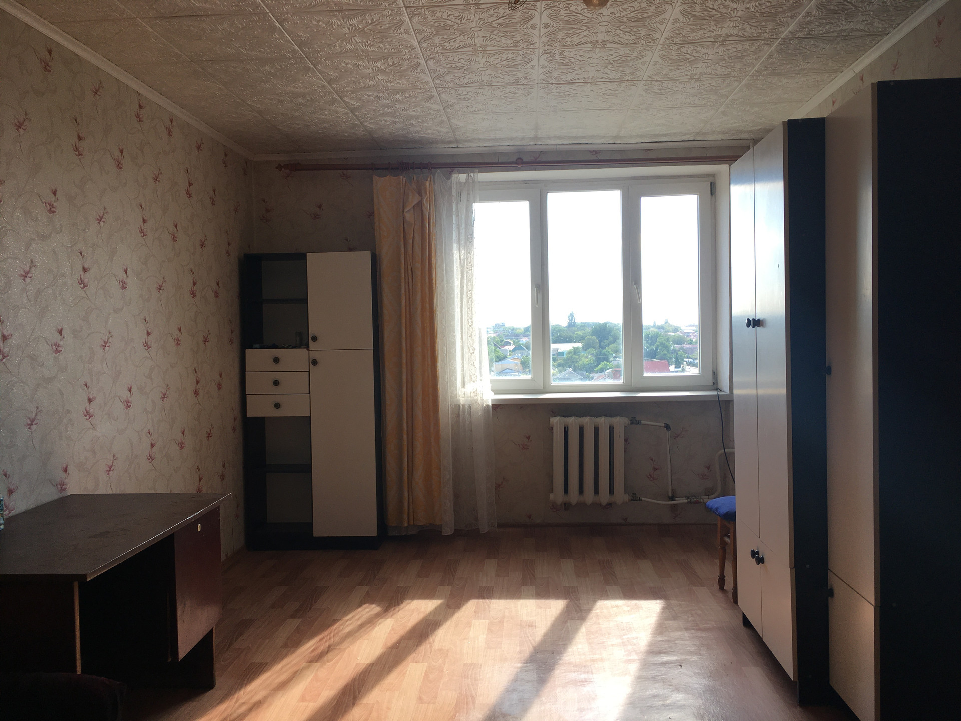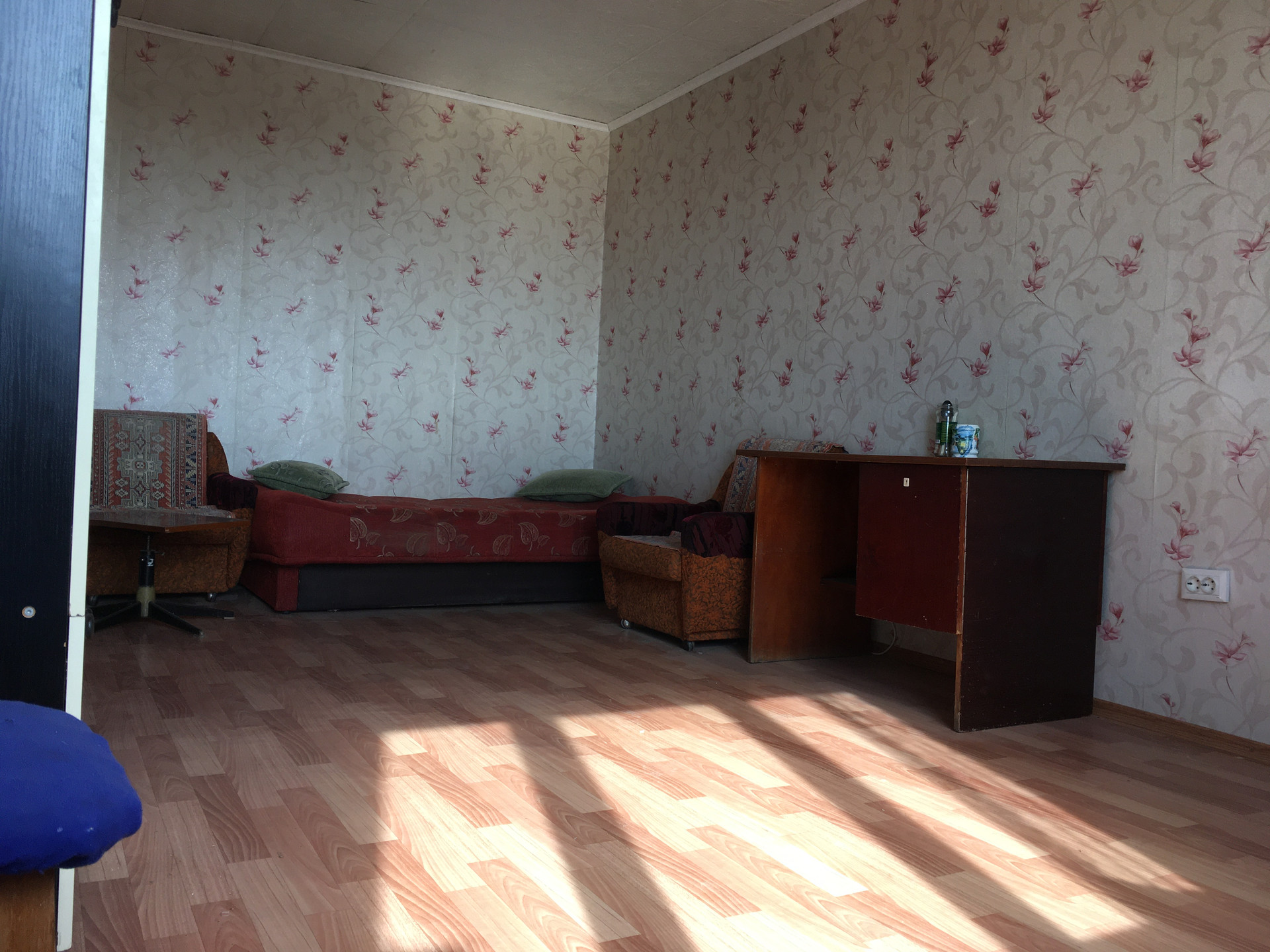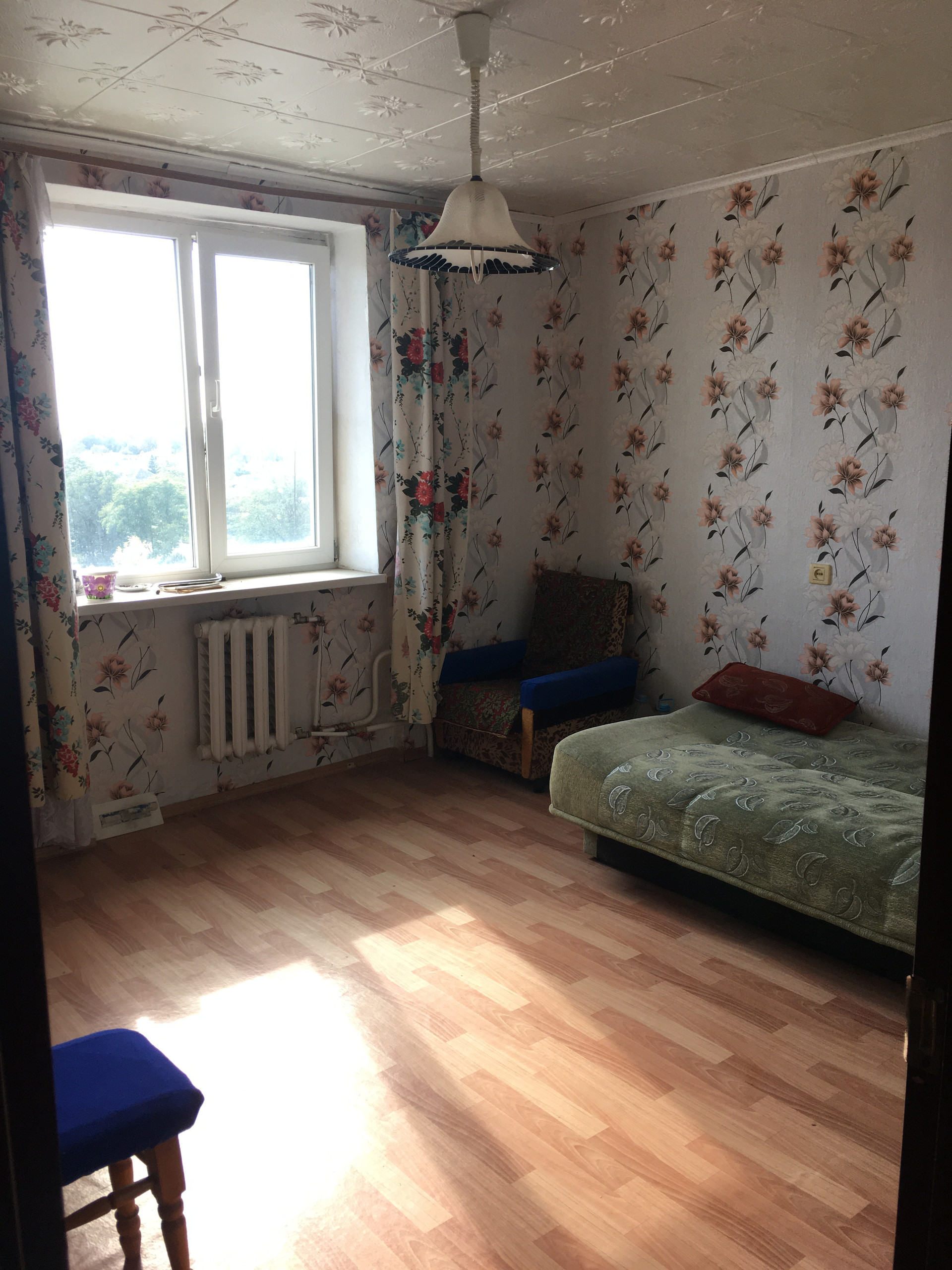 В каждой комнате есть раскладной диван, шкаф, и просторное окно.