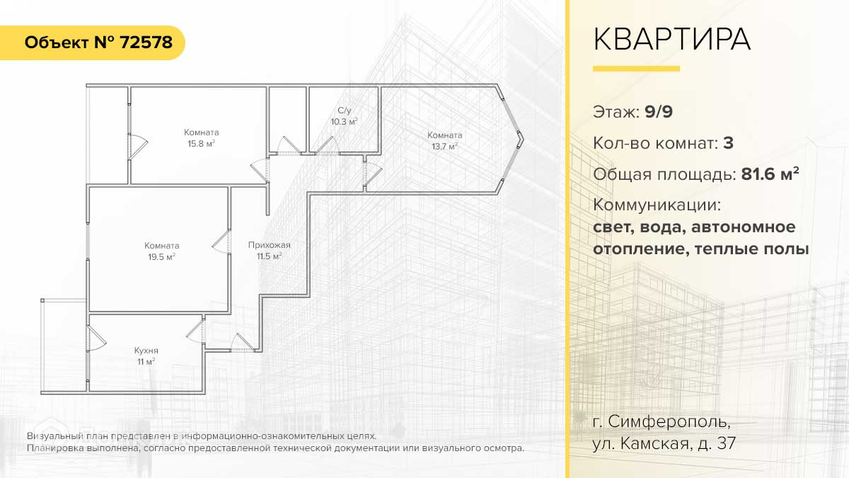 Находится на 9 этаже 9-этажного дома. Общая площадь 81,6 м2.