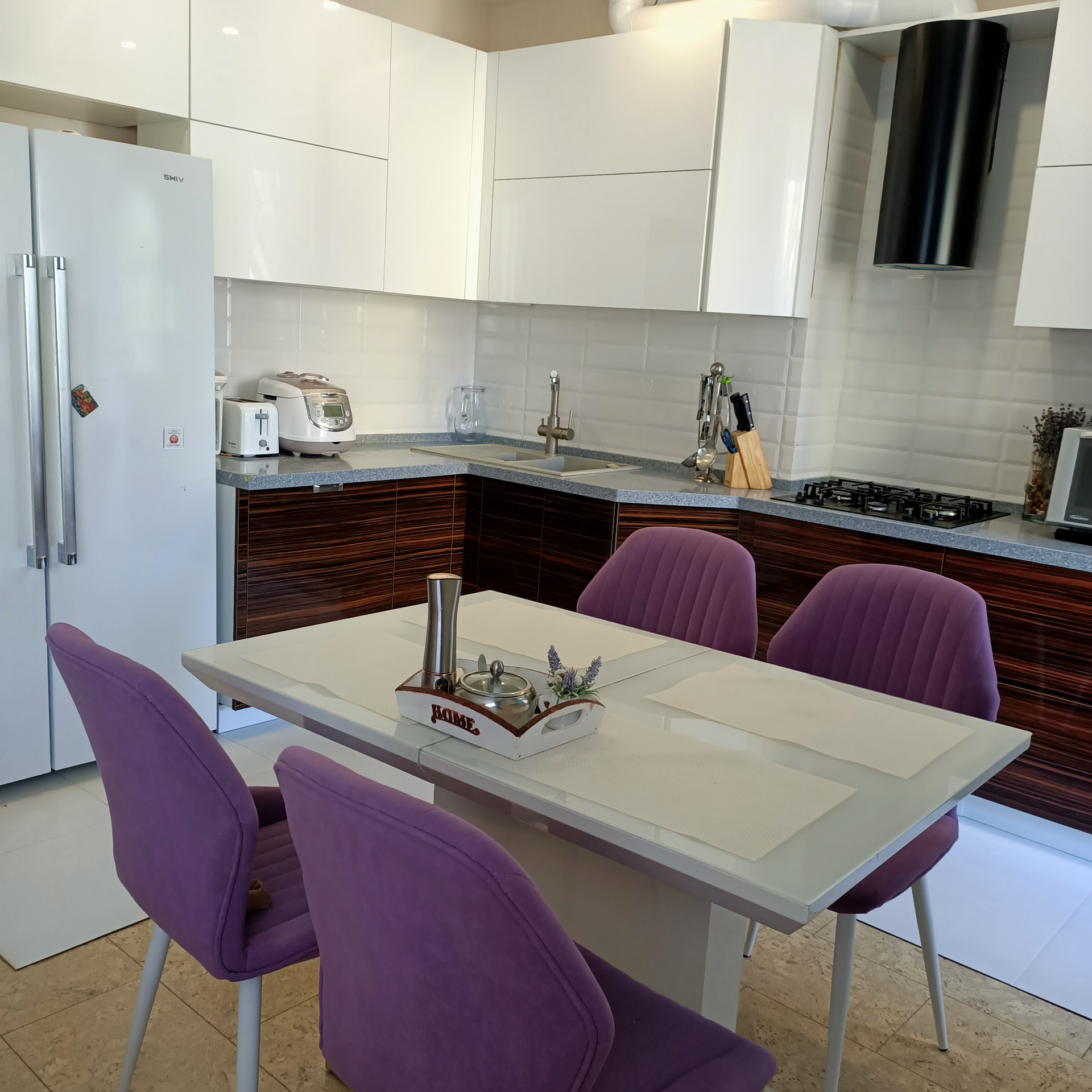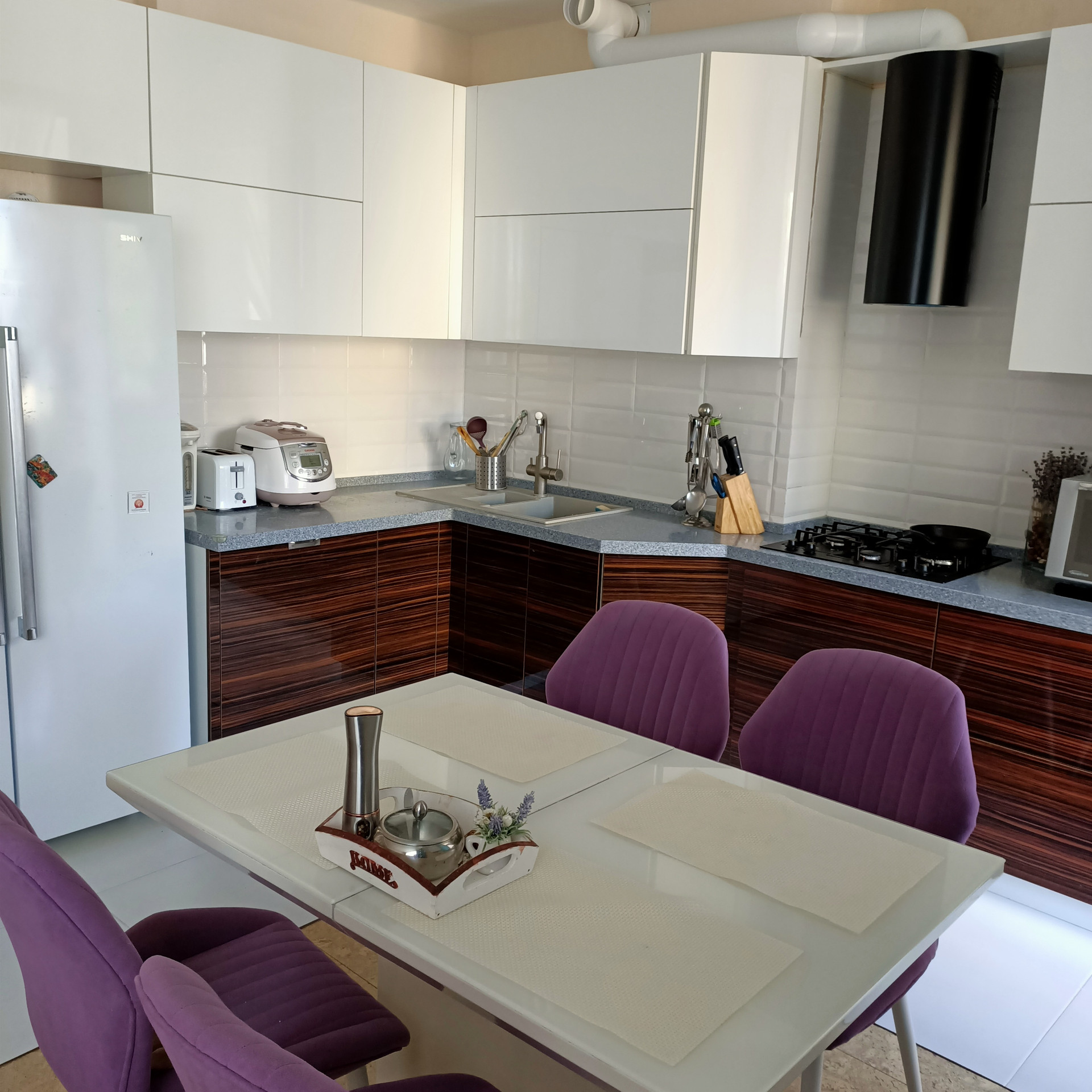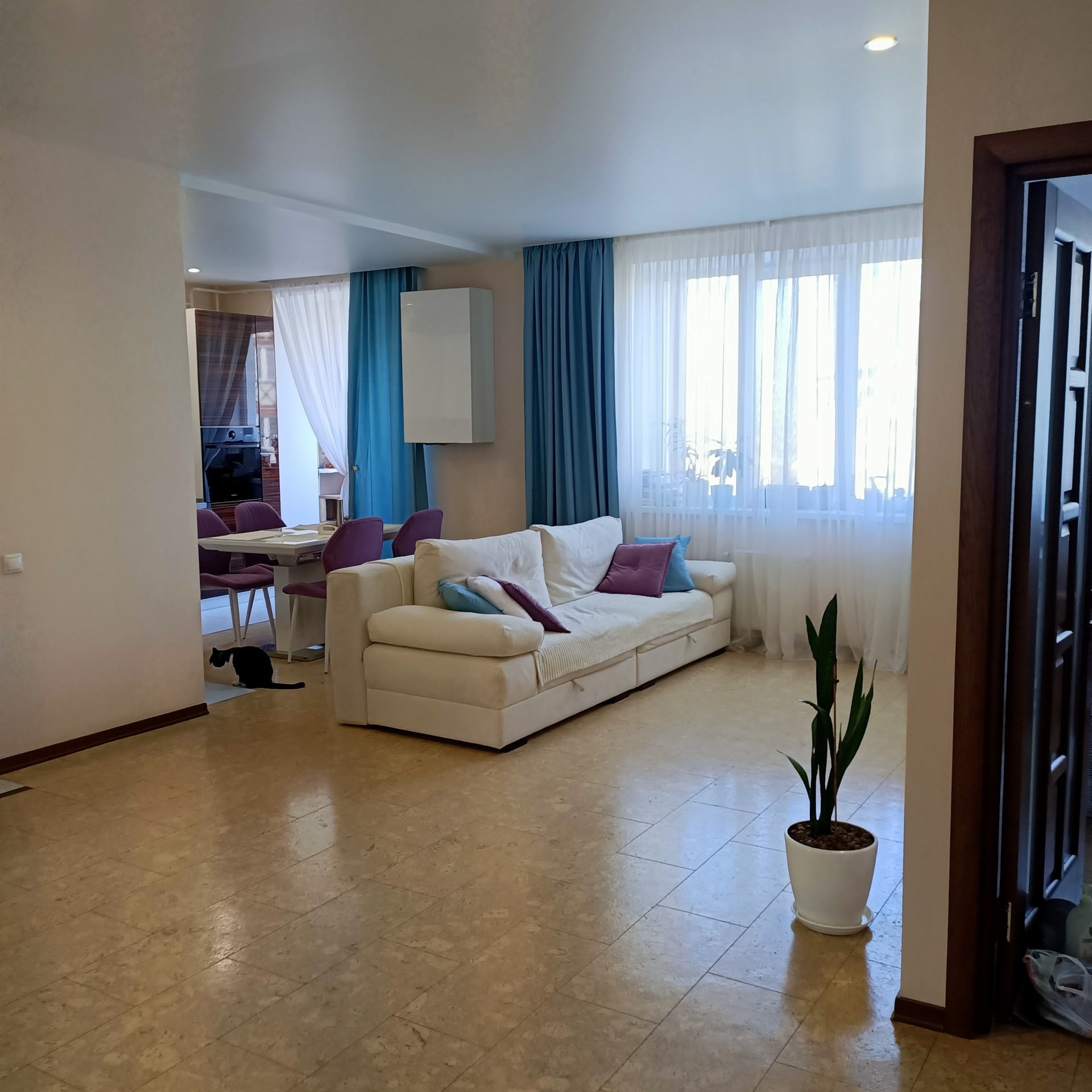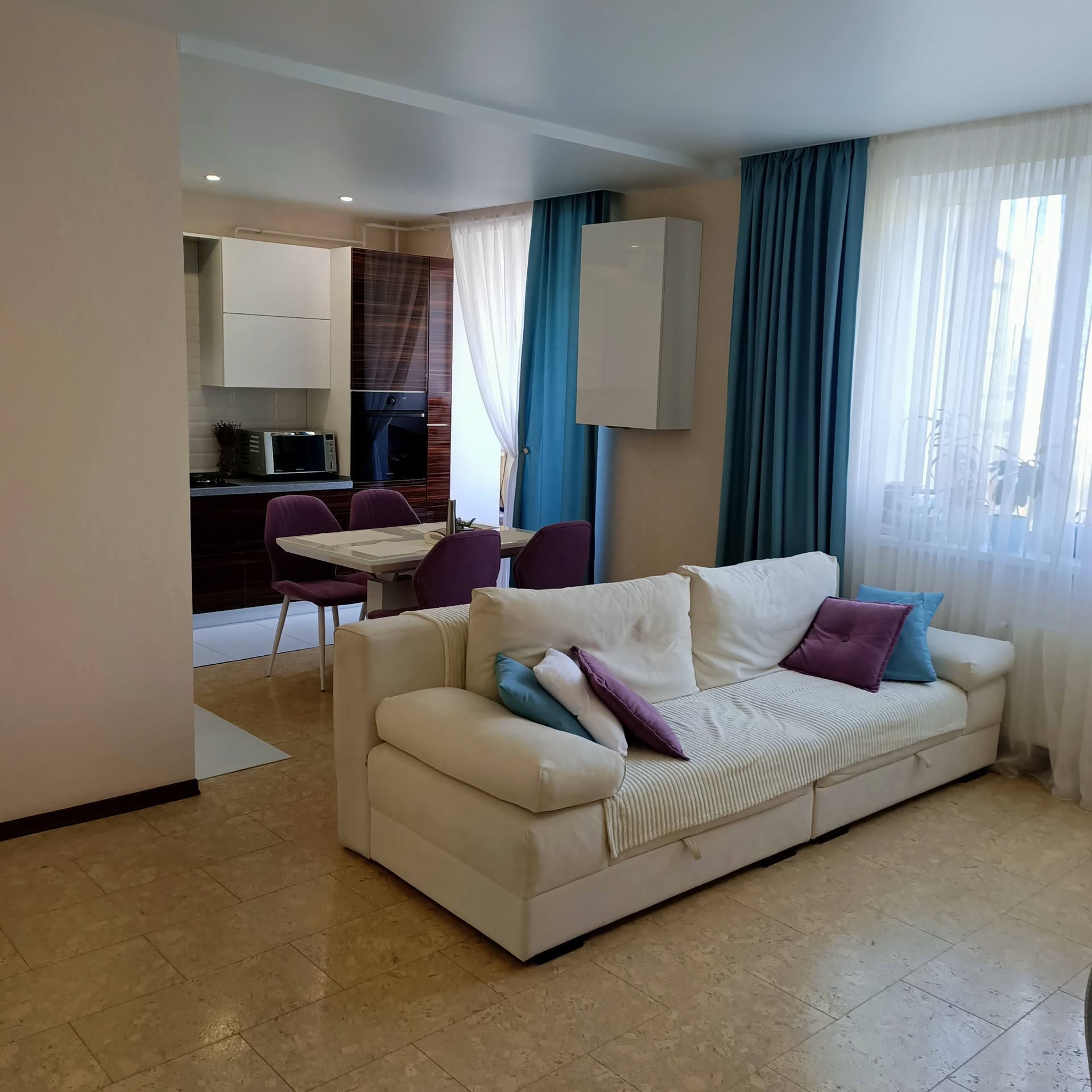 Комплекс находится в самом чистом районе города, в окружении леса. Дом построен из природного альминского блока, поэтому в квартире зимой тепло, а летом не жарко. Автономное отопление. Два санузла, один из них совмещённый в котором инсталляция и дорогая сантехника.Второй санузел без ремонта, установлена инсталляция, закуплена кафельная плитка. Кухня- фасады МДФ , столешница из камня. Встроенная техника. Во всей квартире на полу пробковое покрытие. По своим свойствам теплая и приятная для хождения босиком.