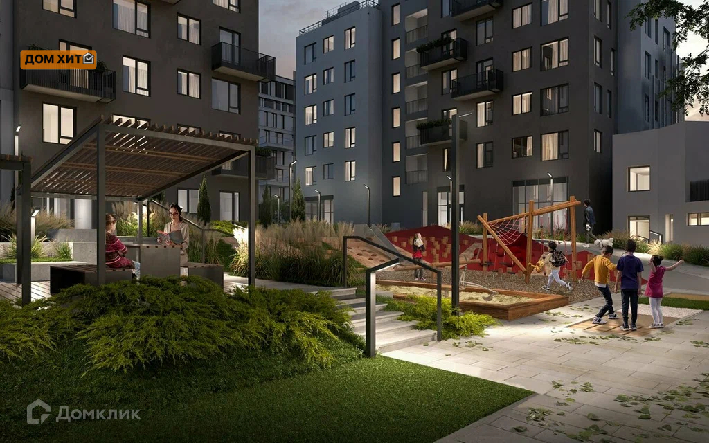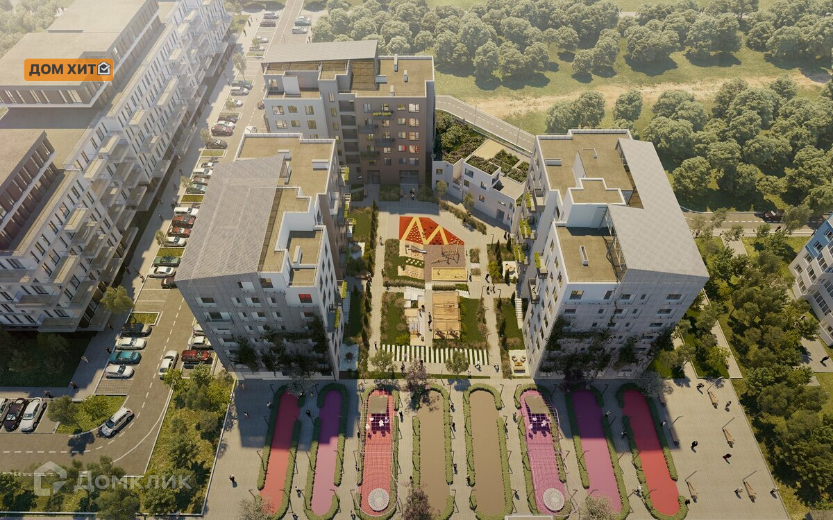 Для детей обустроены современные площадки с необычными архитектурными формами, песочницей, спортивной зоной и зоной развития креативного мышления. Для удобства жильцов организованы питьевые фонтаны во дворе, велопарковки у входов, зоны мойки для домашних питомцев.