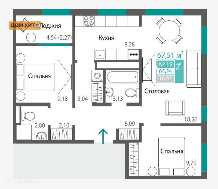 В продаже шикарная двухкомнатная квартира 65.24 м².